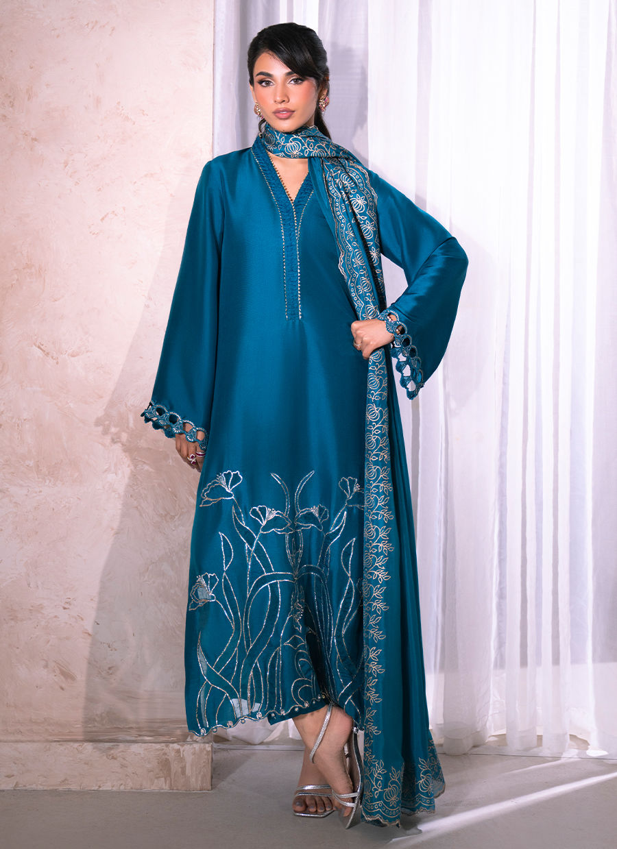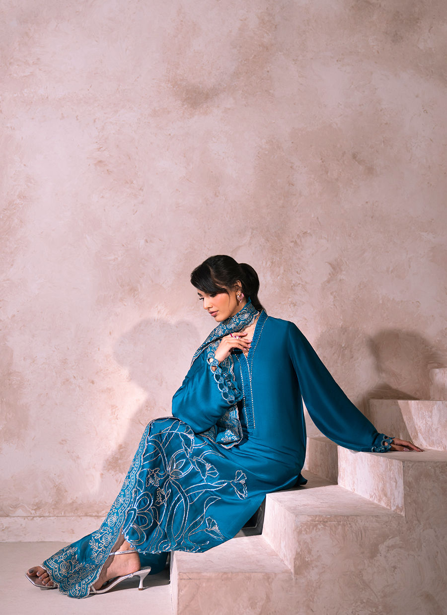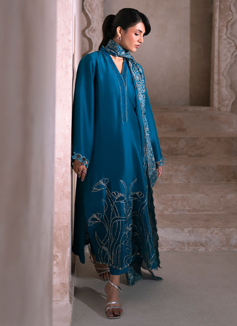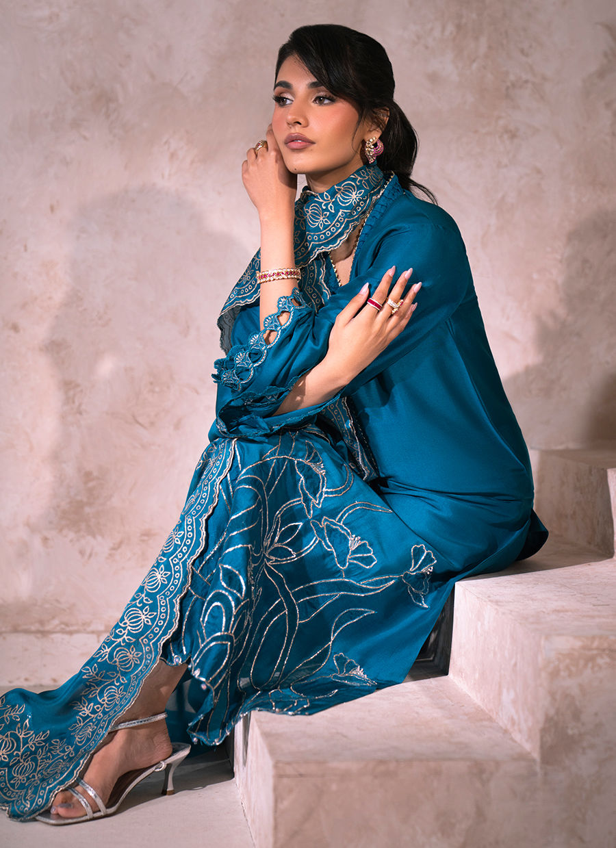 A refined expression of modern luxury, this tropical blue silk ensemble is designed with timeless elegance. The long silk shirt features a graceful V band neckline, finished with a golden edging that adds a refined accent. The sleeves are delicately detailed with cutwork, enhanced with fine golden pitta work outlining for an artisanal touch. The shirt hem is adorned with intricate organza appliqué cutwork, beautifully enhanced with rich golden pitta embroidery and scalloped edges, creating a statement finish. Paired with a coordinated silk trouser, the ensemble is completed with a luxurious silk dupatta featuring rich golden block printing, lending depth, heritage, and sophistication to the overall look. A distinguished creation crafted for those who appreciate understated luxury and meticulous craftsmanship.