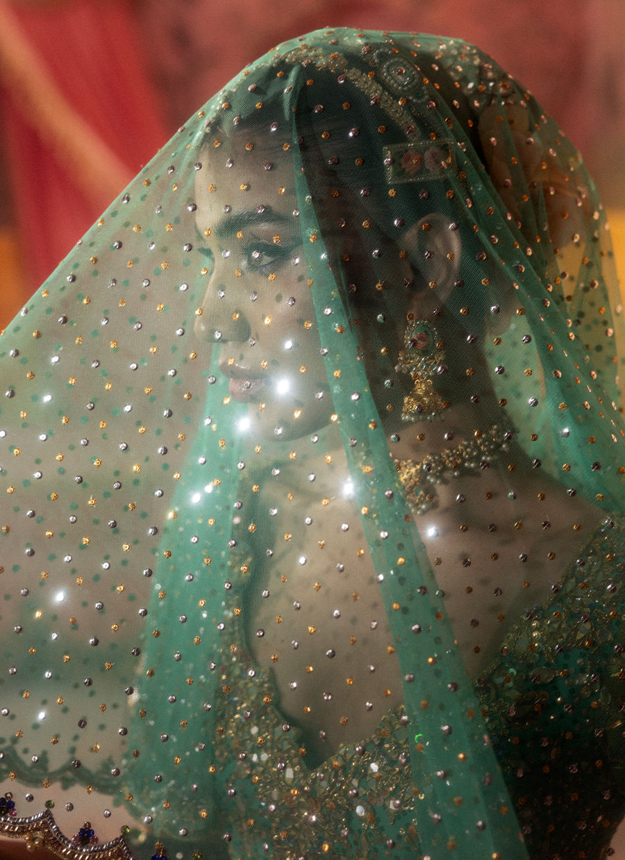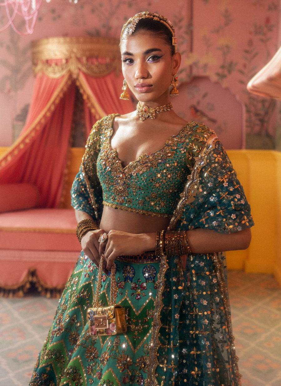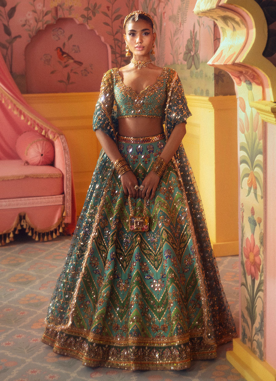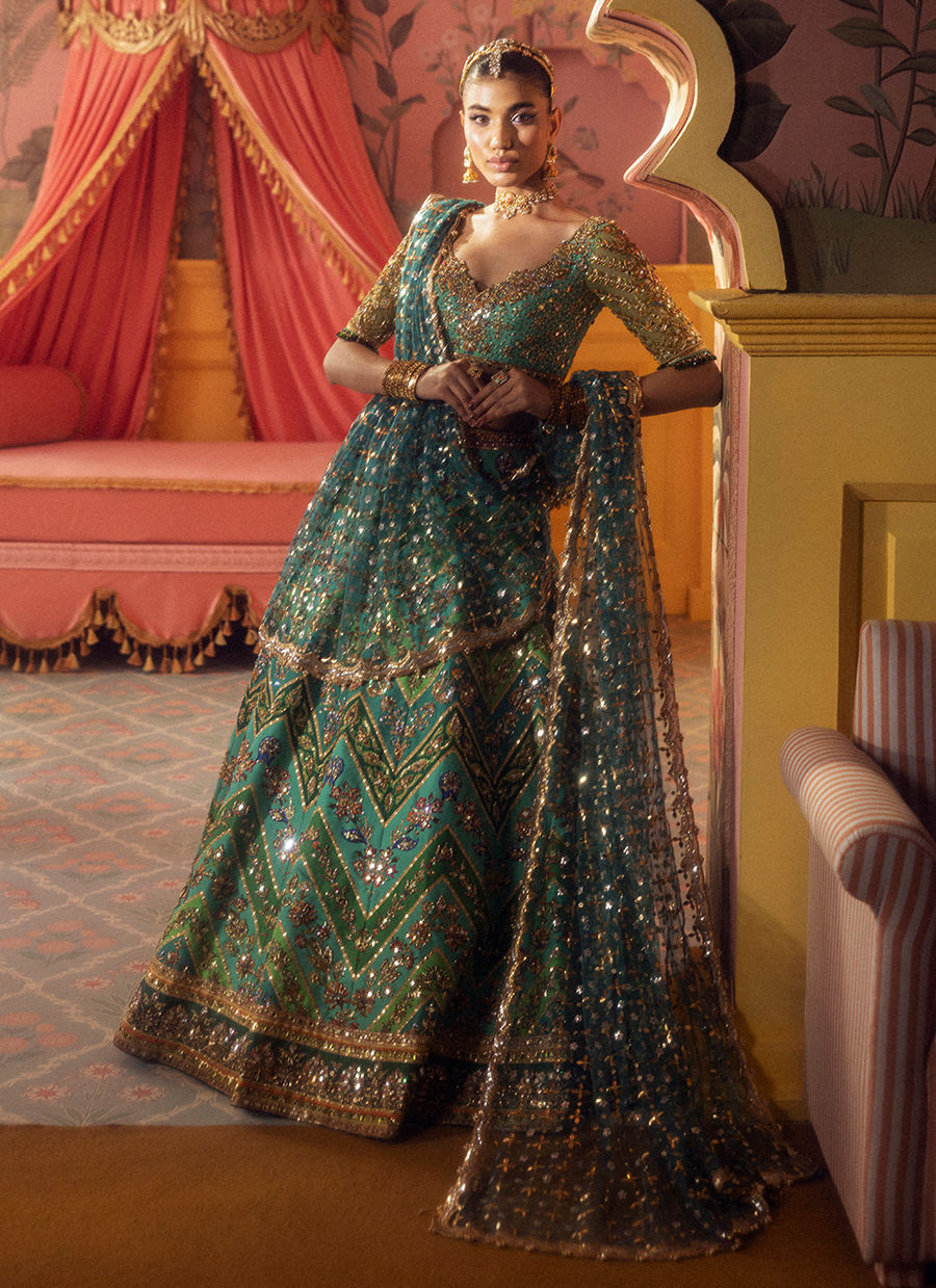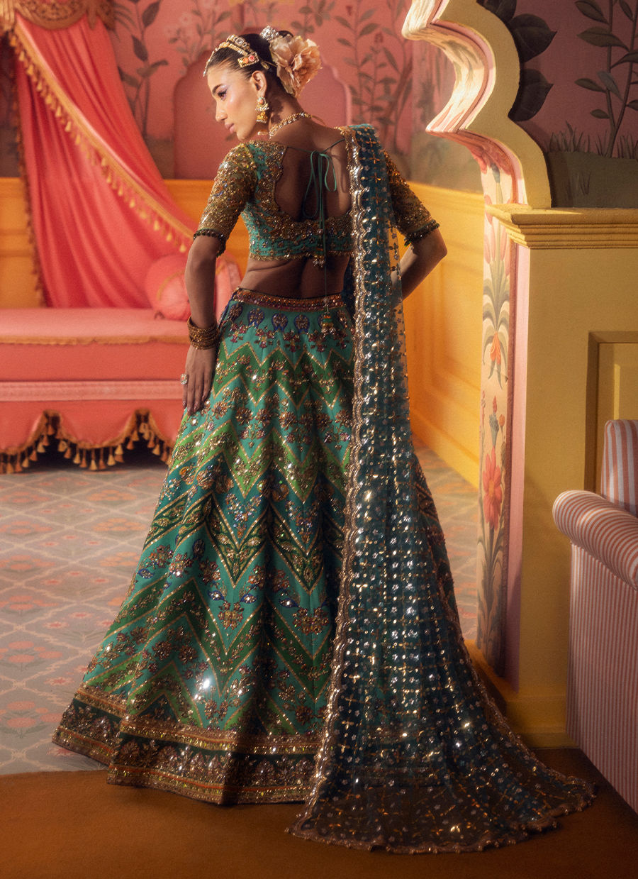 This lehenga features a striking chevron pattern with gold detailing, a sweetheart neckline blouse that is adorned with rich gold mirror, tilla and sequin details. The striking turquoise dupatta completes this glamorous outfit.