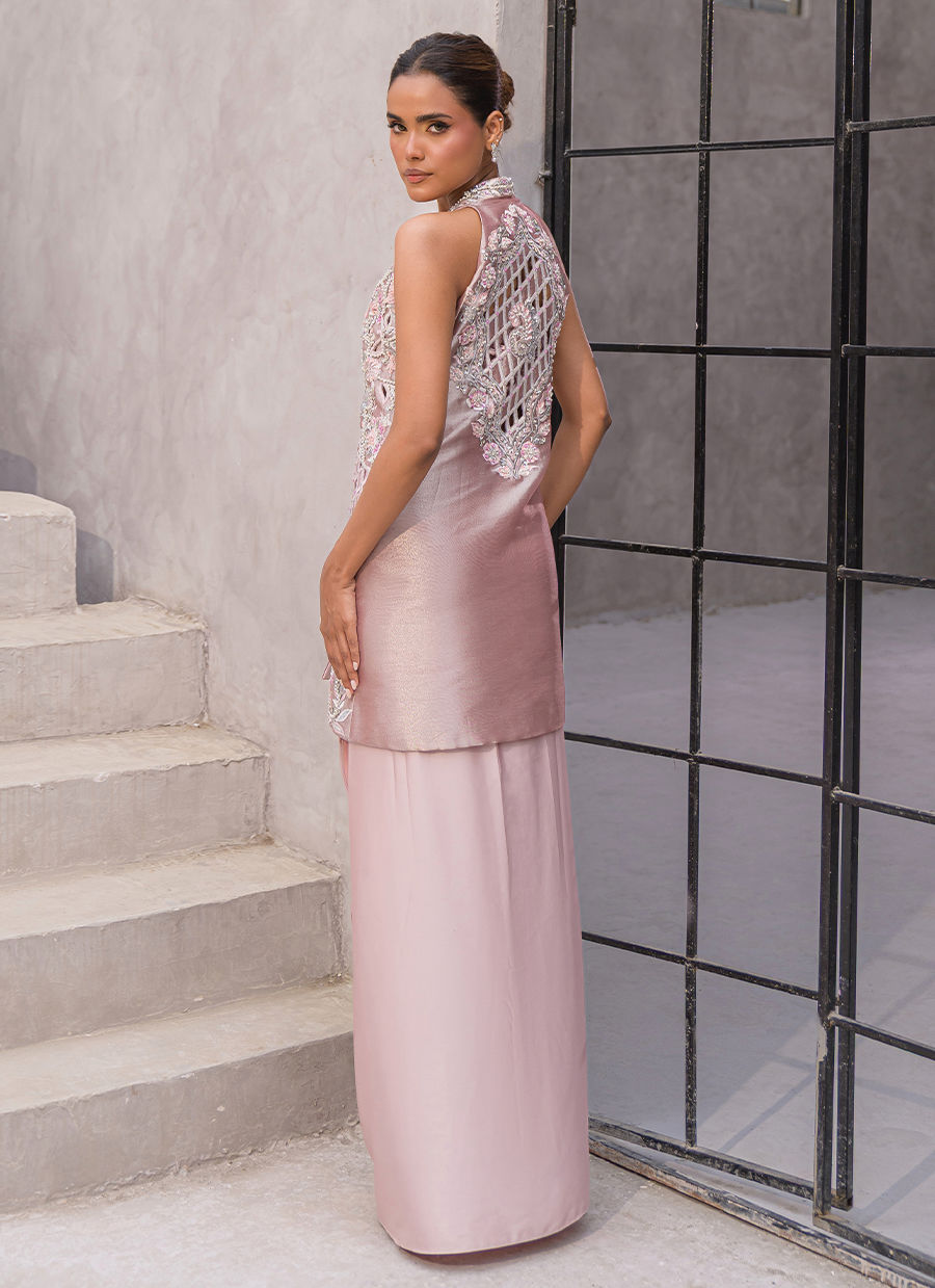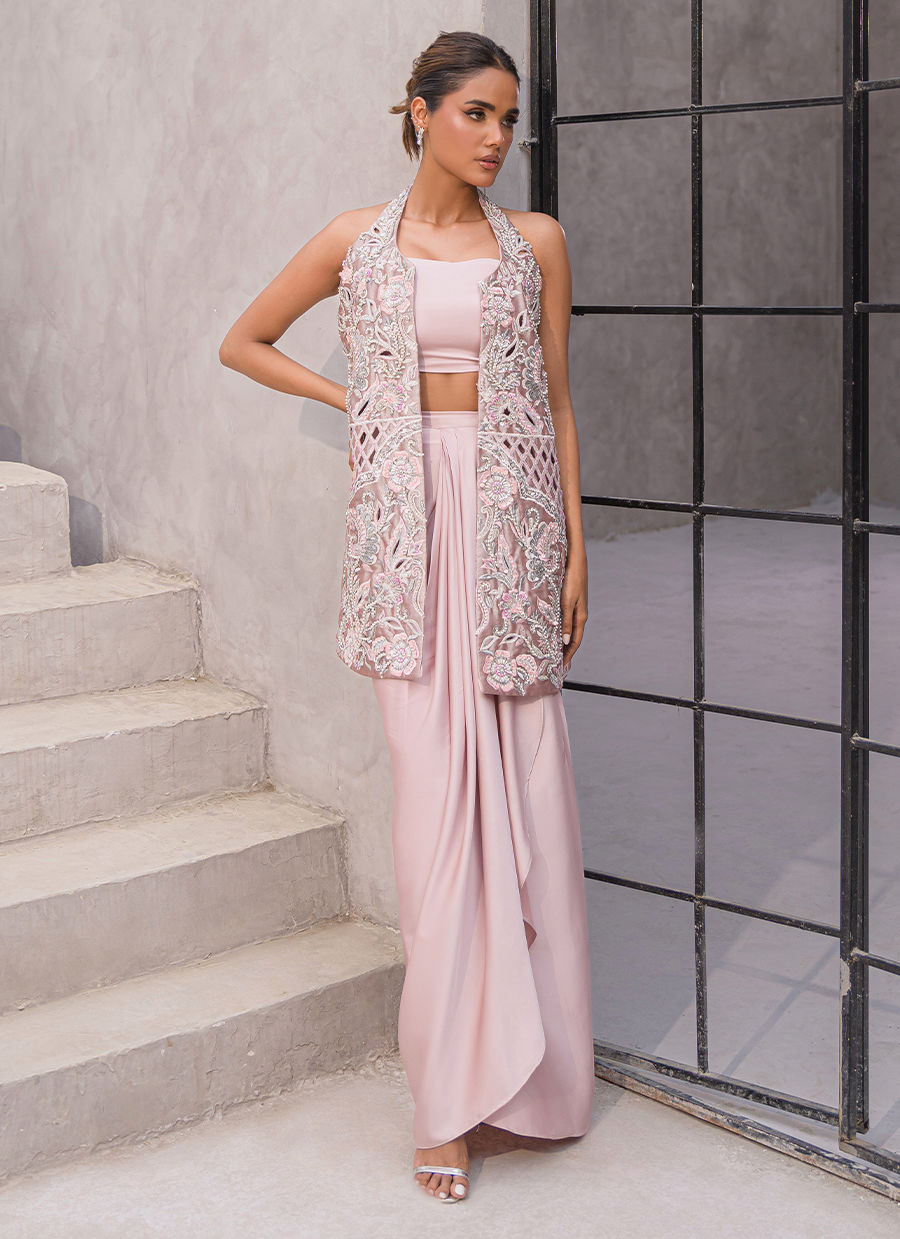 This ensemble presents a contemporary yet graceful take on eastern wear. The halter-style jacket is richly adorned with delicate thread embroidery and sequins, forming floral and lattice-inspired motifs. The pastel palette of soft pinks and silvers lends a dreamyelegance.Paired with sleek draped silk pants, this design strikes a balance between tradition and modernity. Seashell pearl is a refined choice for women who value sophistication with a touch of individuality.