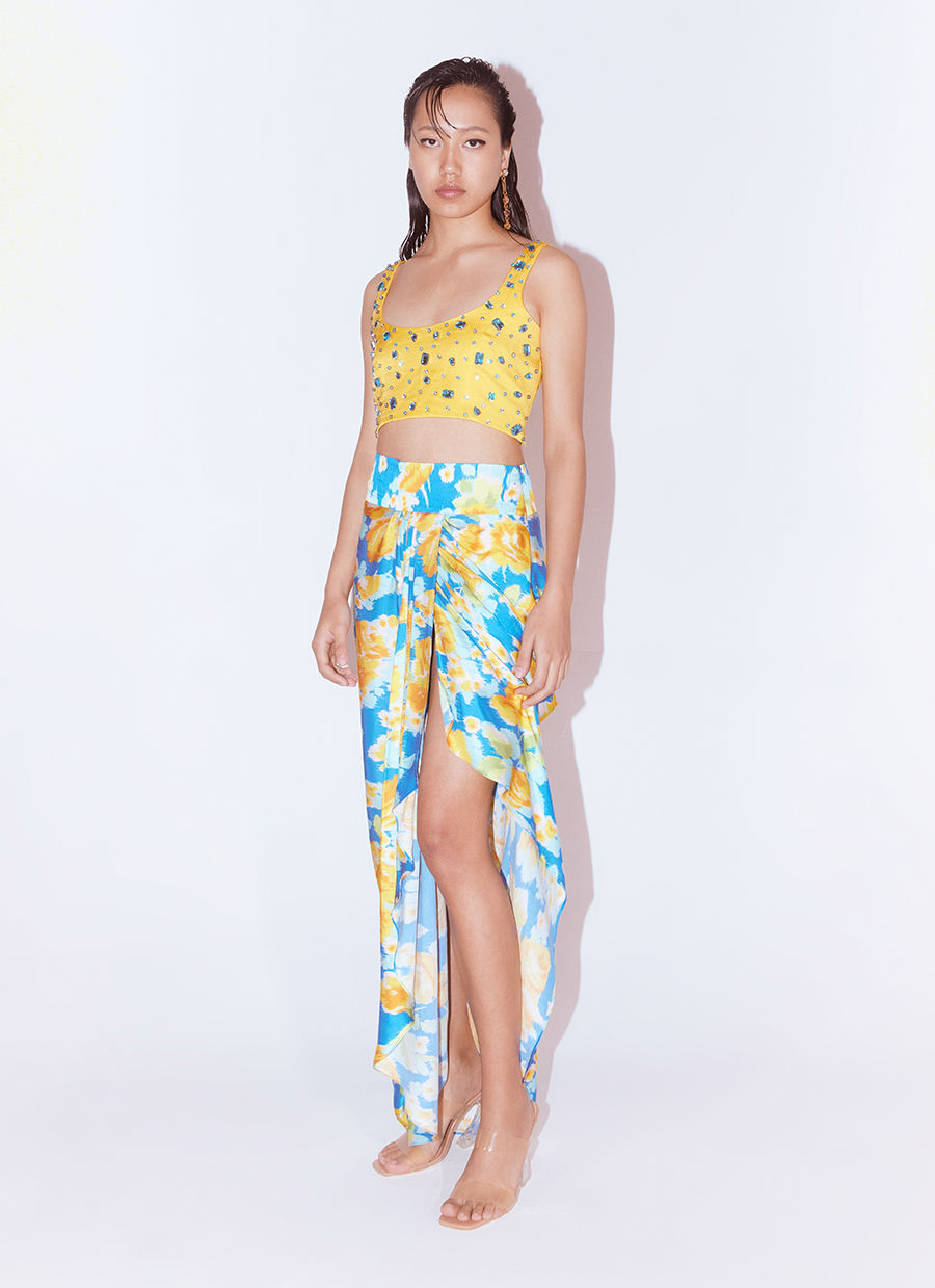 The Seashells Swarovski Blouse and Marigold Draped Skirt Co-ord crafted from our stunning Vegan Silk fabrication has Swarovski Embroidery resembling different shaped seas shells on a shore. Made in our stunning Marigold print, this is a trend setting piece. Featuring a Crop Top like blouse hand embroidered, sleeveless , this piece is versatile and easy to wear. The skirt has a side zipper. It can also be paired with our Marigold Organza Cape for a Indo-western look. Pair it with heels for an elegant look.