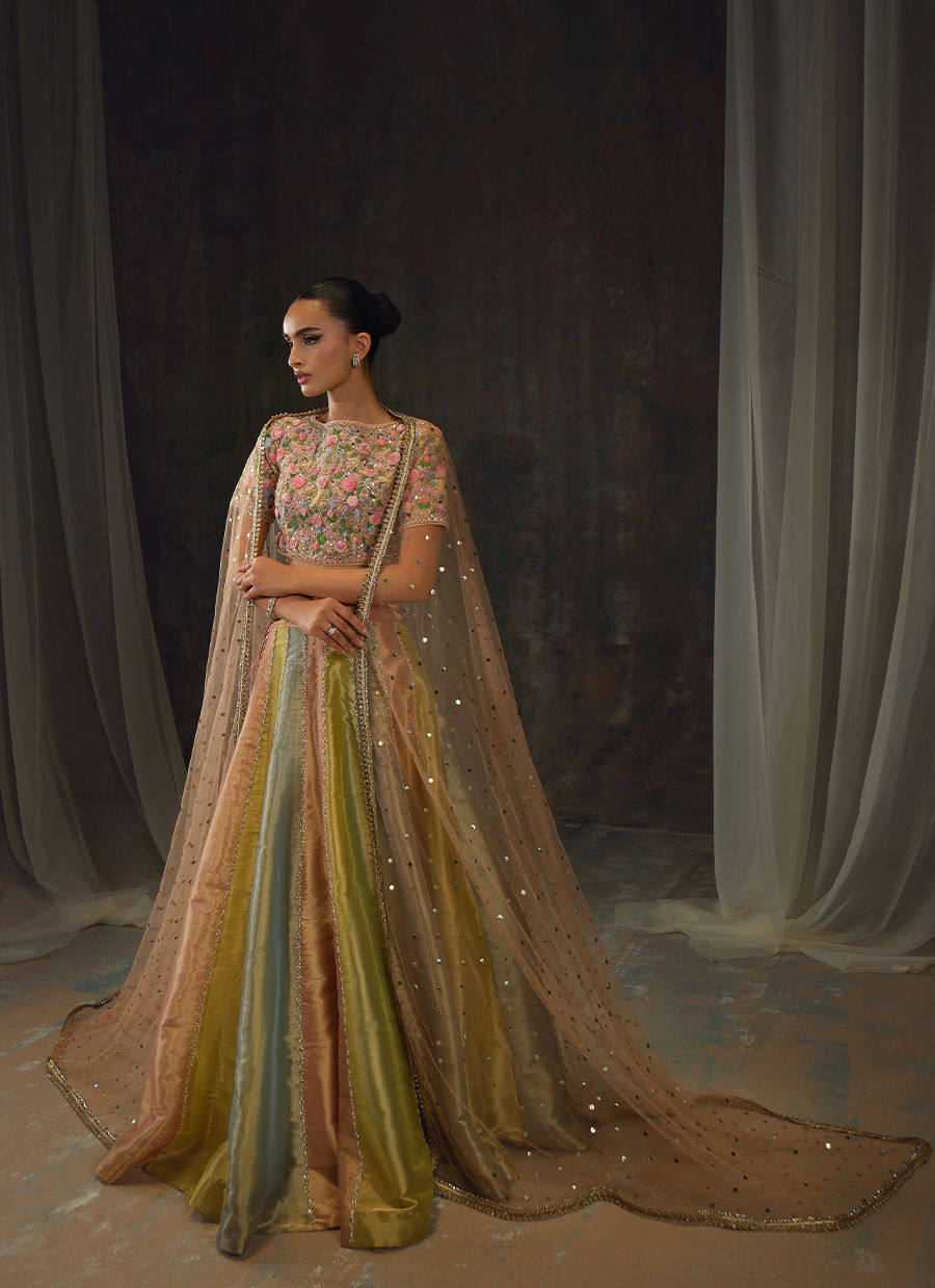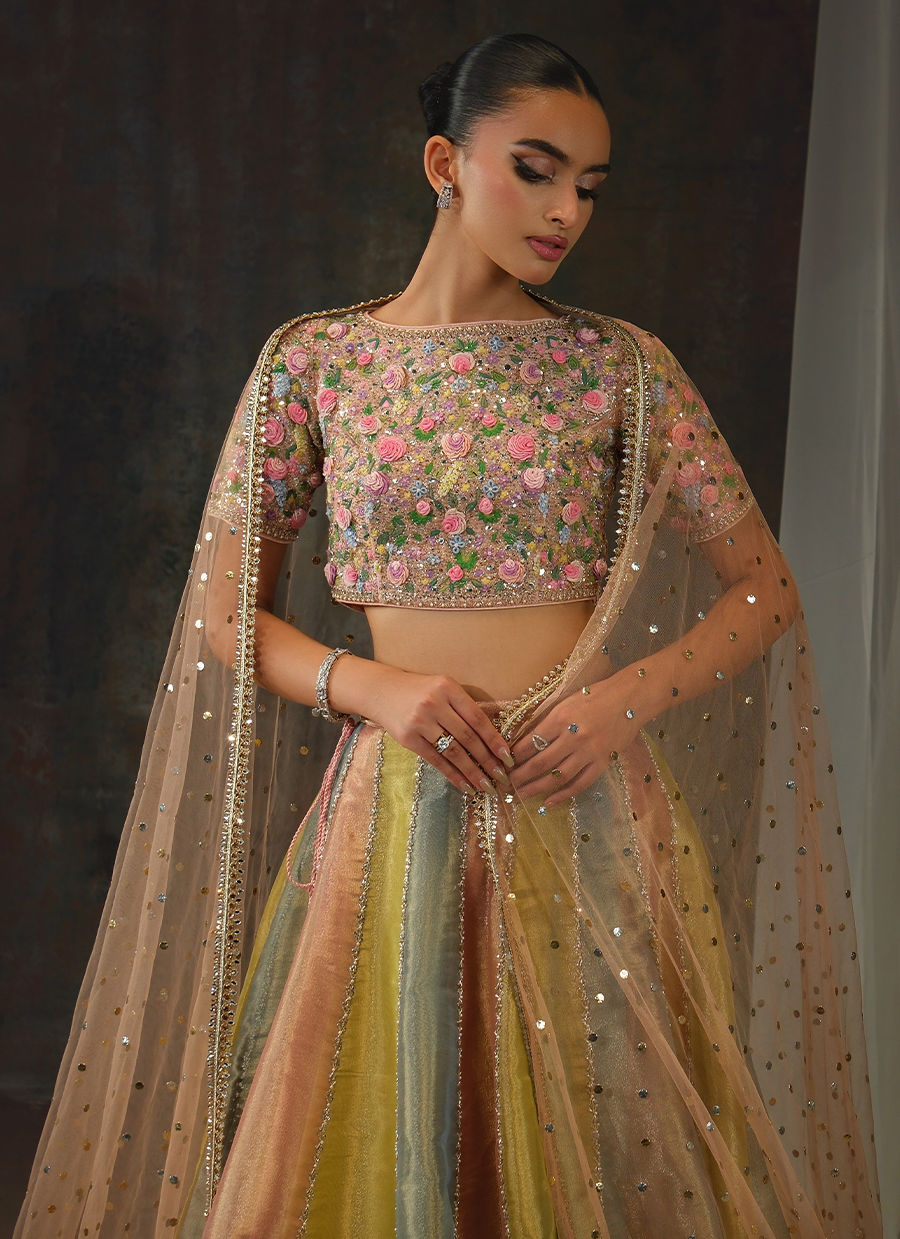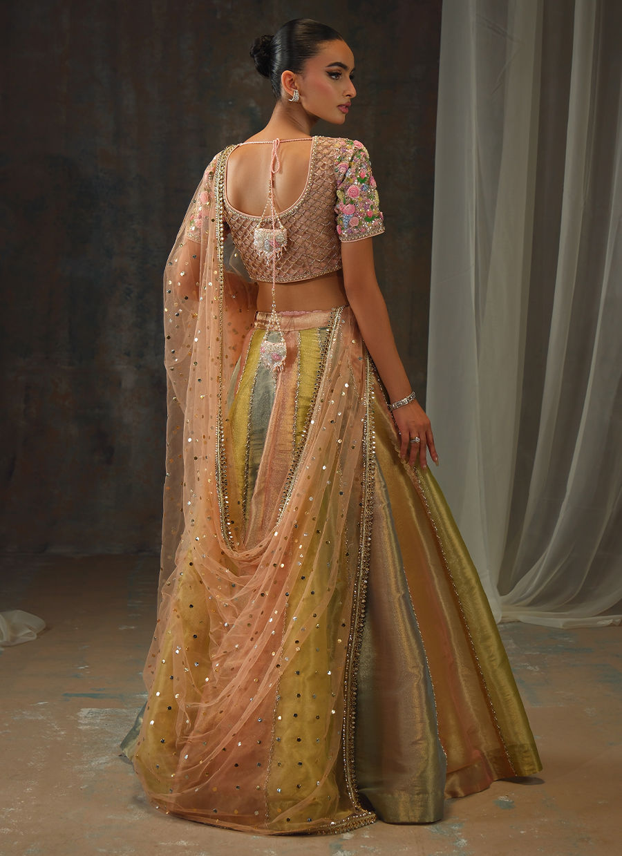 Shimmering with artisanal brilliance, this Setareh lehenga is crafted from gleaming tissue panels adorned with glistening chiri panja hand embroidery that catches the light with every movement. The extra-long mukesh net dupatta drapes in a cascade of subtle sparkle, perfect for dramatic wedding entrances. The choli is a vision of intricacy—filled with delicate French knot roses, sequins, and mukesh work—while playful tassels sway from both blouse and lehenga. The back reveals exquisite cutwork, a detail that adds allure from every angle. Regal yet romantic.