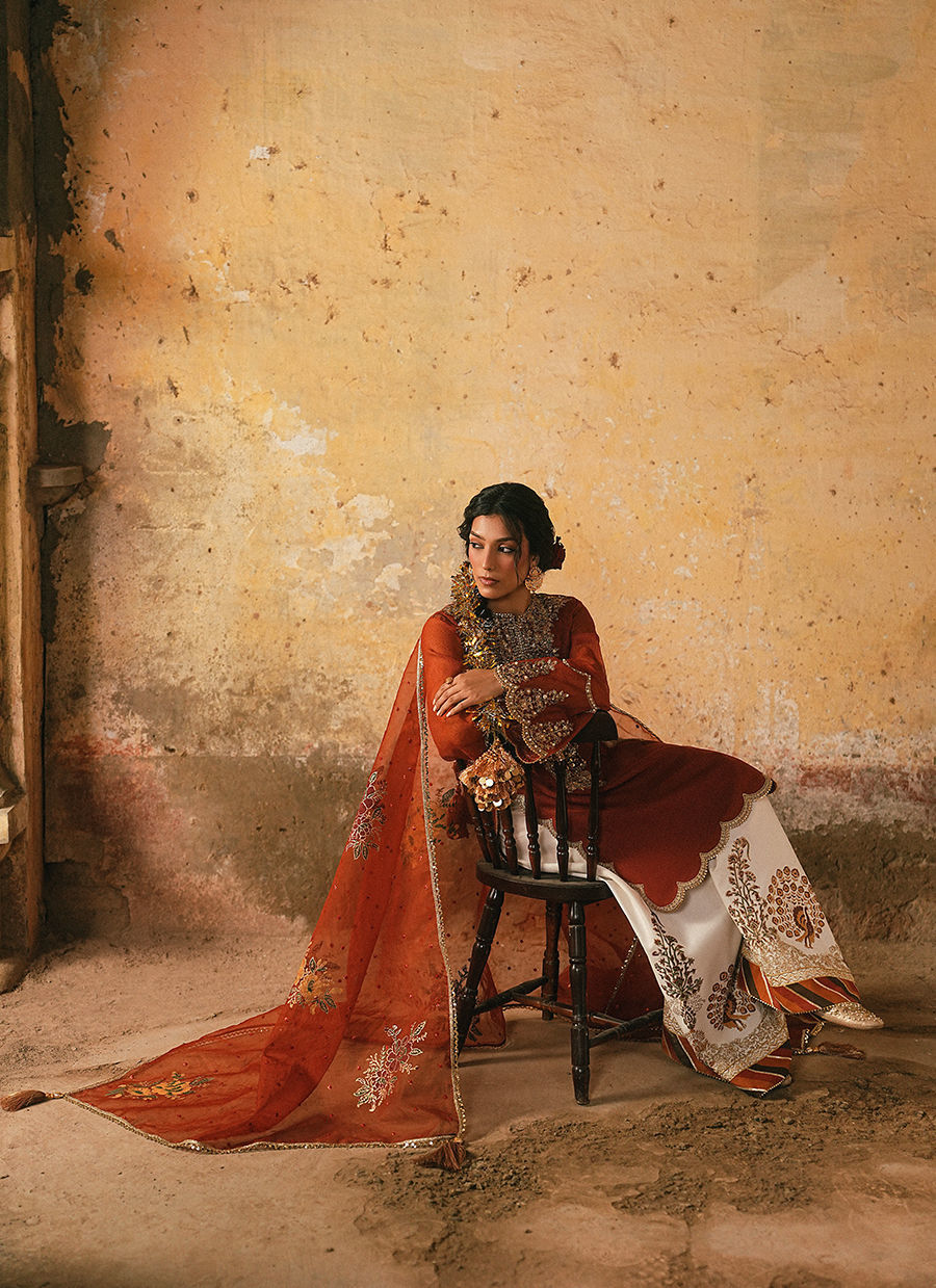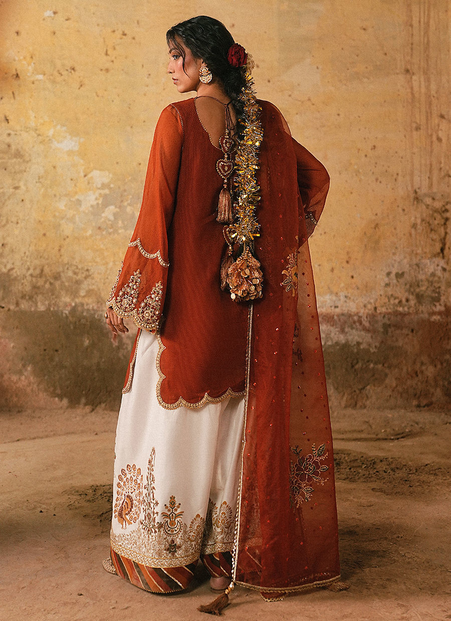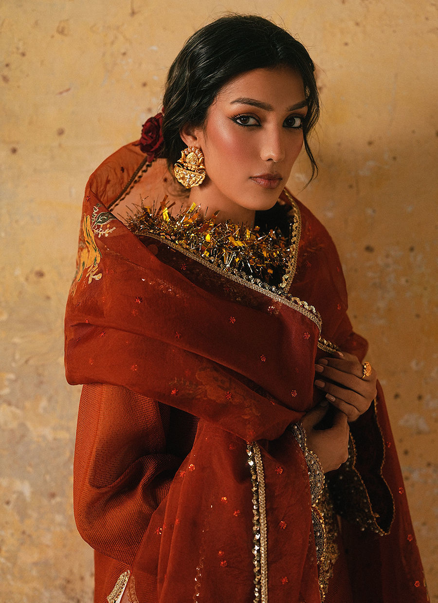 A rust-orange net shirt featuring an intricately embroidered neckline and subtle adda accents, gracefully finished with a scalloped hem. It is paired with a double-chan organza dupatta adorned with delicate floral block print motifs, and a paper silk shalwar showcasing an all-over block print, an embroidered hem, and intricate chatapati detailing, creating a vibrant and elegantly textured ensemble.