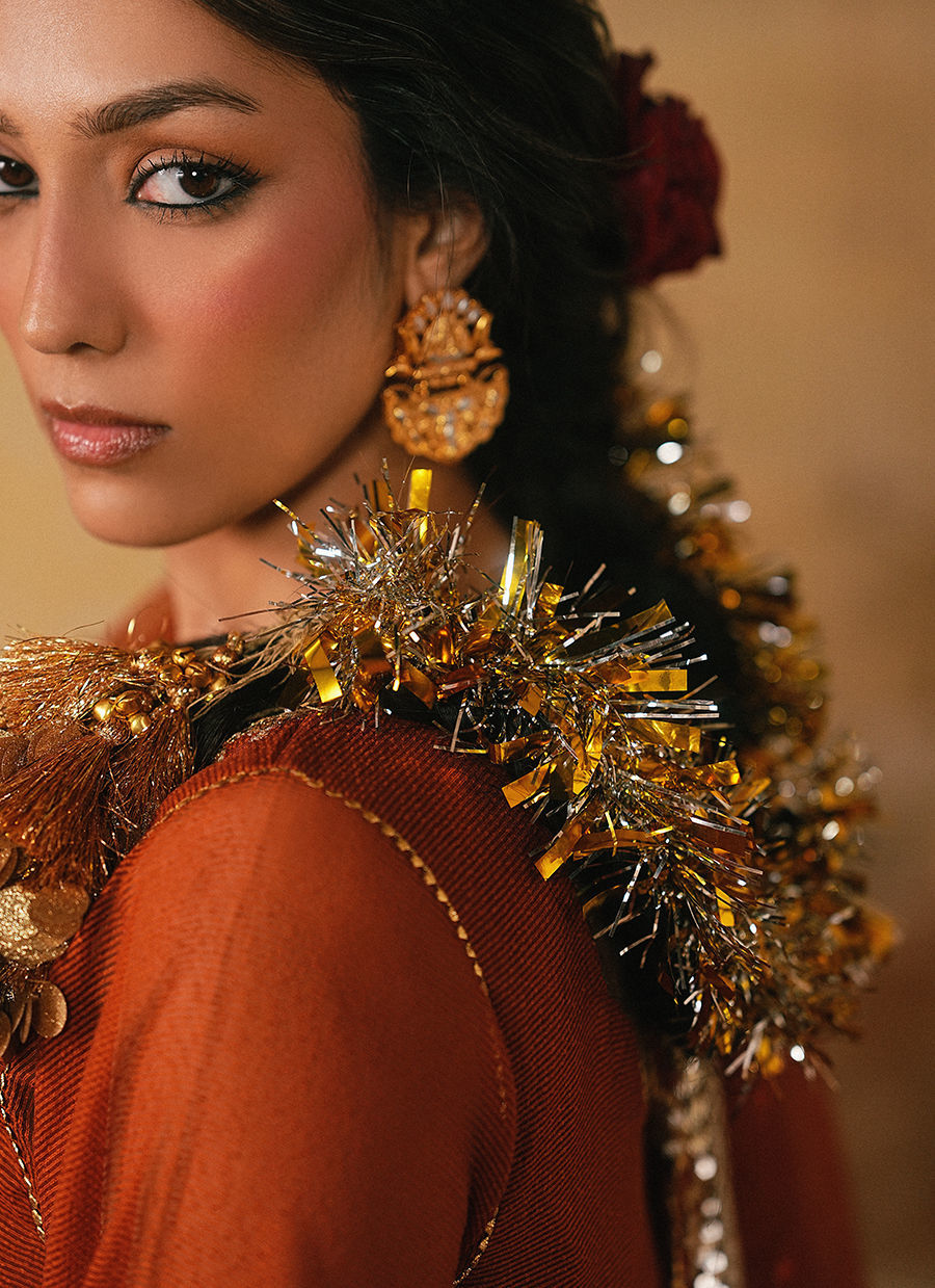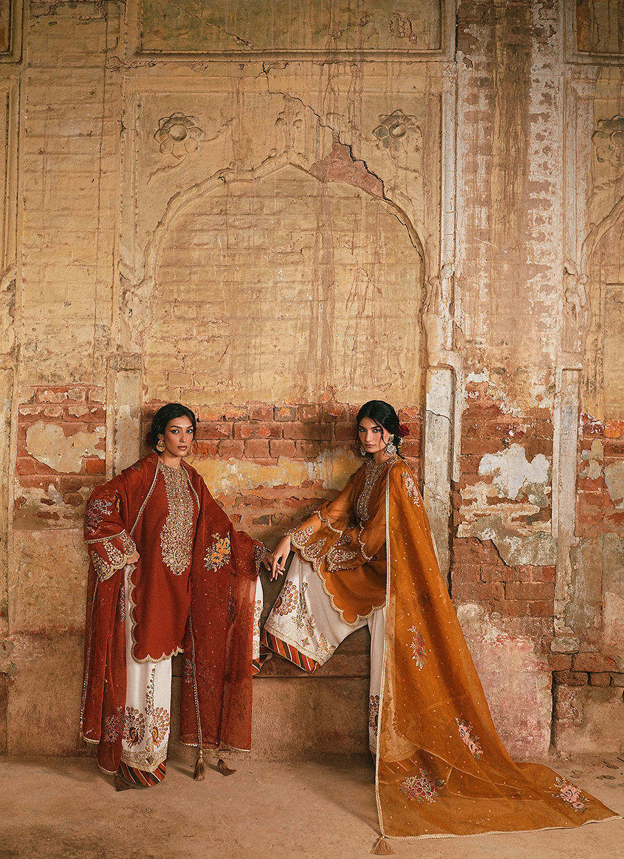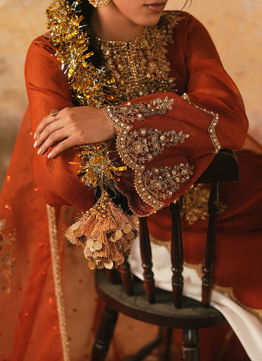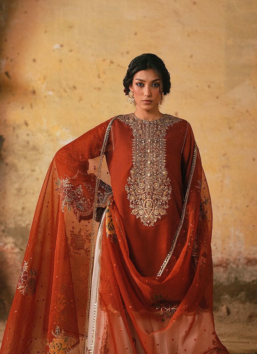 A rust-orange net shirt featuring an intricately embroidered neckline and subtle adda accents, gracefully finished with a scalloped hem. It is paired with a double-chan organza dupatta adorned with delicate floral block print motifs, and a paper silk shalwar showcasing an all-over block print, an embroidered hem, and intricate chatapati detailing, creating a vibrant and elegantly textured ensemble.