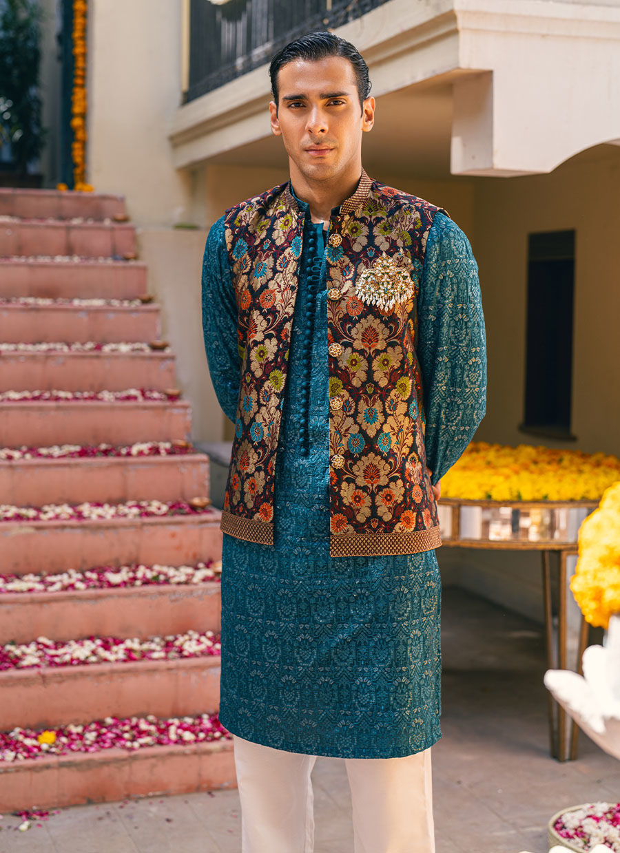Pure damask waistcoat featuring pop of silk thread multicolored motifs adorned with handcrafted bejeweled embellishments paired with light-catching sequins kurta in deep aquamarine shade.