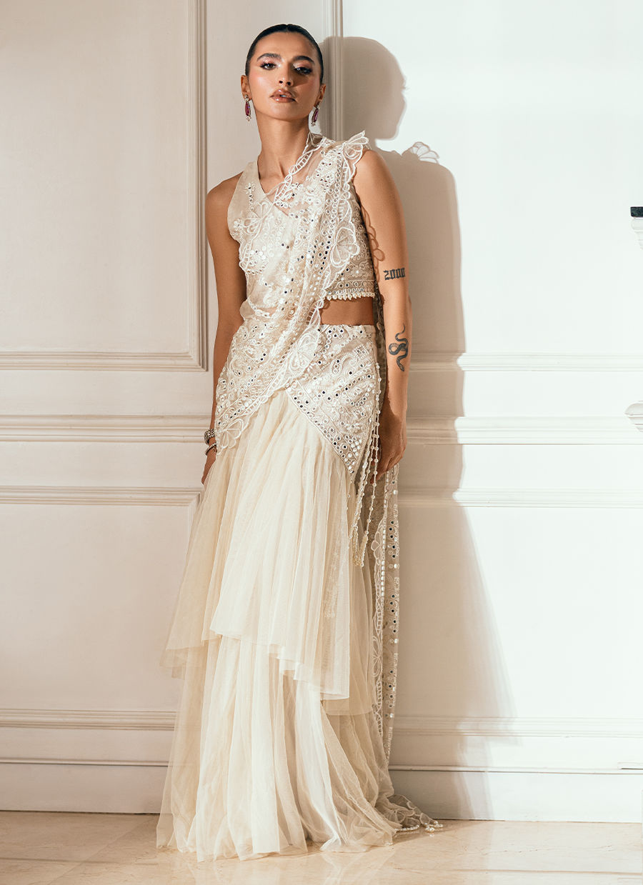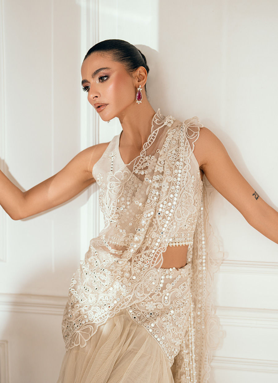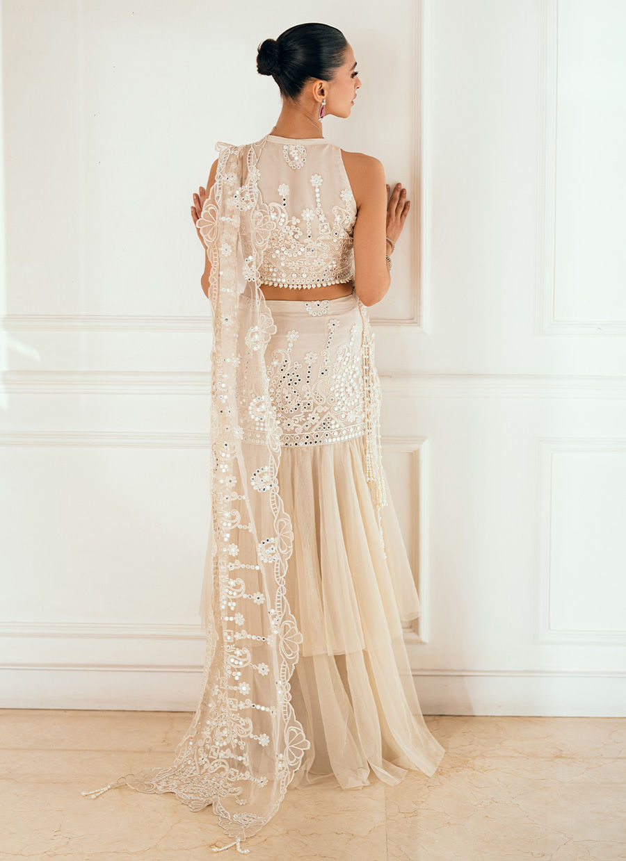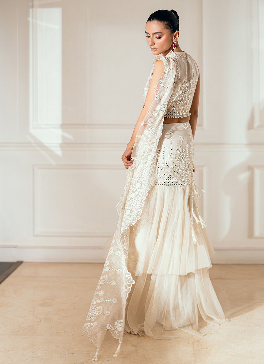 Shahnoor is a stunning pure organza choli adorned with delicate thread and foil work, paired with a net lehnga finished with kankan detailing for graceful volume. The ensemble features a pure organza dupatta attached to the lehnga, detailed with thread and foil embroidery and a cutwork appliqué border. Handmade pearl tassels on the sides of the lehnga add a refined touch of elegance.