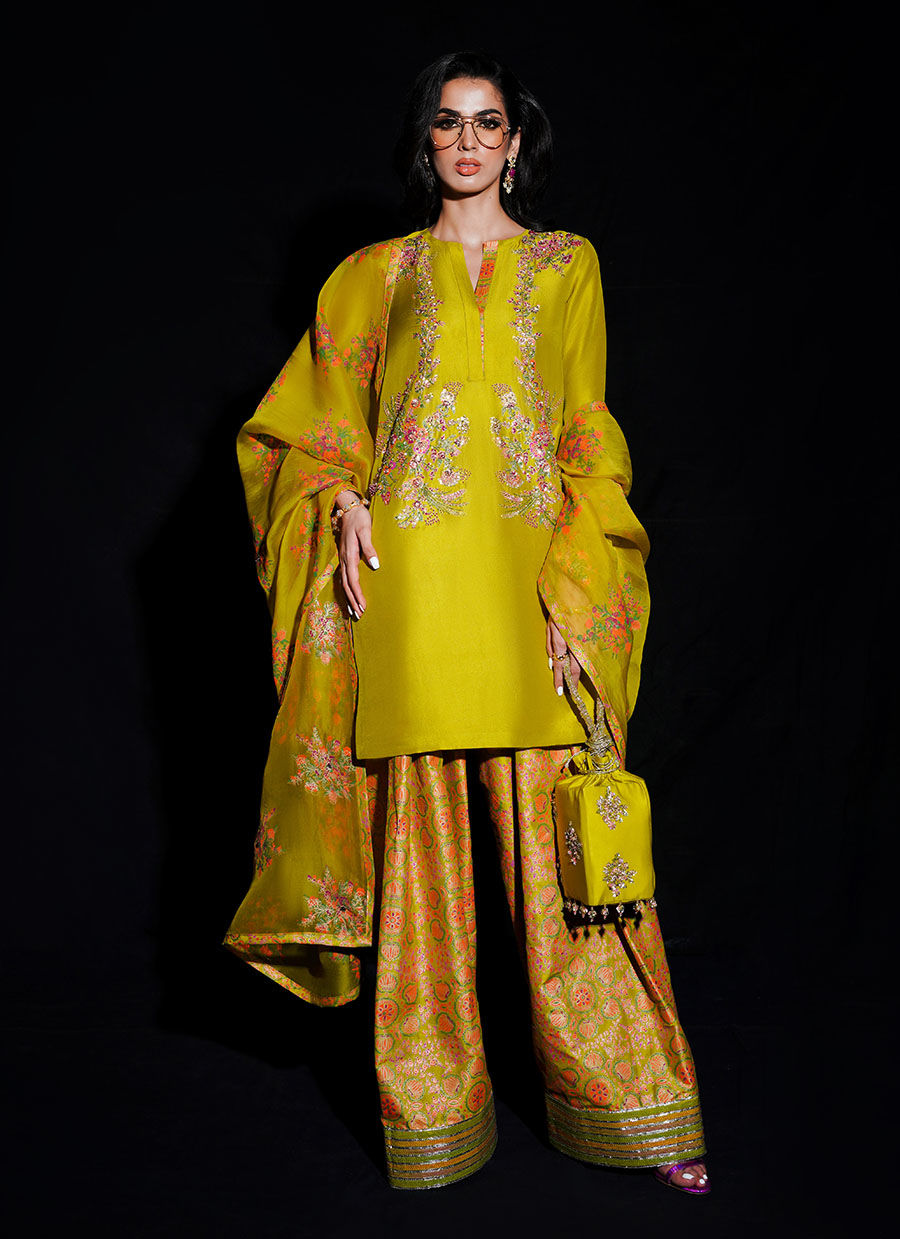 Savor in the allure of opulence with our splendid lime yellow raw silk shirt, a luminous canvas adorned with a tapestry of intricate golden, pink, and green bugle beads, intertwining with the radiant gleam of gold sequin detailing. Paired artfully with a multicolored printed shalwar adorned by an enchanting border, and accompanied by a 3-yard printed organza dupatta, a cascade of golden sequins bestowing a celestial aura. Luxuriate your ensemble with our signature potli bag, the epitome of sophistication, culminating in an extraordinary look that exemplifies the very essence of refined extravagance.