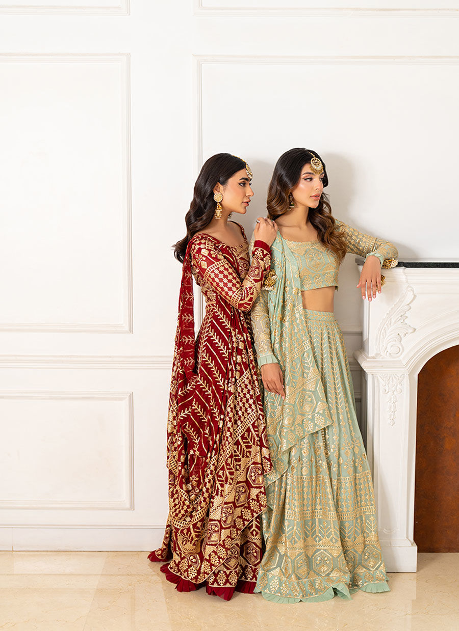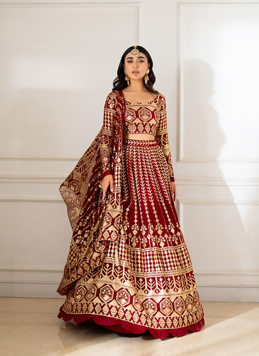 Unveil the epitome of elegance in this red georgette chiffon lengha choli, adorned with shimmering sequin work. The draped dupatta, organza handmade pleats on the lengha, and handmade tassels on the sleeves create a masterpiece of artisanal beauty and timeless charm.