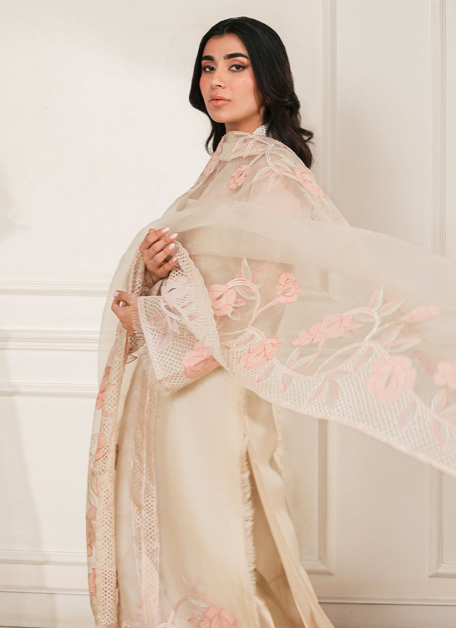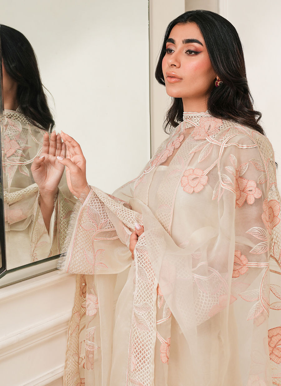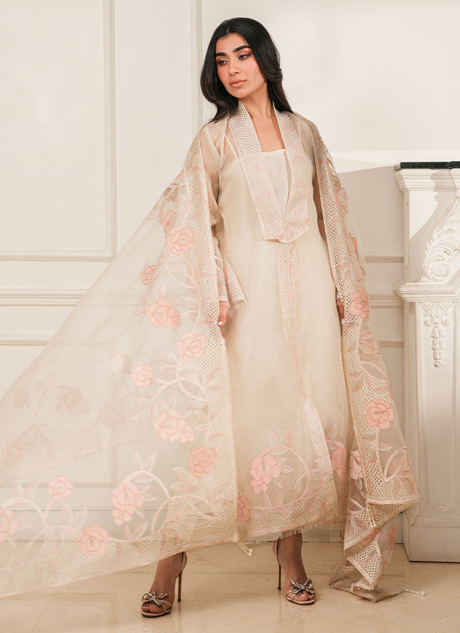 Pure organza ensemble adorned with delicate floral thread embroidery, offering a light, ethereal elegance with refined craftsmanship.