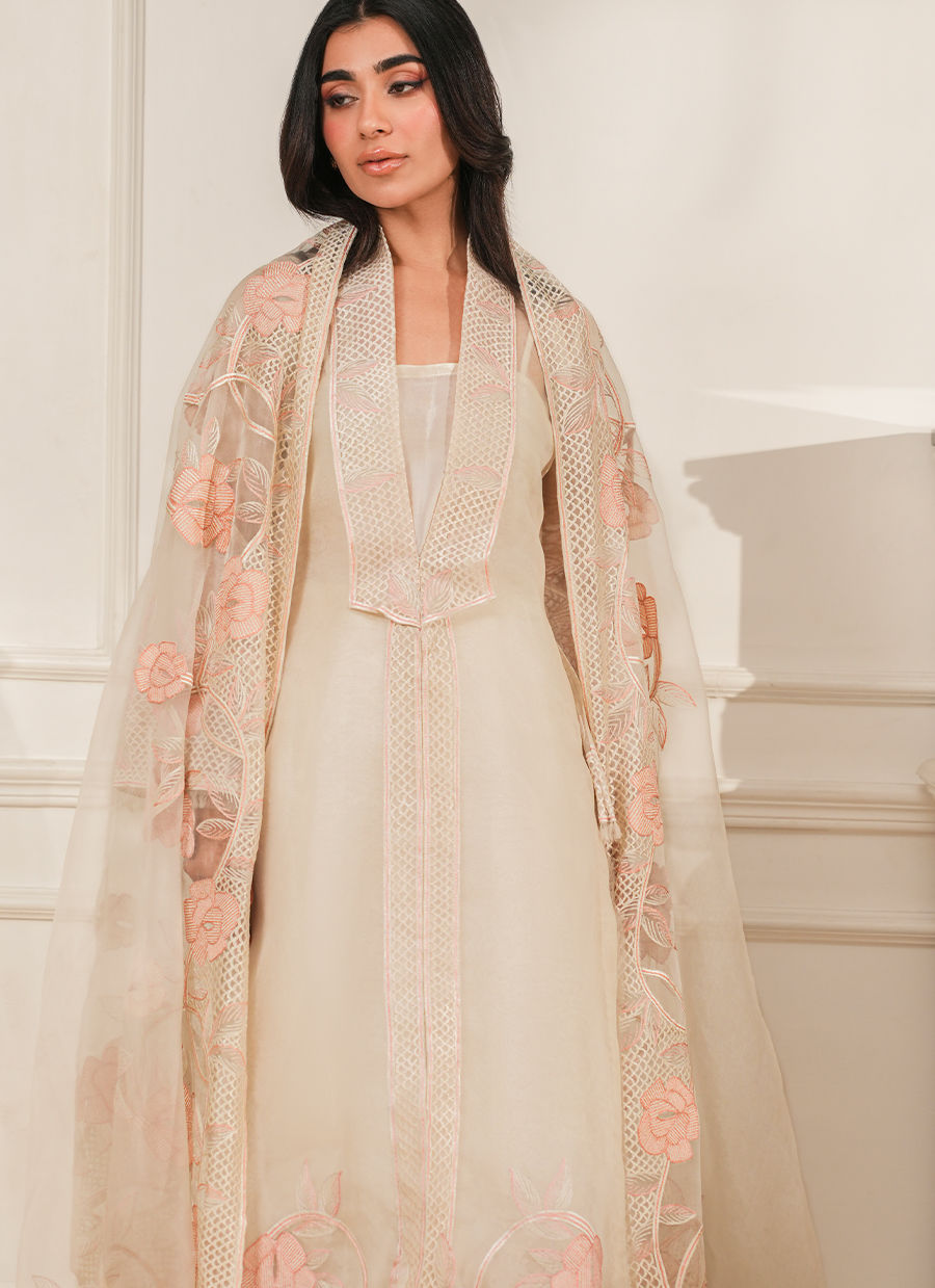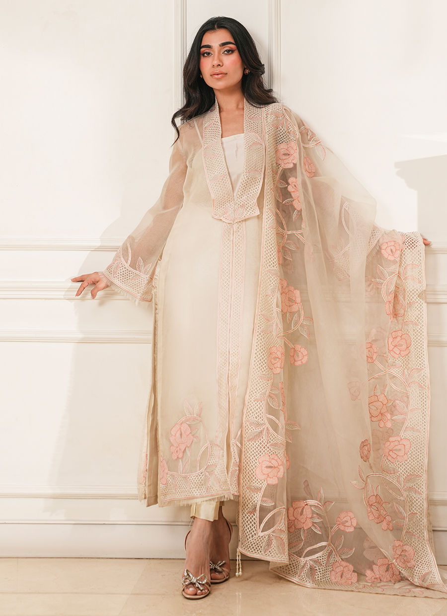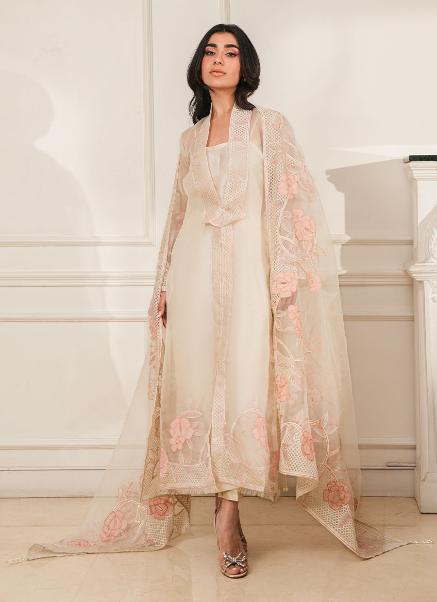 Pure organza ensemble adorned with delicate floral thread embroidery, offering a light, ethereal elegance with refined craftsmanship.