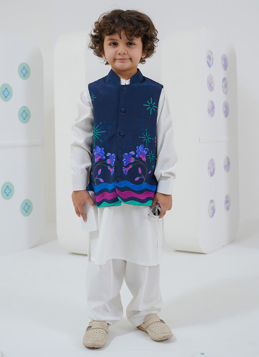 A charming companion to the Shona Mini Kaftan, this boys’ set features a statement printed waistcoat layered over a classic kurta. Designed to coordinate effortlessly, it carries the same bold color story in a refined, playful way.