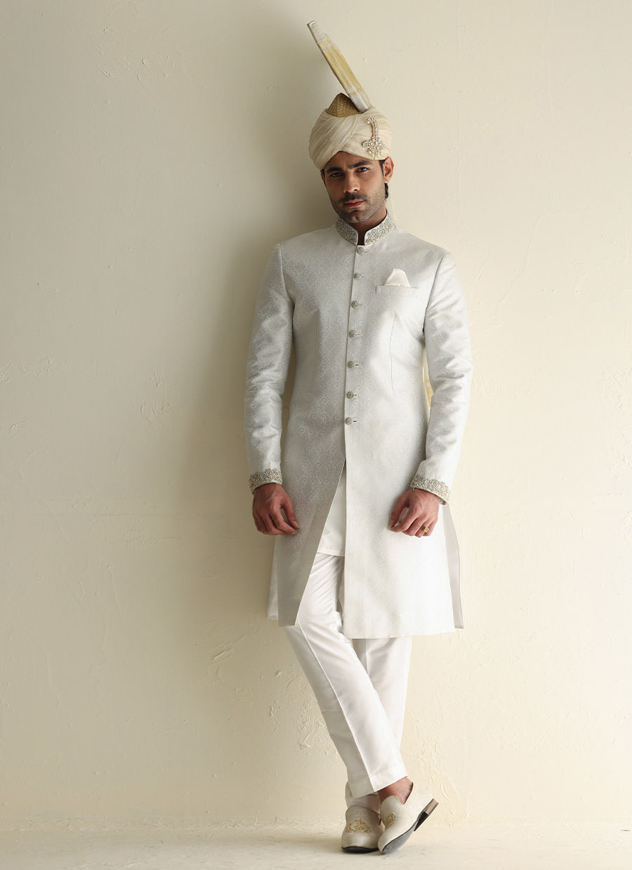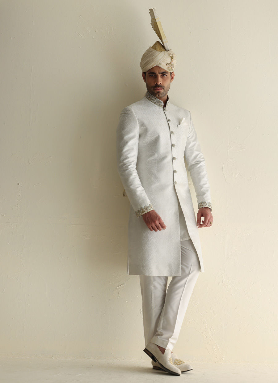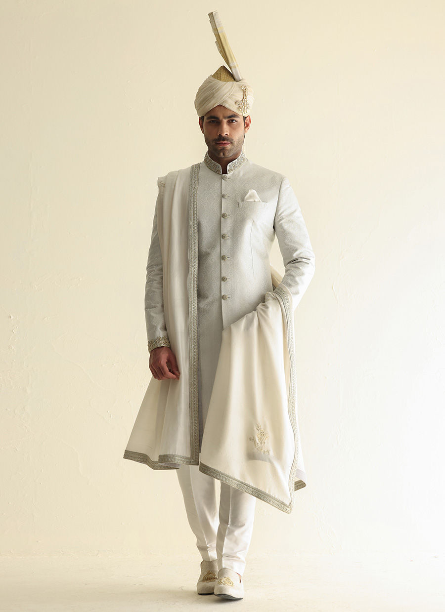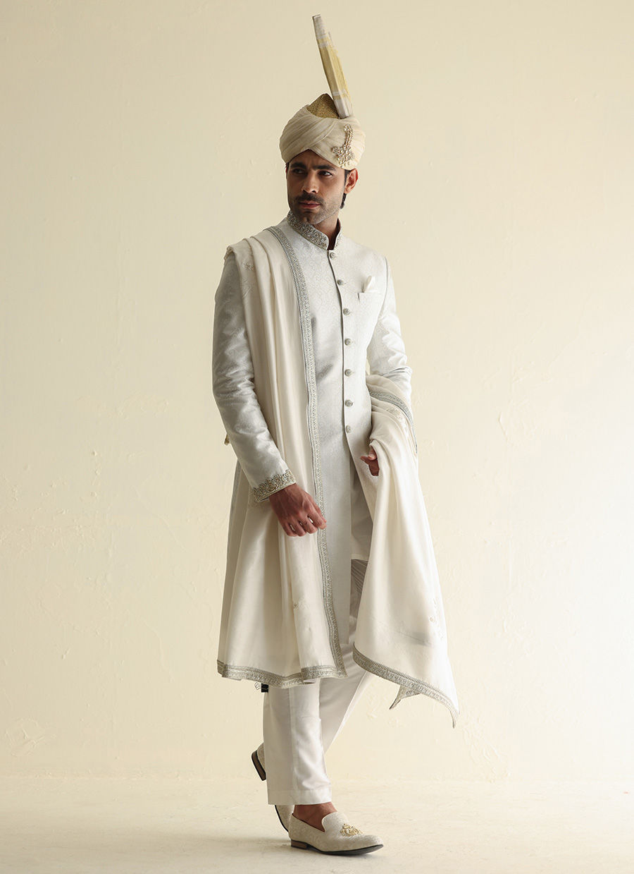 Ivory jamawar sherwani with hand-embroidered collar, cuffs and buttons, paired with an embroidered raw silk shawl and a classic Atchison turban for a regal, ceremonial ensemble