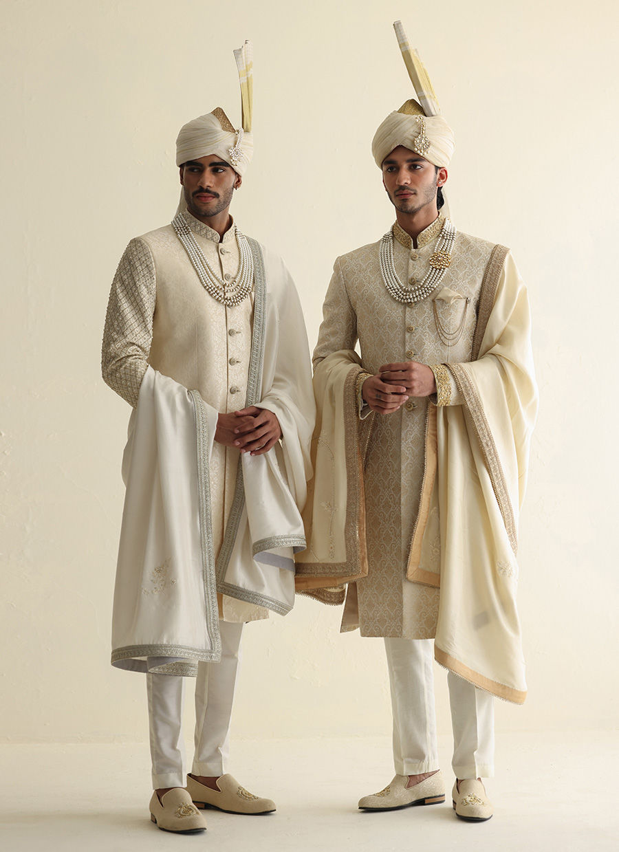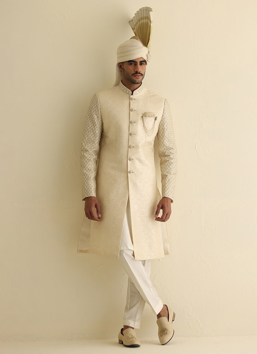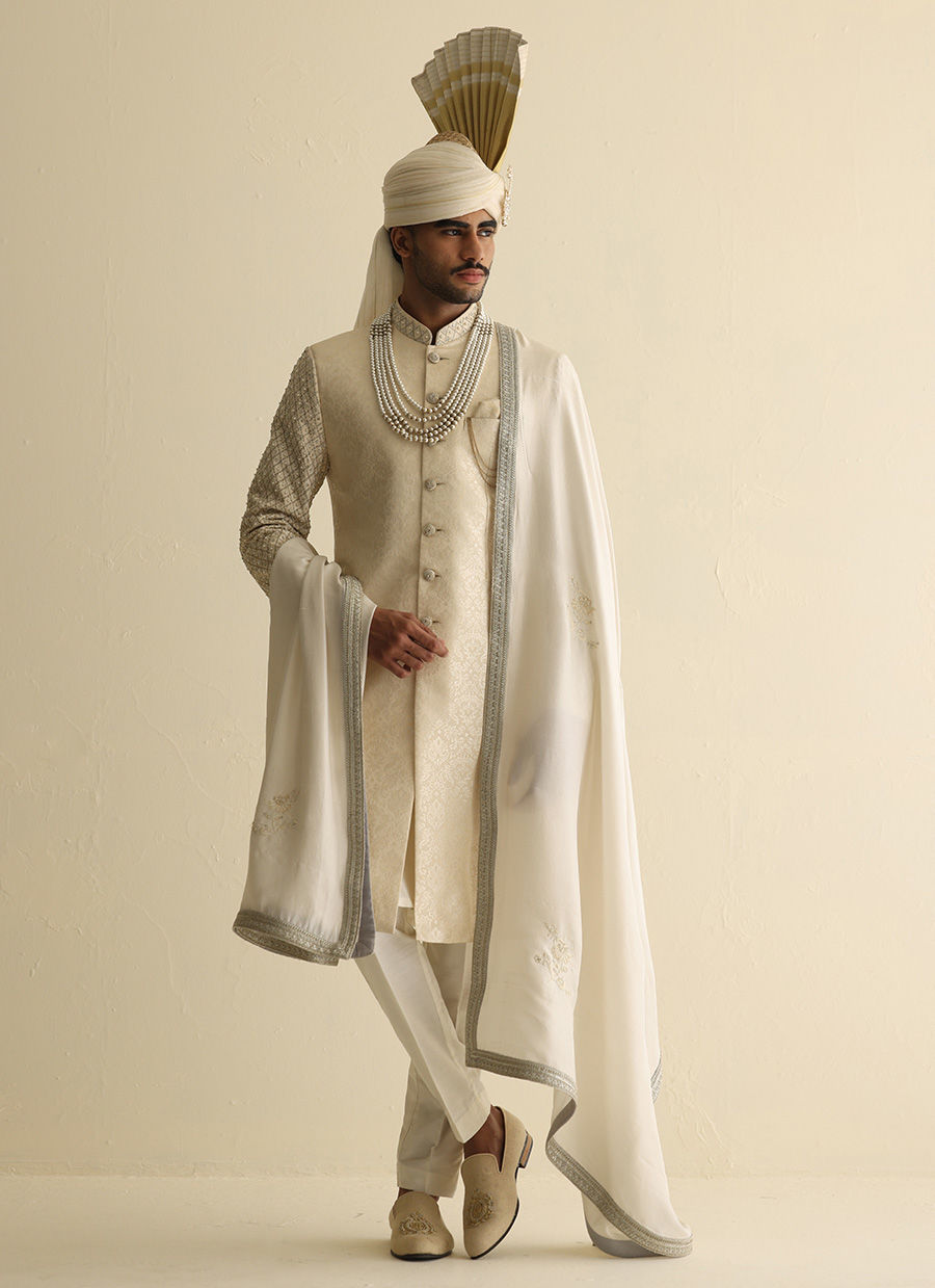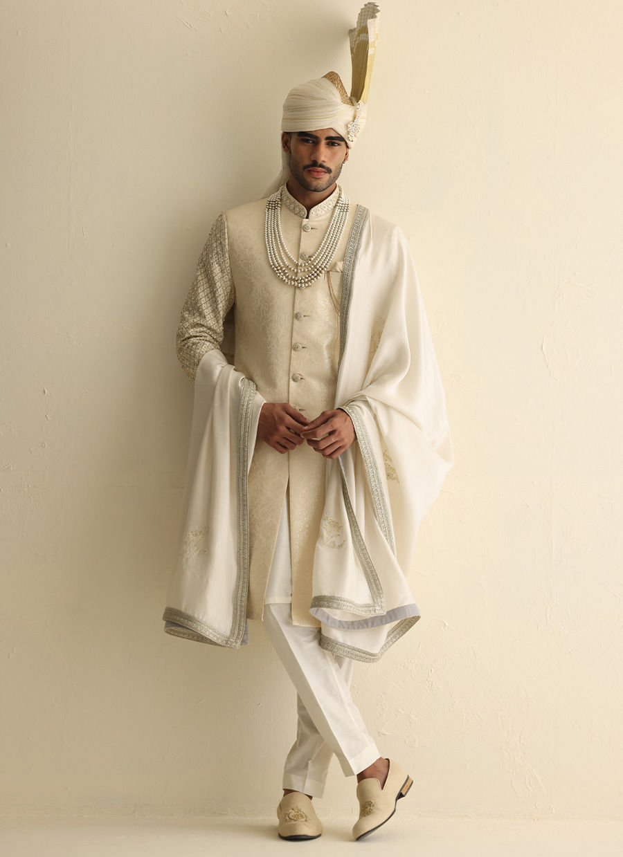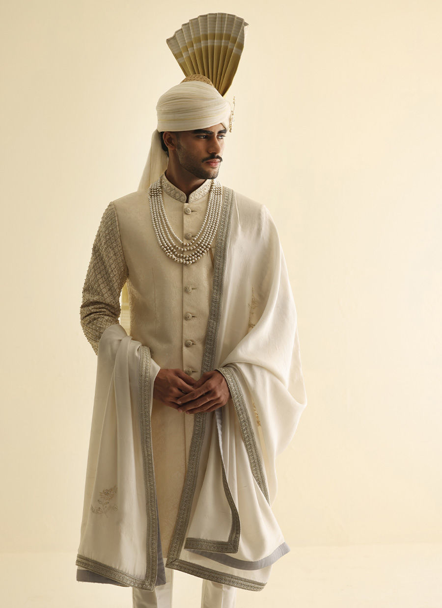 Off-white gold jamawar sherwani with hand-embroidered sleeves and collar embellished with pearls, paired with a matching jamawar shawl and an Atchison turban for a majestic ceremonial ensemble