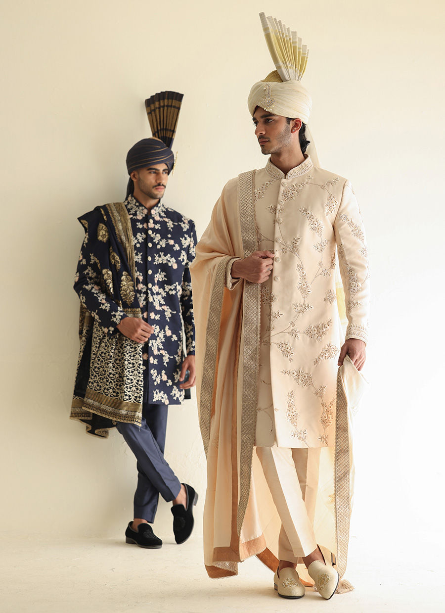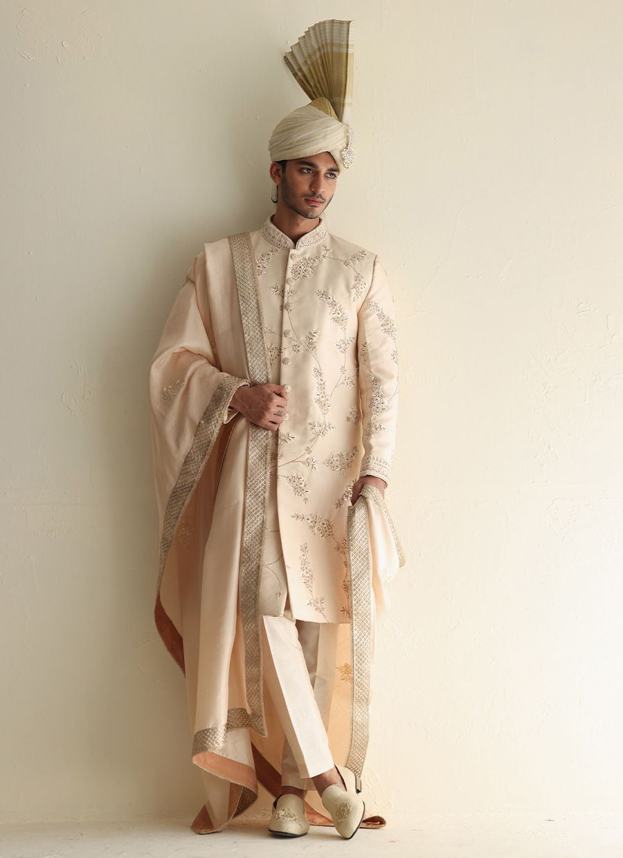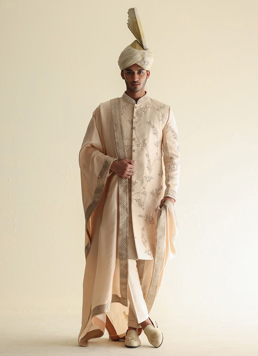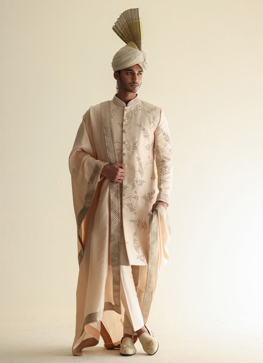 Suiting sherwani with intricate hand embroidery all over, paired with a raw silk shawl and a traditional Atchison turban for a timeless formal look