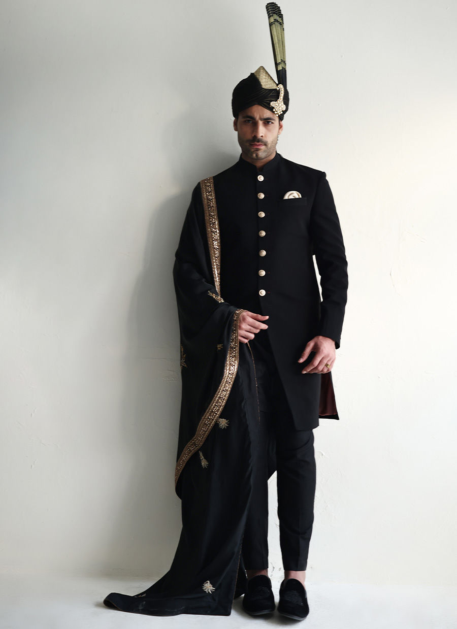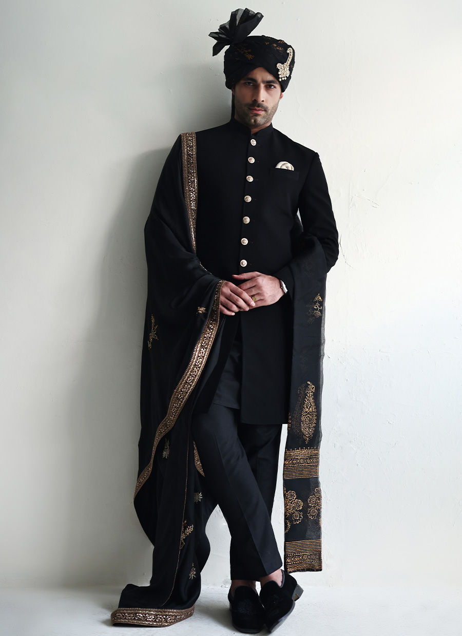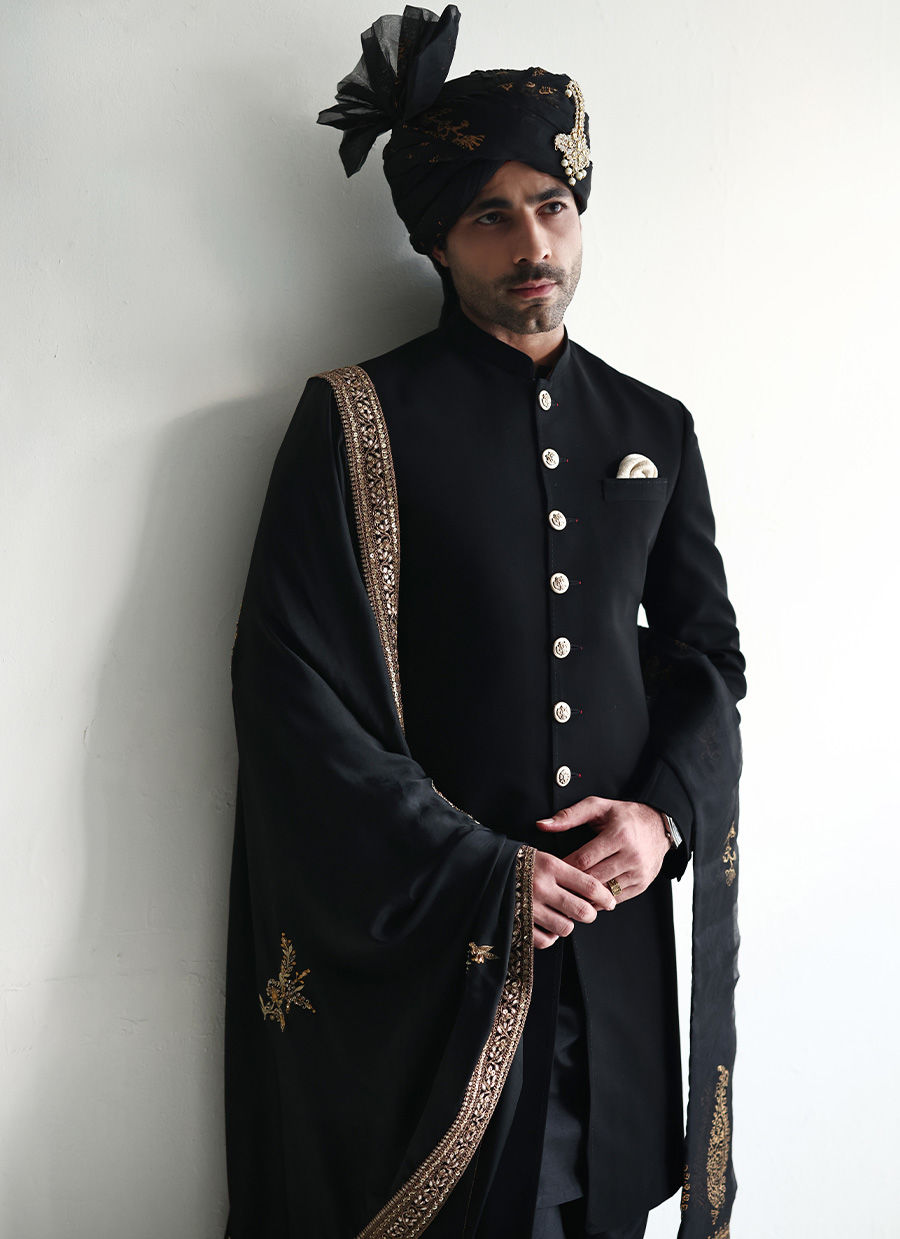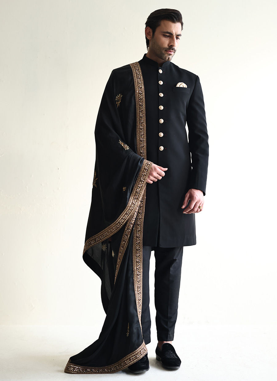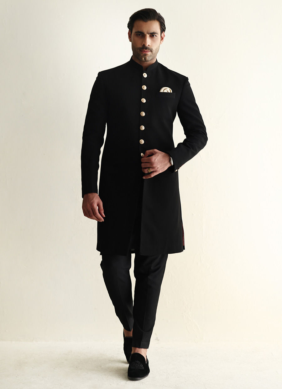 Black georgette sherwani adorned with finely crafted buttons, a sleek and sophisticated statement for any occasion