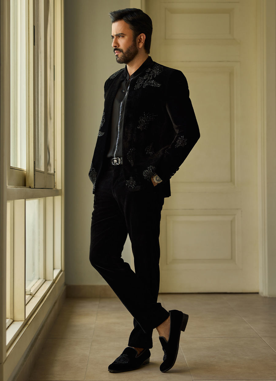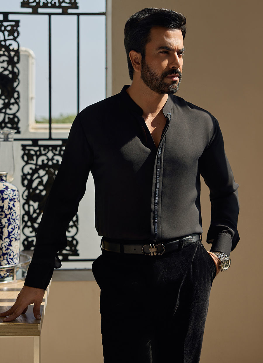 Embrace the power of monochromatic sophistication with this finely tailored look. The outfit features a luxurious Black georgette shirt with hand embroiderey on the placket. It is perfectly paired with Midnight Velvet Trousers, adding a depth of texture and a rich, subtle sheen