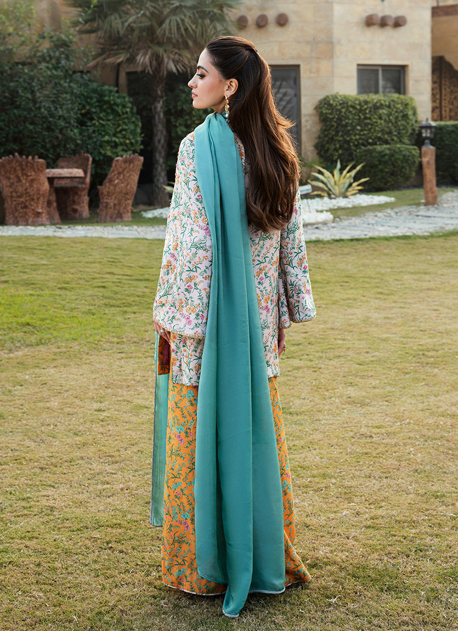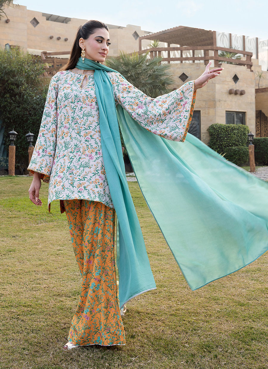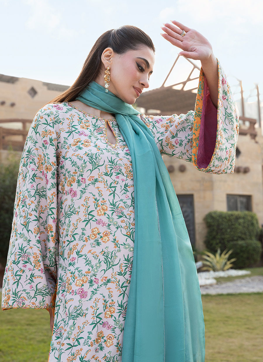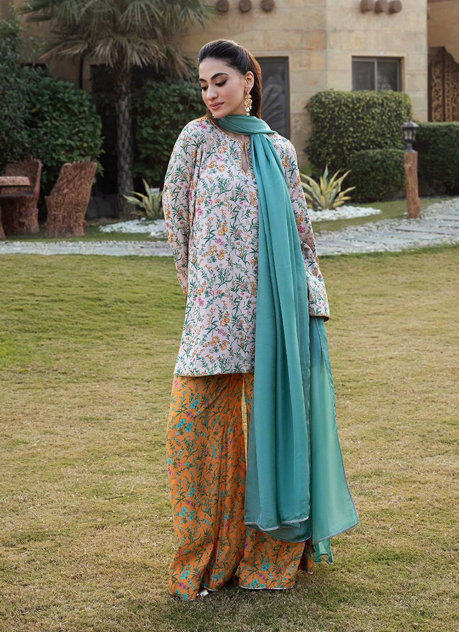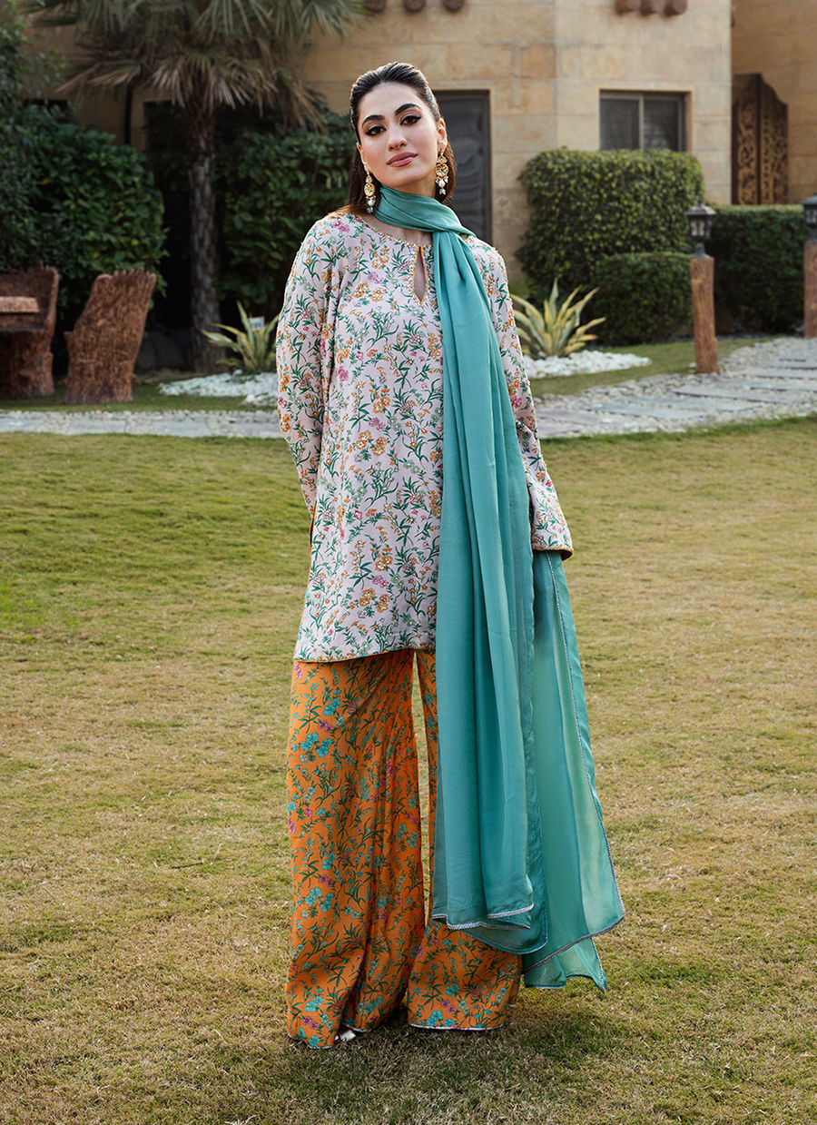 Digitally printed Short shirt crafted from pk raw silk, adorned with a delicate all-over print. The shirt is further enhanced with subtle hand embellishments. It is paired with digitally printed flared Pk raw silk pants in accent colour, designed to complement the look with their structured silhouette. Completing the ensemble is a flowing KP SILK dupatta, draped effortlessly to add lightness and movement, beautifully balancing the richness of the silk textures.