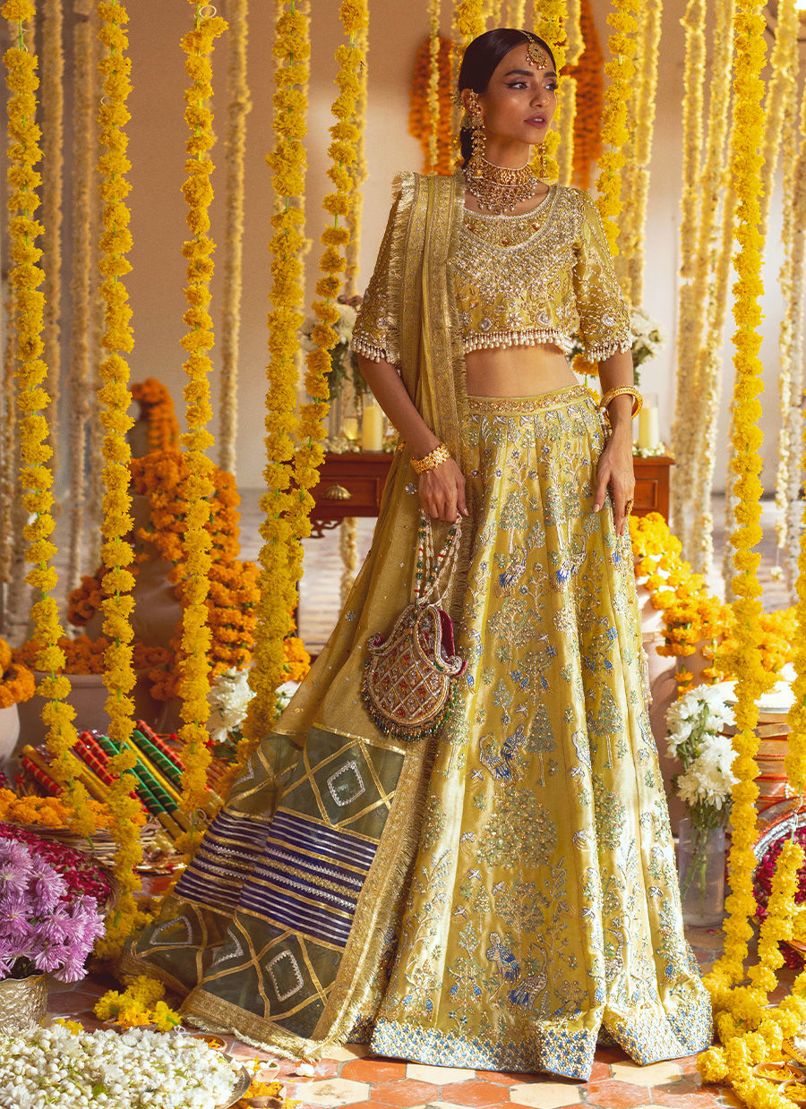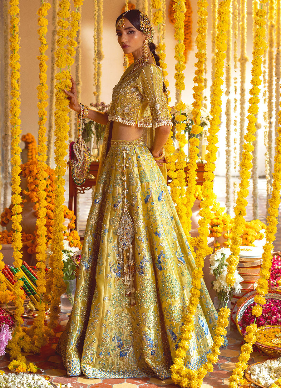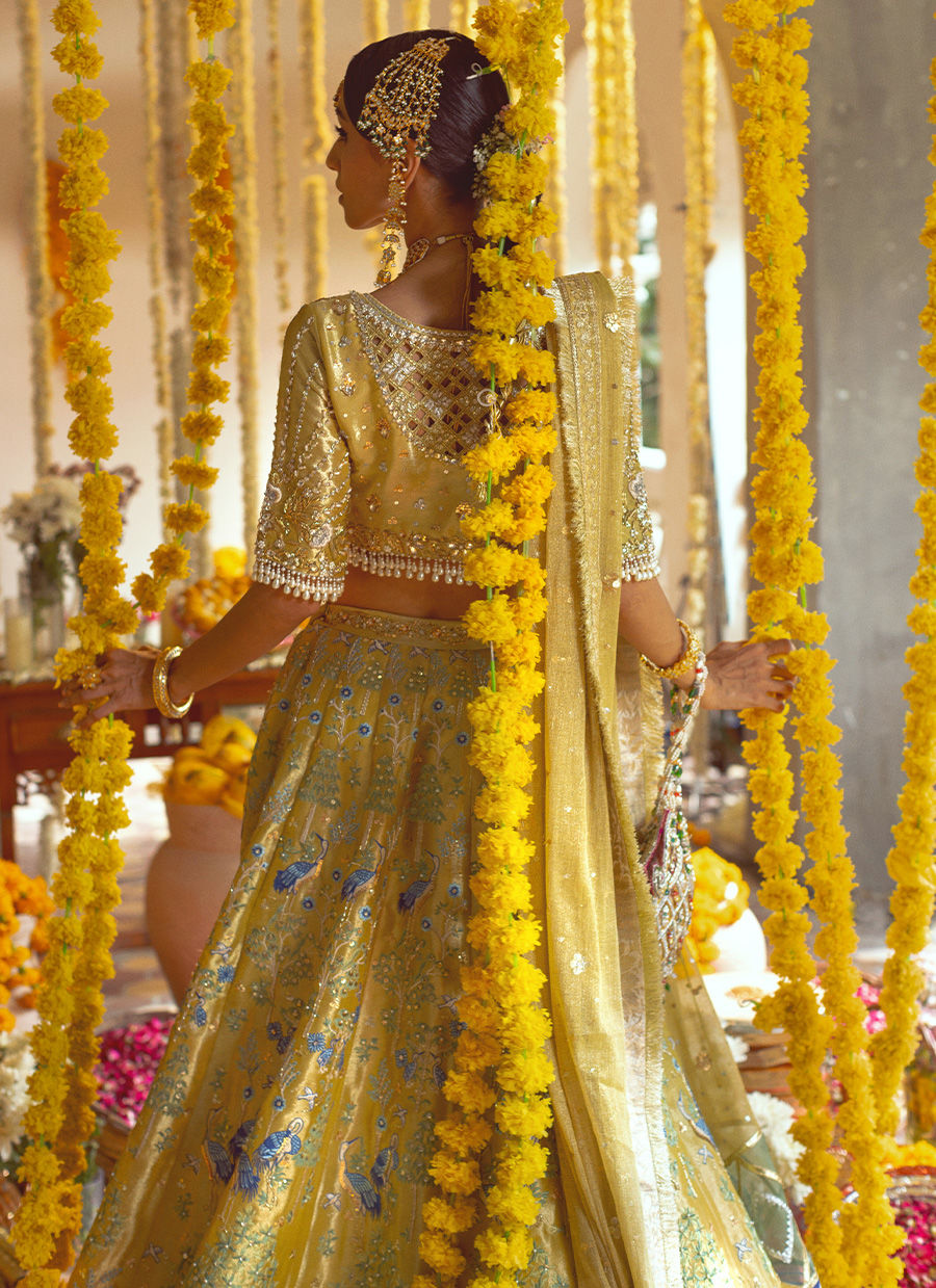 The exquisite details of the gold and silver zardozi alongside the light-reflecting crystals on the shimmering ice lime lamé fabric are truly remarkable. The zardozi embellishments are complemented by silk thread resham accents in delicate shades of cobalts and mints. The lehenga features understated resham embroidery adorned with intricate silver and gold zardozi that depicts a picturesque landscape of flora and fauna. This lehenga choli is elegantly paired with a colour blocked dupatta that showcases aari embroidered details on all sides, embellished with light-catching sequins and gota details on each pallu.