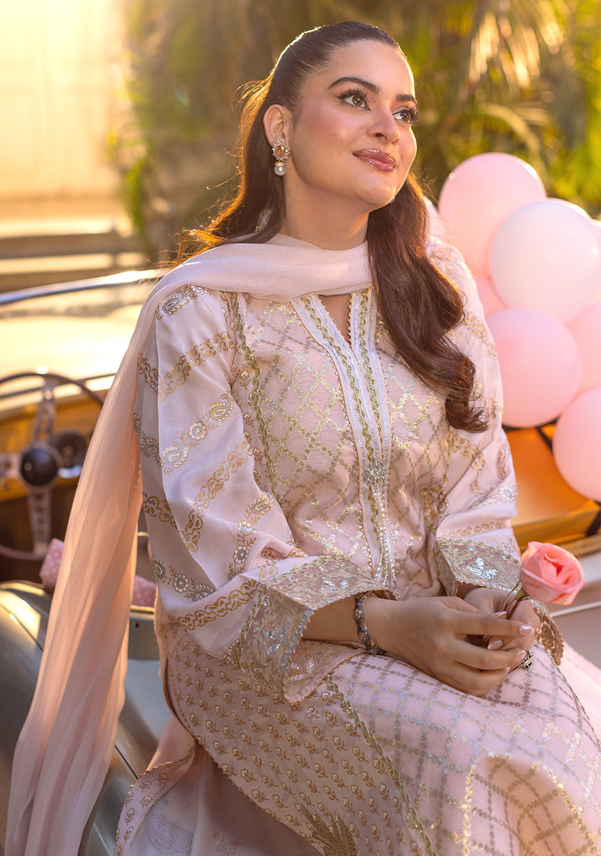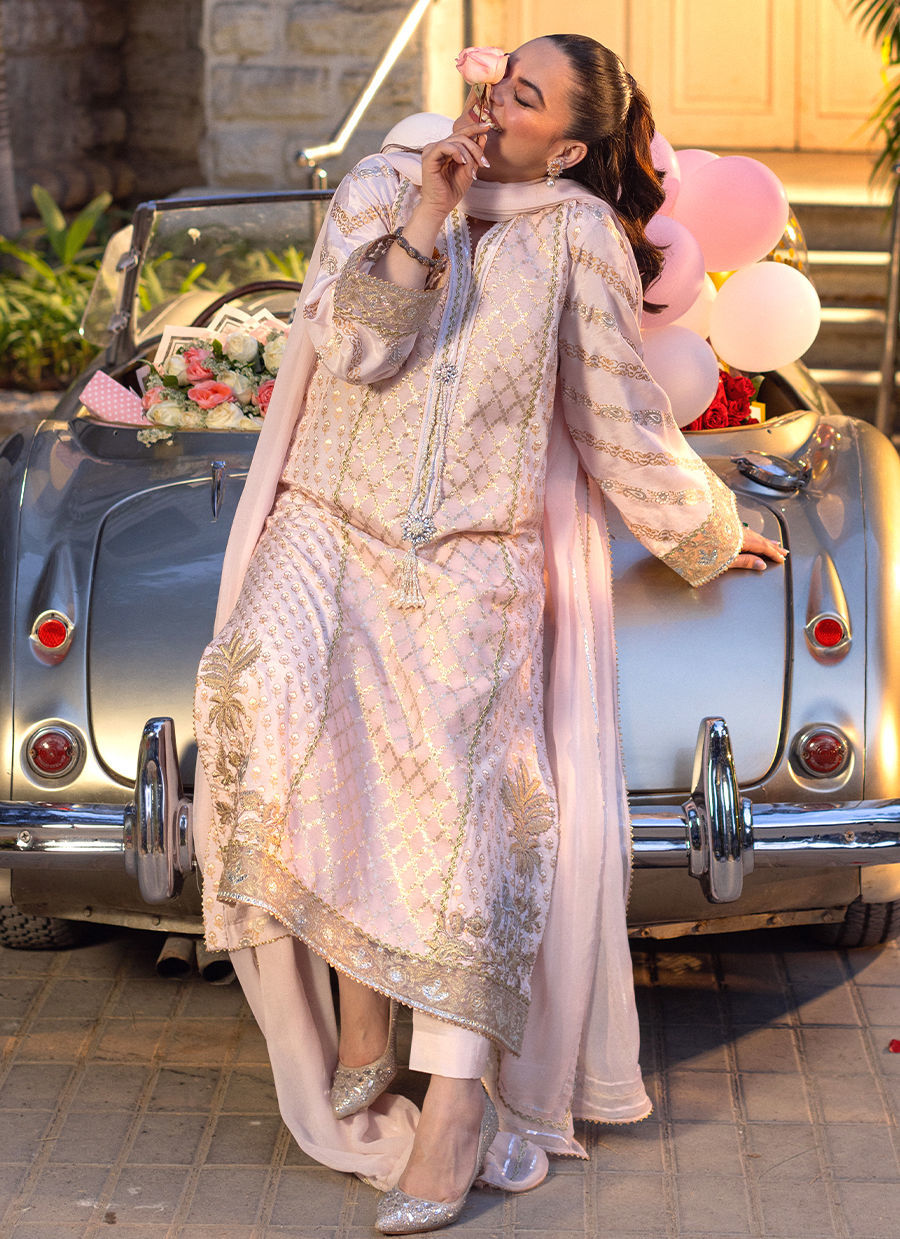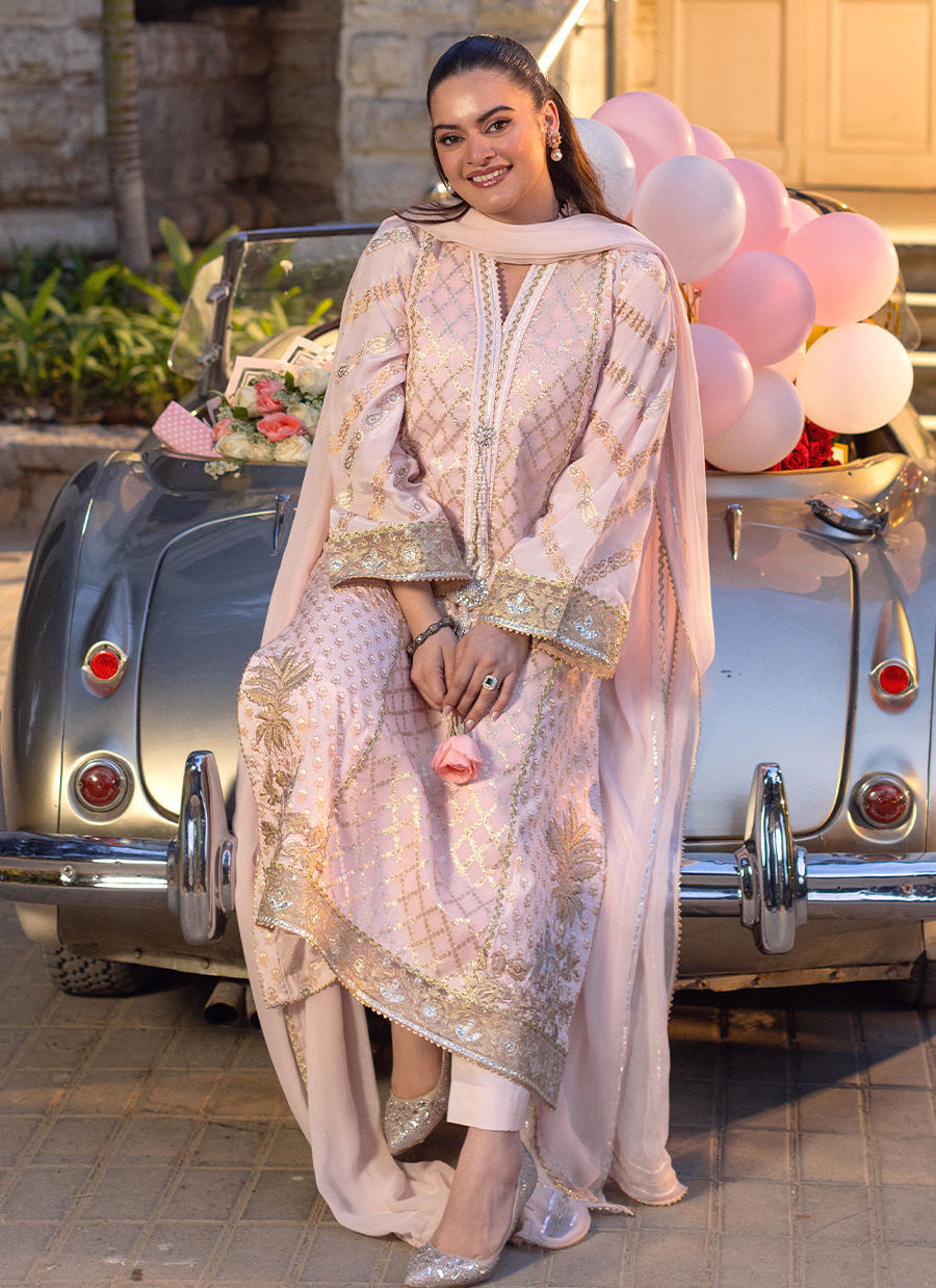 A long-silhouette A-line shirt in a graceful Rose Tyrien hue, crafted from silk and Lurex canvas and enhanced with a subtle, luminous sheen. Intricate detailing enriches the design, while the hem is adorned with delicate zari appliqué motifs, finished with an elegant gota border. The center front is highlighted with meticulously handcrafted zardozi tassels. The ensemble is completed with straight pants and a chiffon dupatta, refined with gold and silver gota detailing for a graceful, cohesive finish.