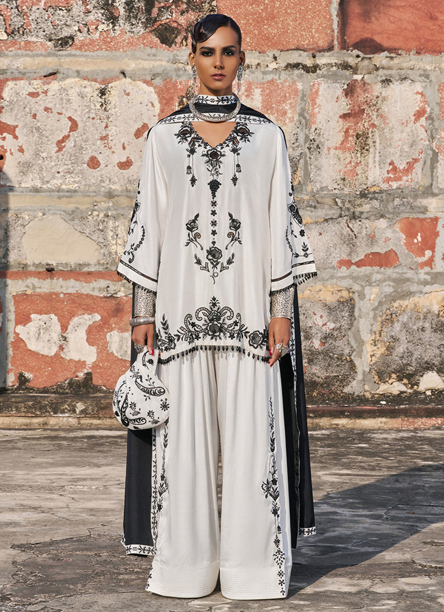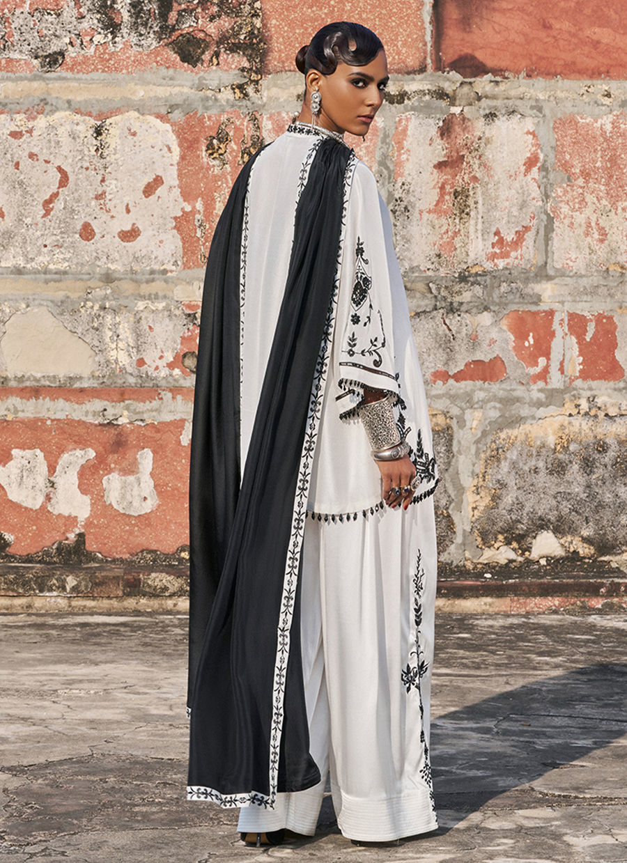 The loose-cut short shirt is crafted from pure raw silk and adorned with intricate black resham and lorix & zari embroidery, elevated with handmade pati work and delicate cutwork crystal hangings for added dimension. It is paired with cotton charmeuse farshi culottes, detailed with matching black resham and lorix zari embroidery, creating a cohesive and elegant silhouette. The look is completed with a medium silk dupatta, finished with a black embroidered border and contrasting white appliqué, adding a striking yet sophisticated finish to the ensemble.