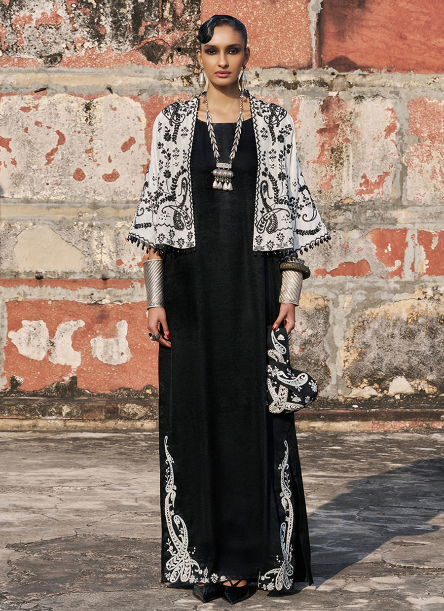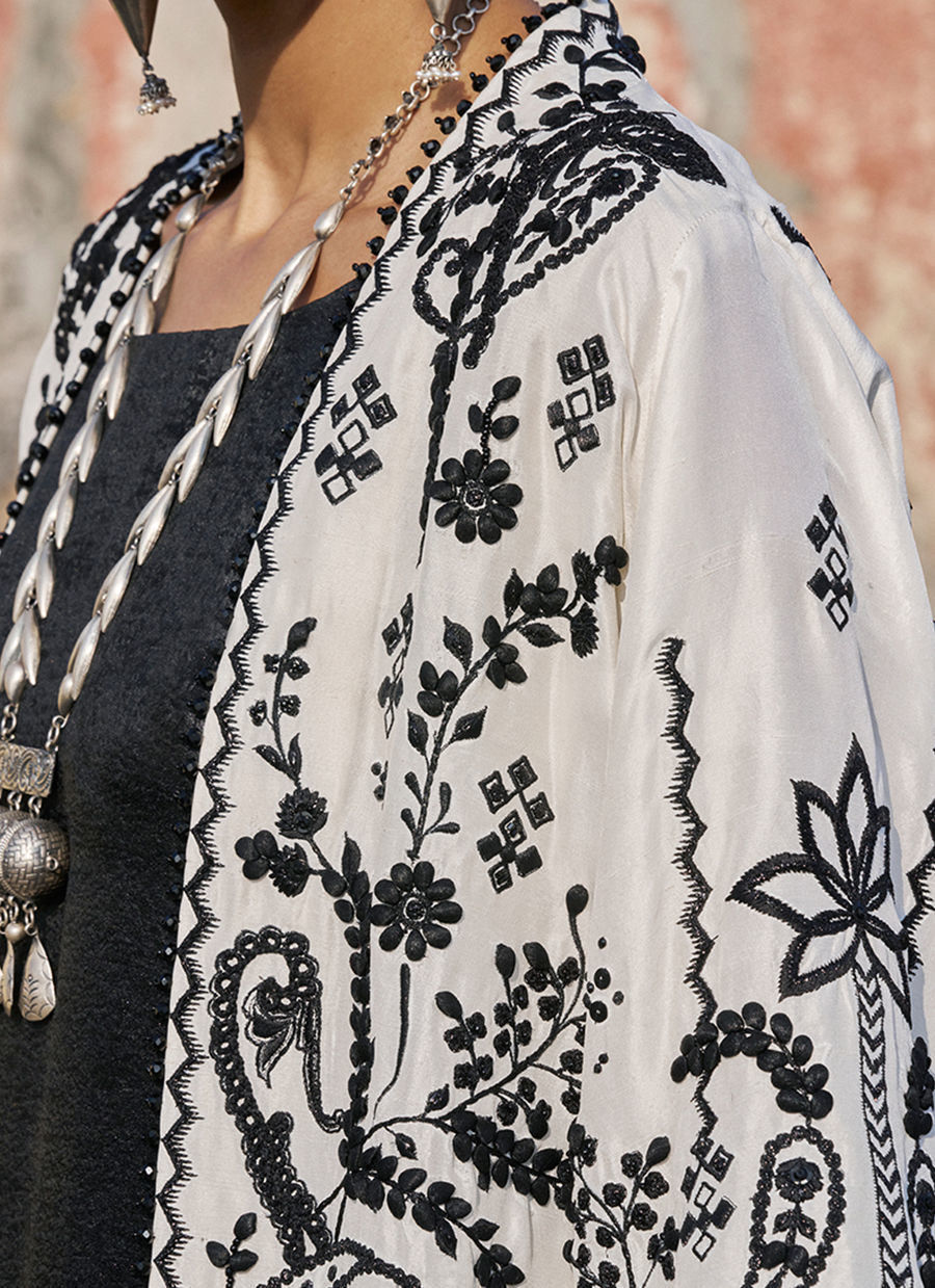 The milky white jacket is crafted from pure raw silk and features intricate black resham and lorix & zari embroidery, enriched with sequins, cutdana, stones, pearls (moti), delicate handmade pati work, and sparkling crystal hangings for a statement artisanal finish. Paired with a black kaftan in sachi foil, adorned with ivory resham and lorix zari embroidery, the ensemble exudes effortless elegance, blending contemporary luxury with traditional craftsmanship.