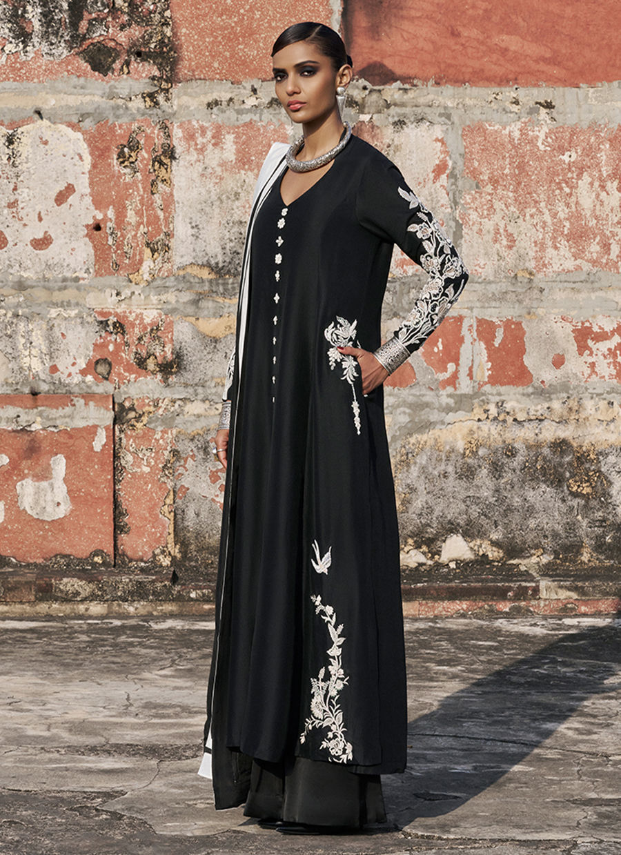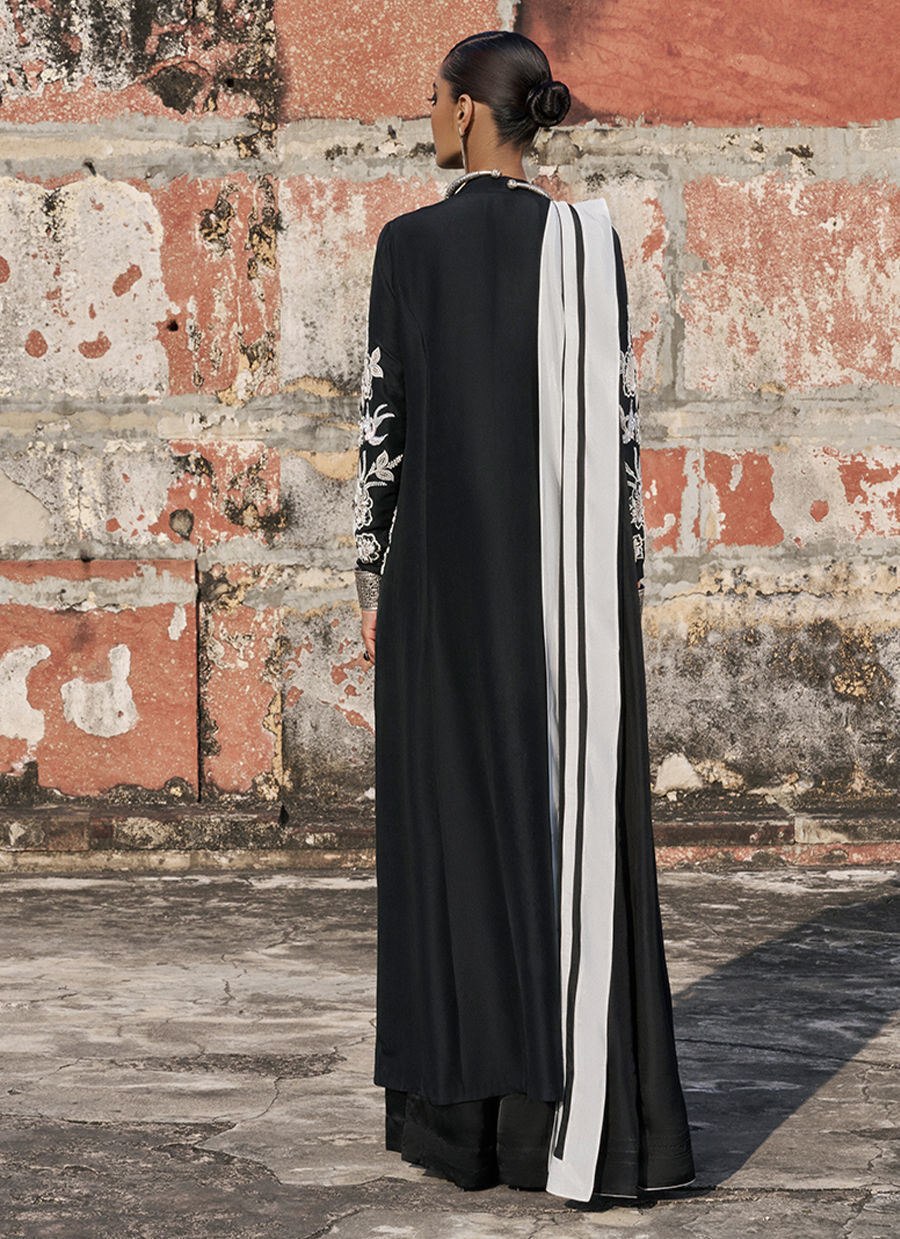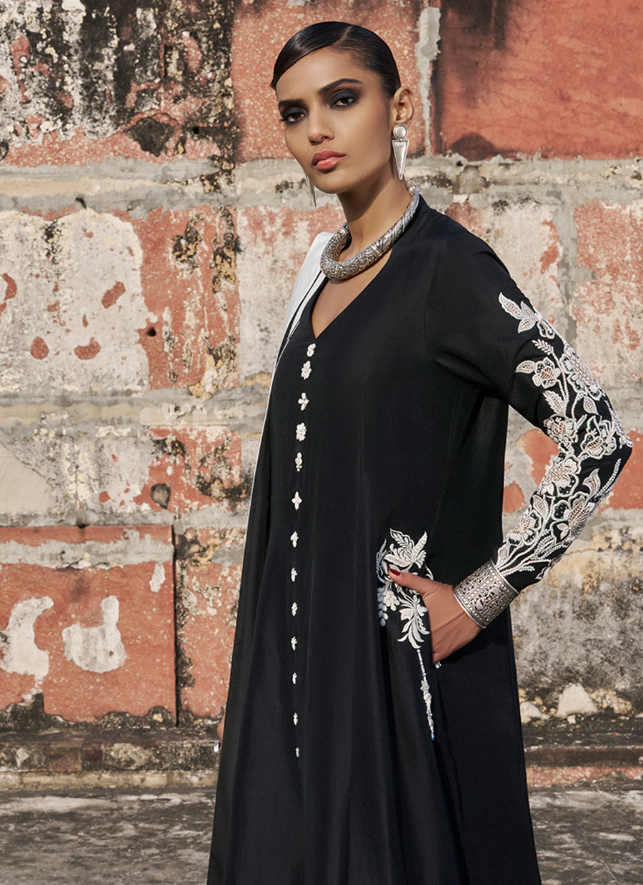 The prince-panel, front-open shirt is crafted from pure raw silk and features functional pockets, adorned with intricate black and milky white resham and lorix embroidery. Enhanced with silver and white zardozi work, sequins, cutdana, stones, pearls, delicate handmade pati work, and refined cutwork, the shirt showcases exceptional artisanal craftsmanship. It is paired with fluid cotton charmeuse culottes for effortless elegance and completed with a medium silk dupatta, creating a sophisticated and statement-making ensemble perfect for festive and evening occasions.