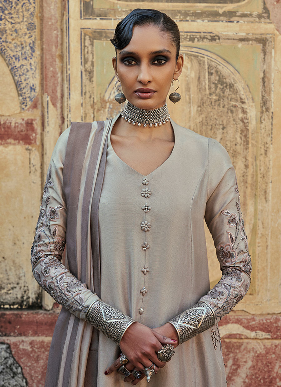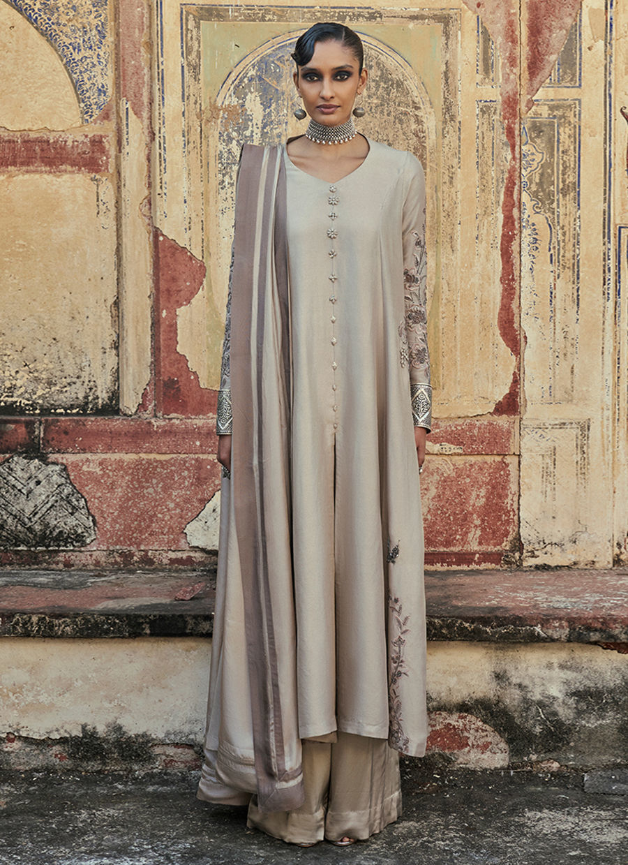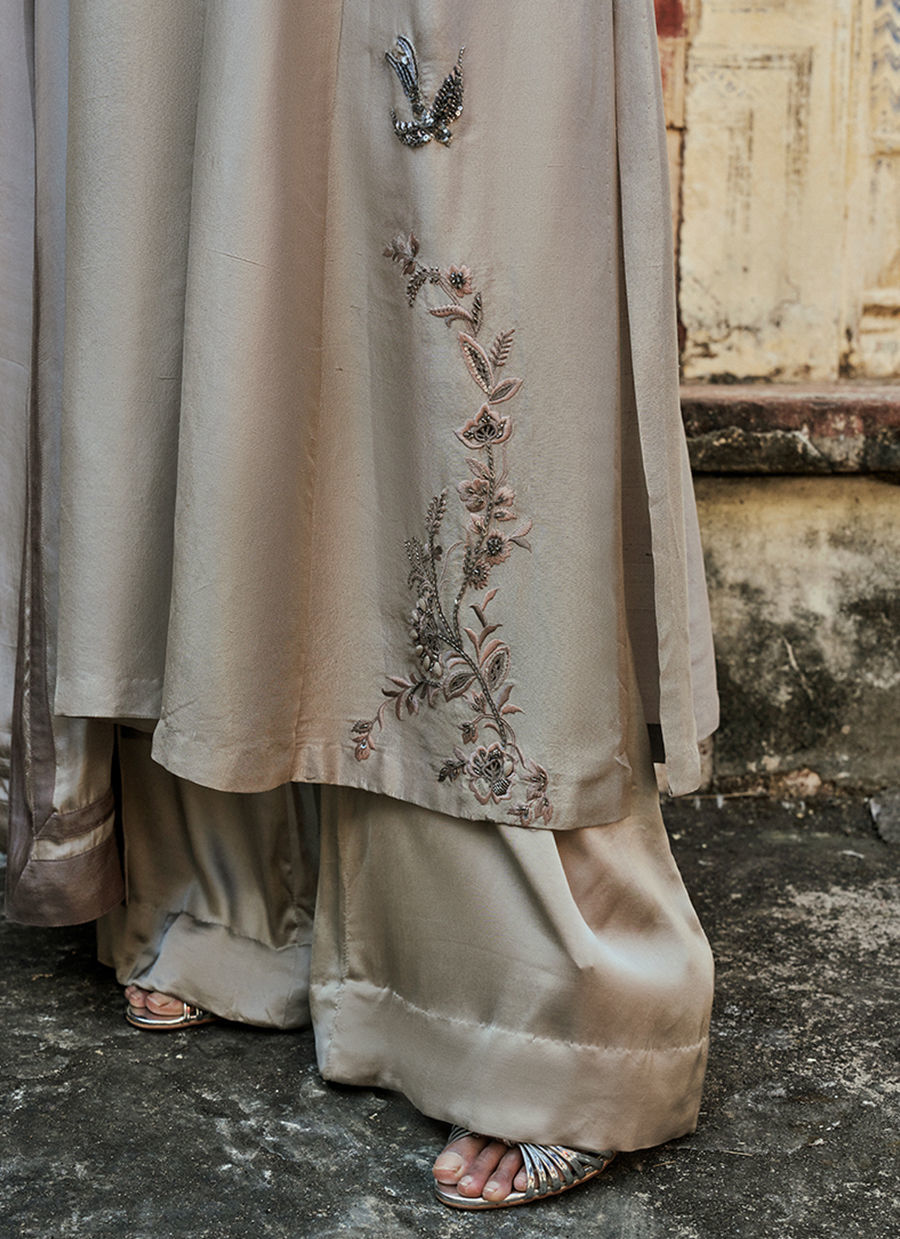 The prince-panel, front-open shirt features intricate resham embroidery, enhanced with zardozi work, sequins, cutdana, stones, pearls, delicate handmade pati work, and refined cutwork, creating a richly detailed artisanal finish. It is paired with sand beige cotton charmeuse culottes for fluid elegance and completed with a medium silk dupatta, resulting in a sophisticated ensemble perfect for festive occasions and elevated evening wear.