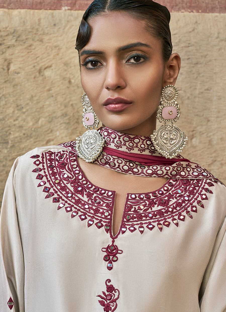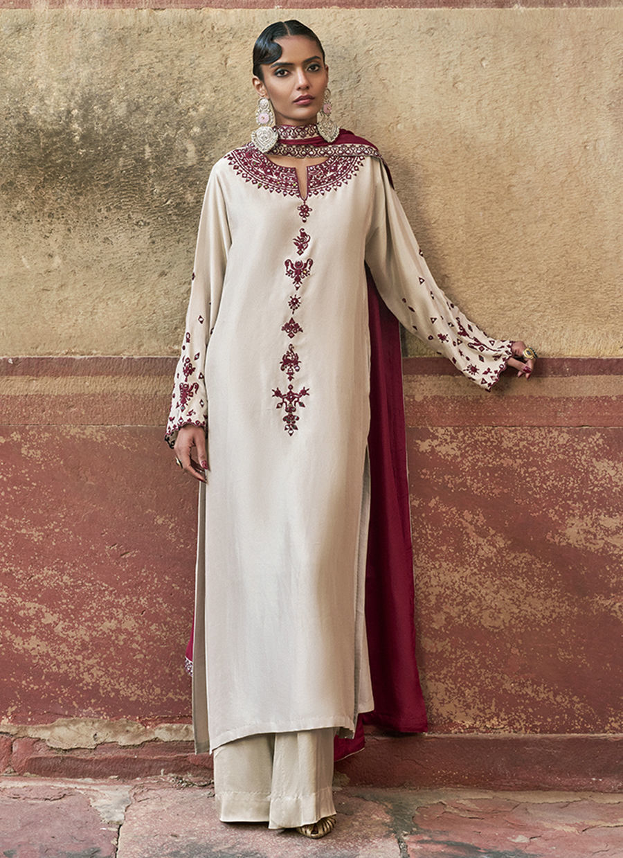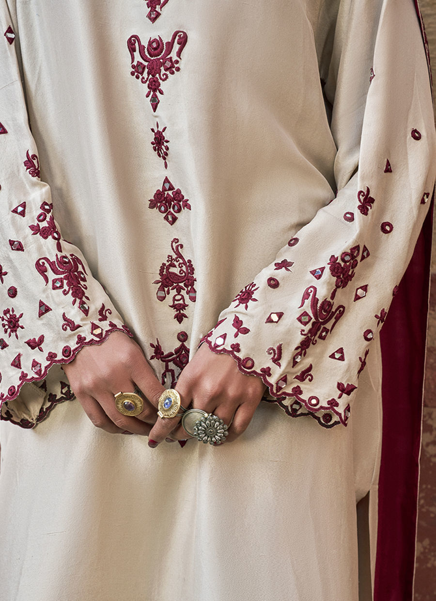 The loose-cut long shirt in birch is crafted from pure raw silk and features functional pockets, offering effortless elegance and comfort. It is paired with birch cotton charmeuse culottes for a fluid, graceful silhouette. The look is completed with a medium silk maroon dupatta, detailed with maroon resham, silver zari embroidery, and appliqué borders, adding a refined and elevated finish to this sophisticated ensemble.