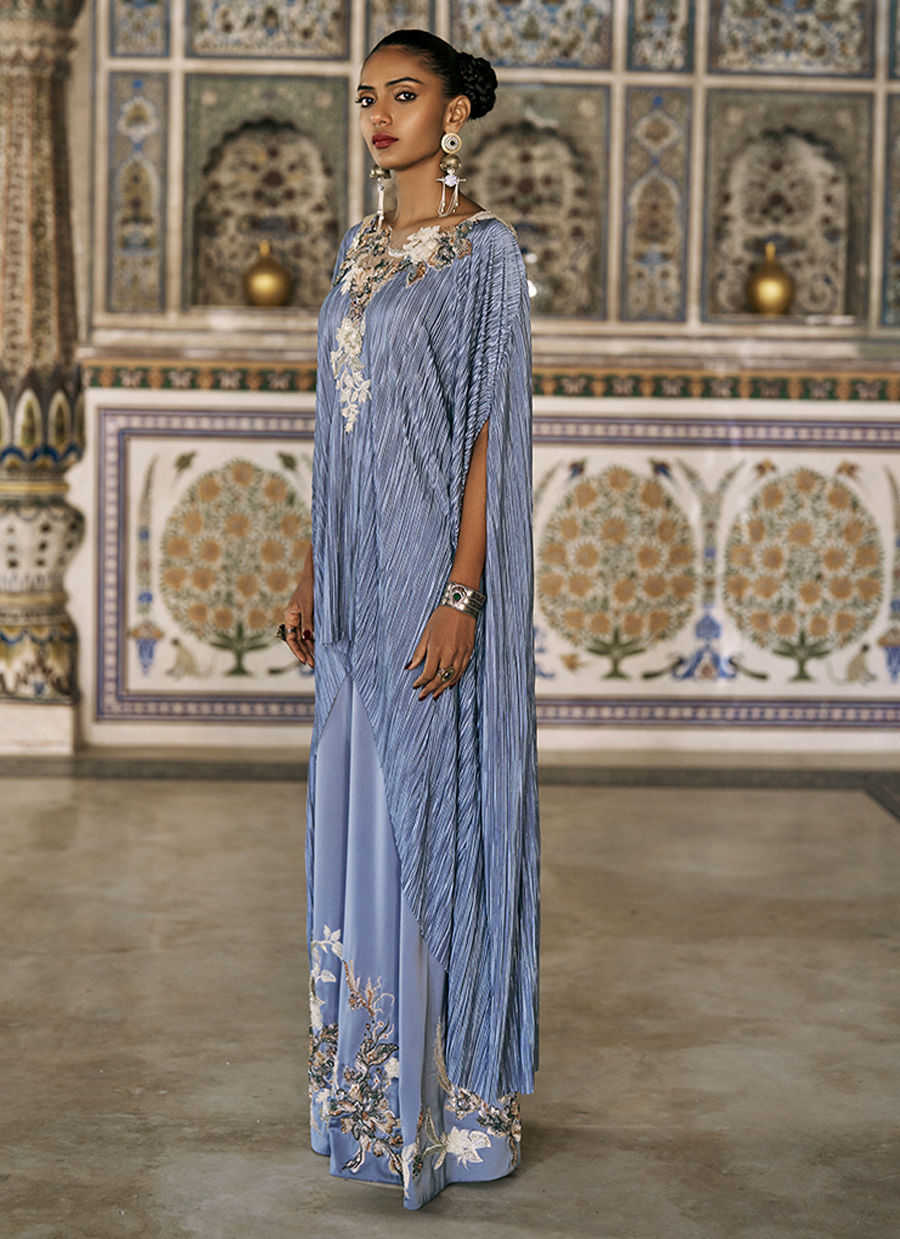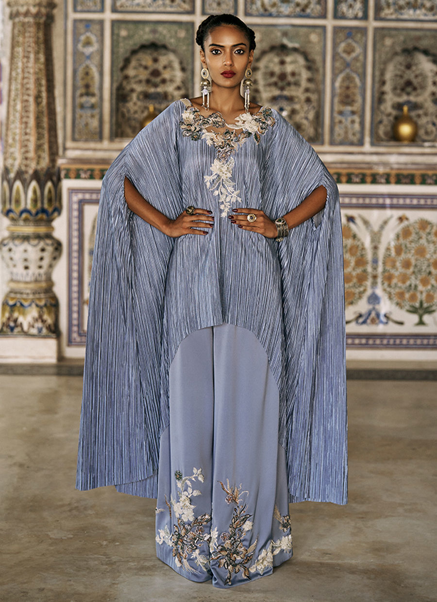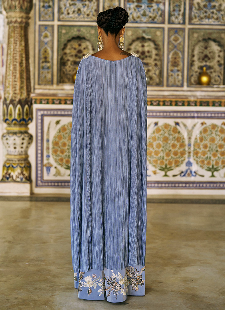 The Blue Fog high-low poncho is crafted from pleated silk and adorned with intricate colored resham, zari, and zardozi embroidery, enhanced with cutdana, sequins, crystals, and delicate 3D flowers layered over skin net for a sophisticated, dimensional effect. It is paired with cotton charmeuse culottes, beautifully detailed with matching colored resham, zari, and zardozi embroidery, as well as cutdana, sequins, crystals, and 3D floral accents, creating a cohesive and statement-making ensemble perfect for festive occasions and elevated evening wear.