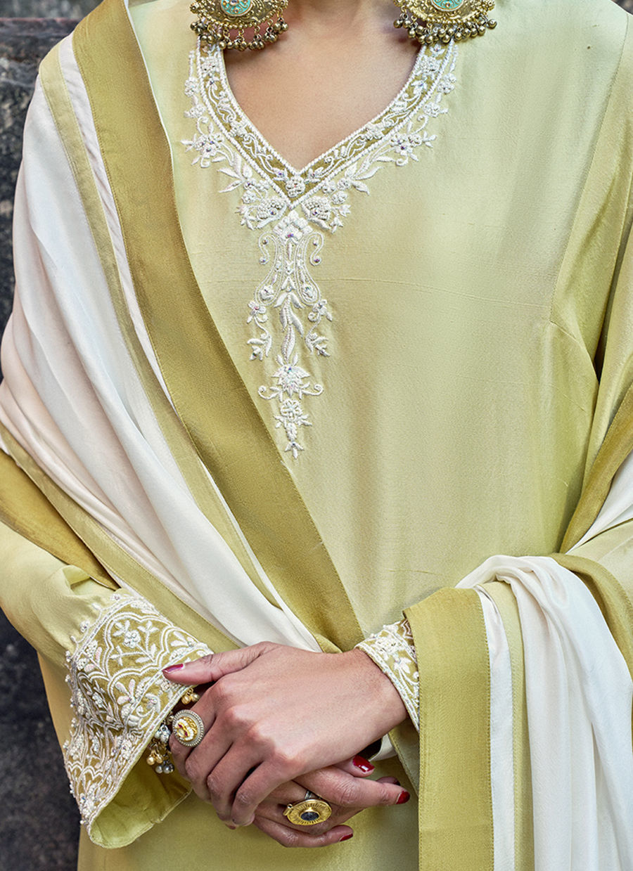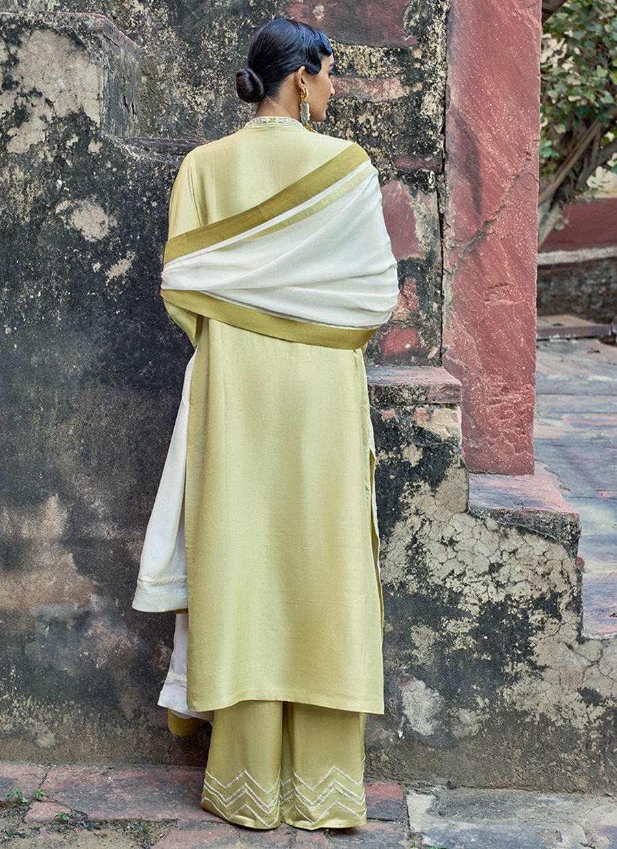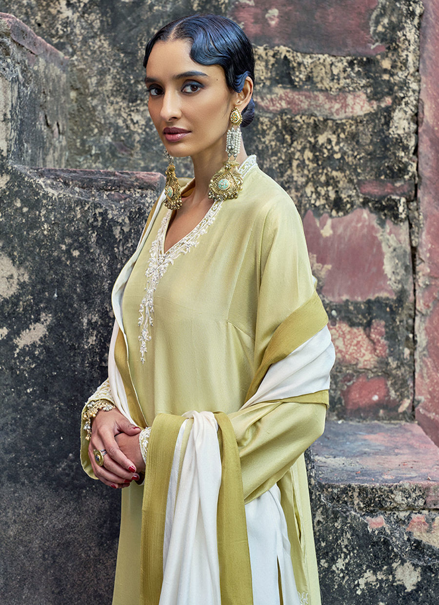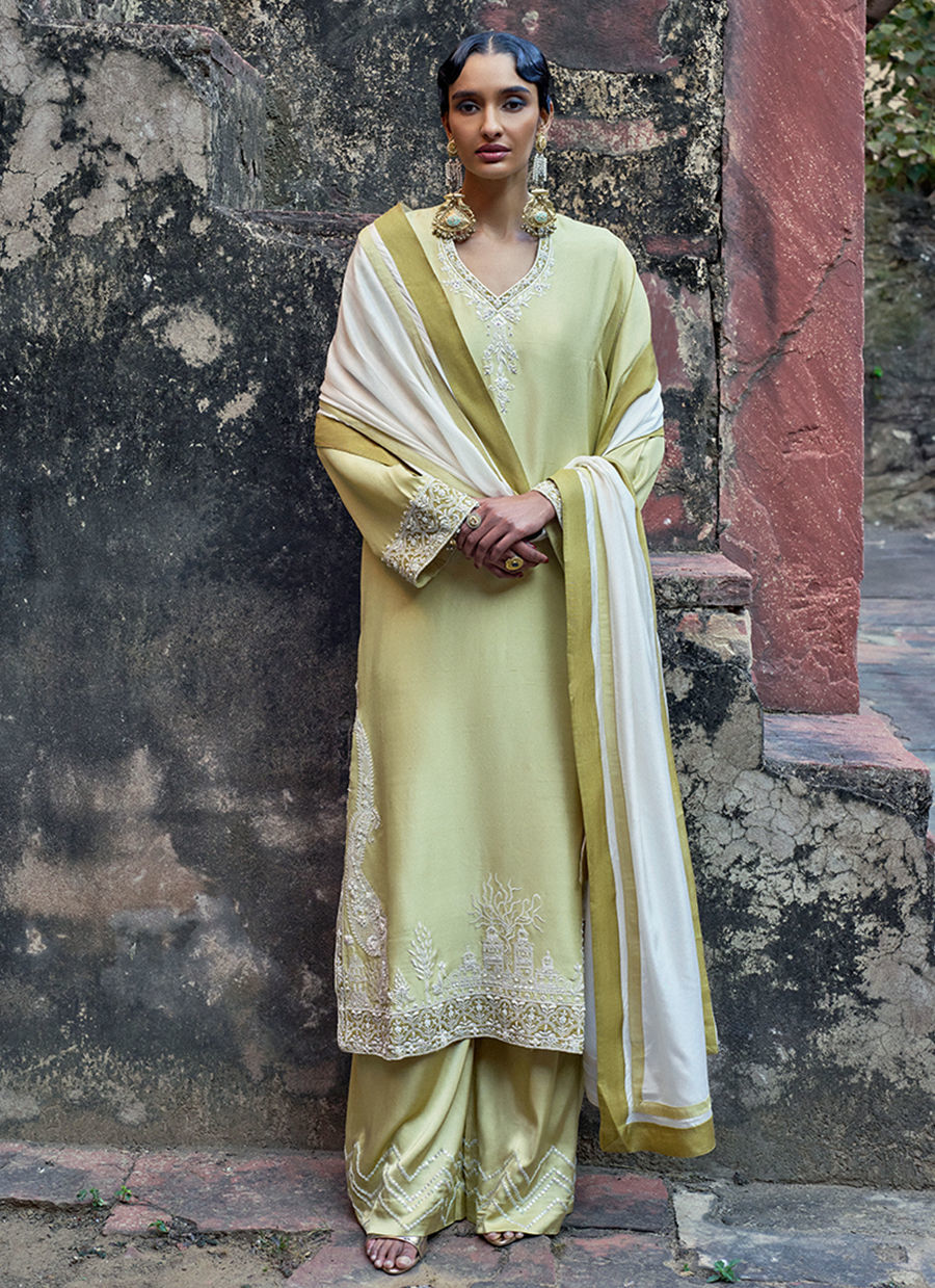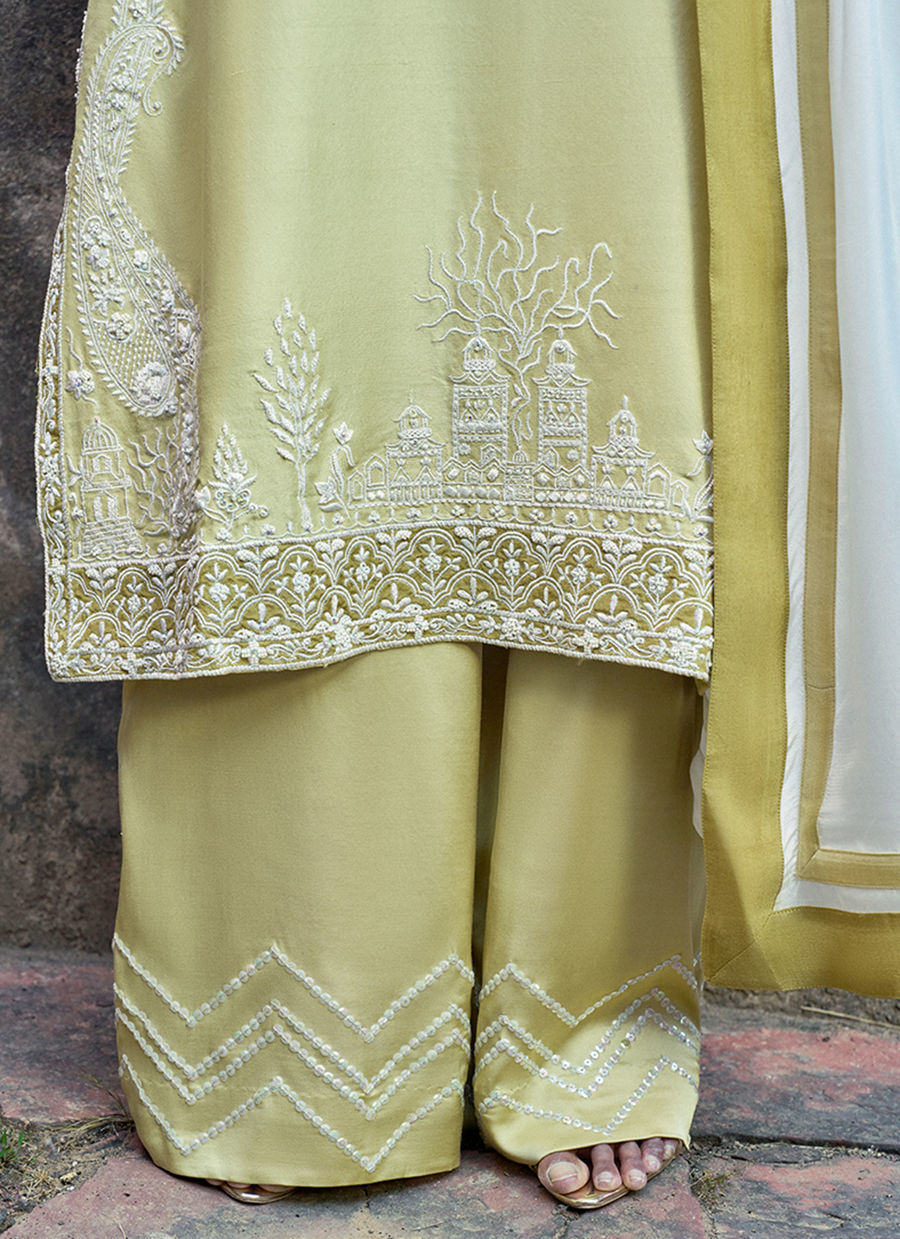 The Lemonade loose-cut long shirt, crafted from pure raw silk, features functional pockets and is adorned with intricate ivory resham and lorix embroidery, enriched with delicate handwork including pearls (moti), crystals, stones, sequins, and cutdana for a refined, artisanal finish. It is paired with cotton charmeuse culottes, detailed with a hand-embroidered sequins border, and completed with a medium silk ivory dupatta, creating an elegant and elevated ensemble perfect for festive and evening occasions.