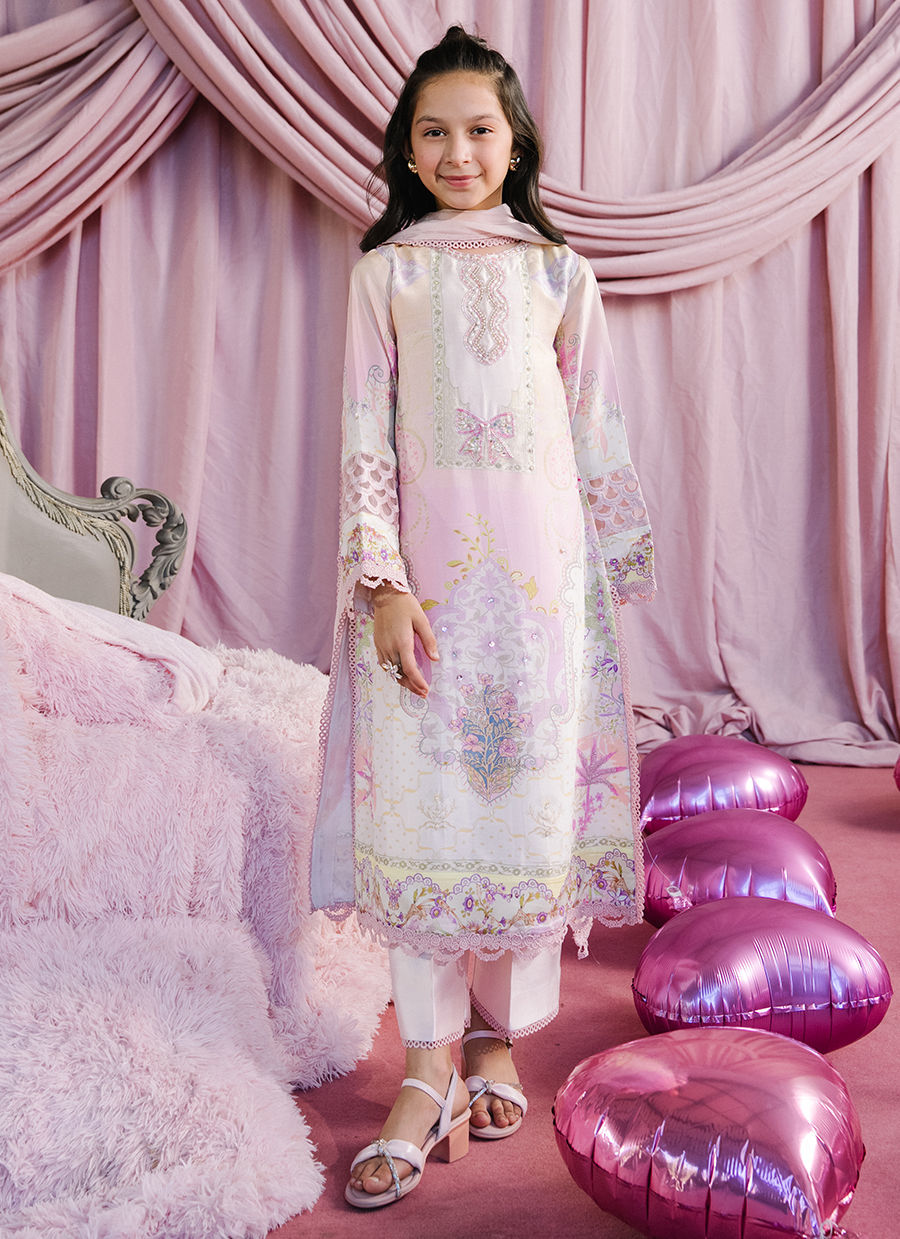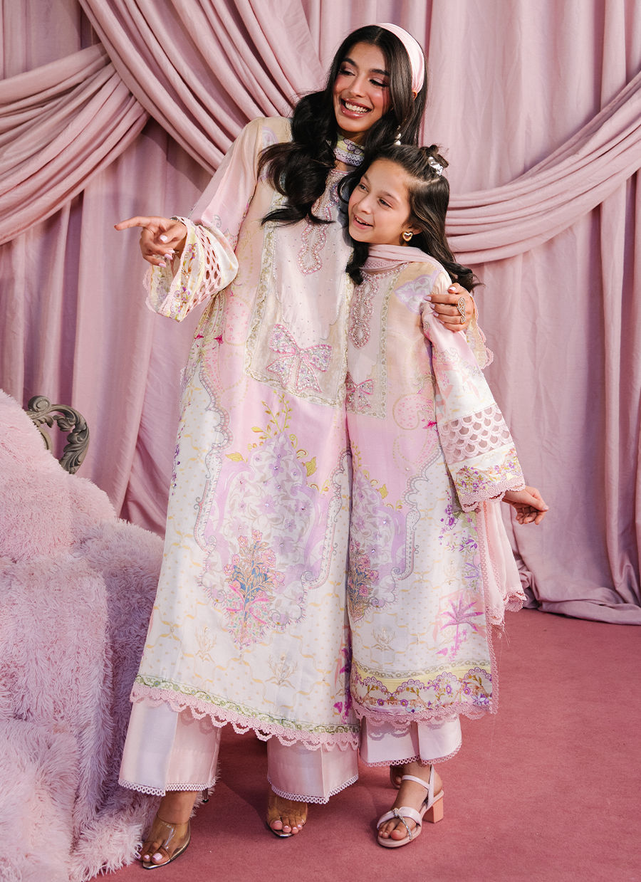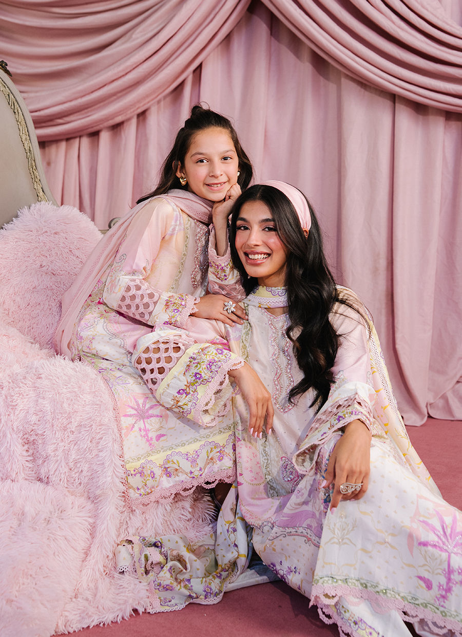 A Pink long raw silk shirt adorned with chunky pearl embellishments along the neckline, complemented by delicate cut-dana and sequin detailing across the shirt. Styled with Sheesha silk izar pants and a printed medium silk dupatta, completing the look with effortless elegance.