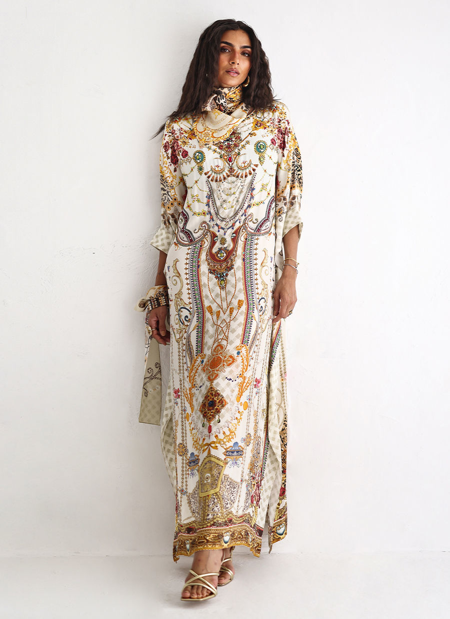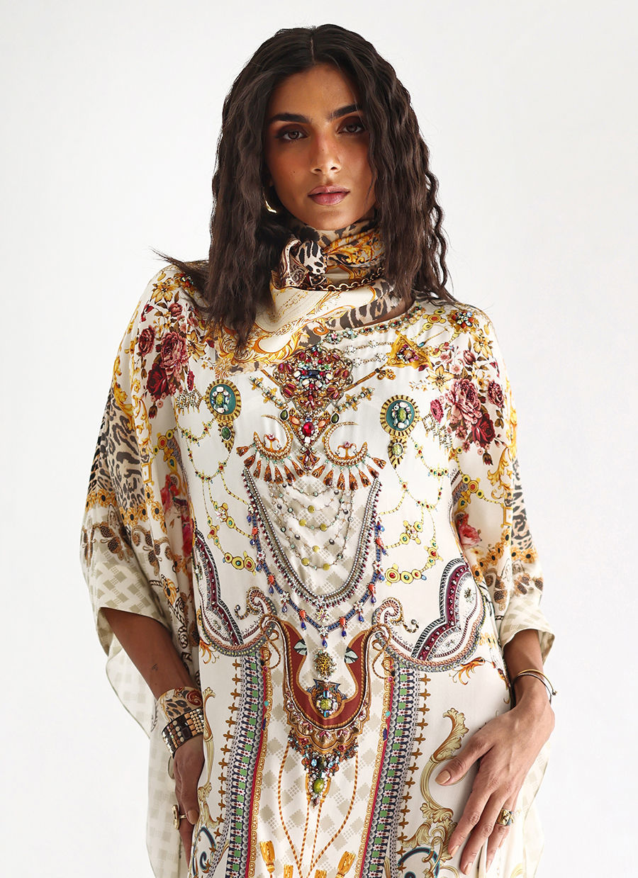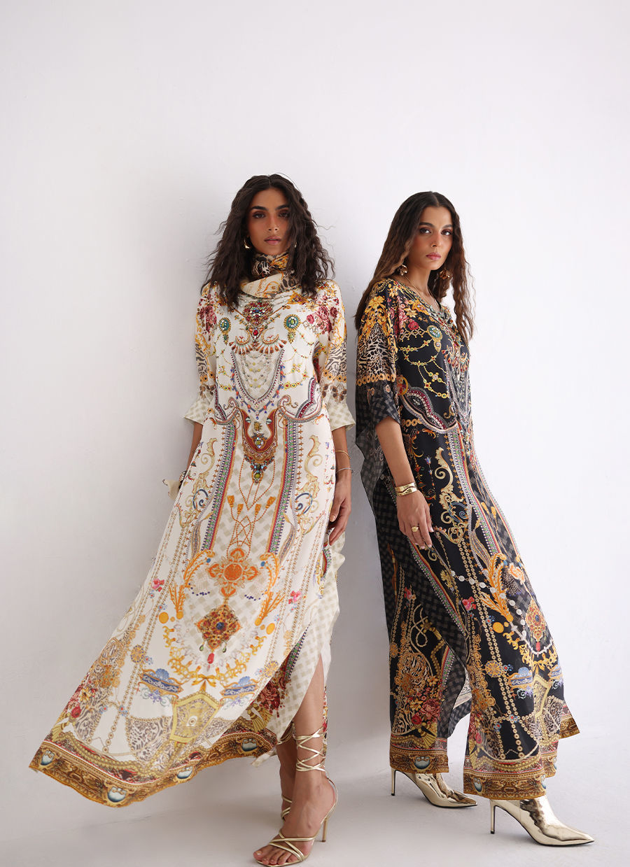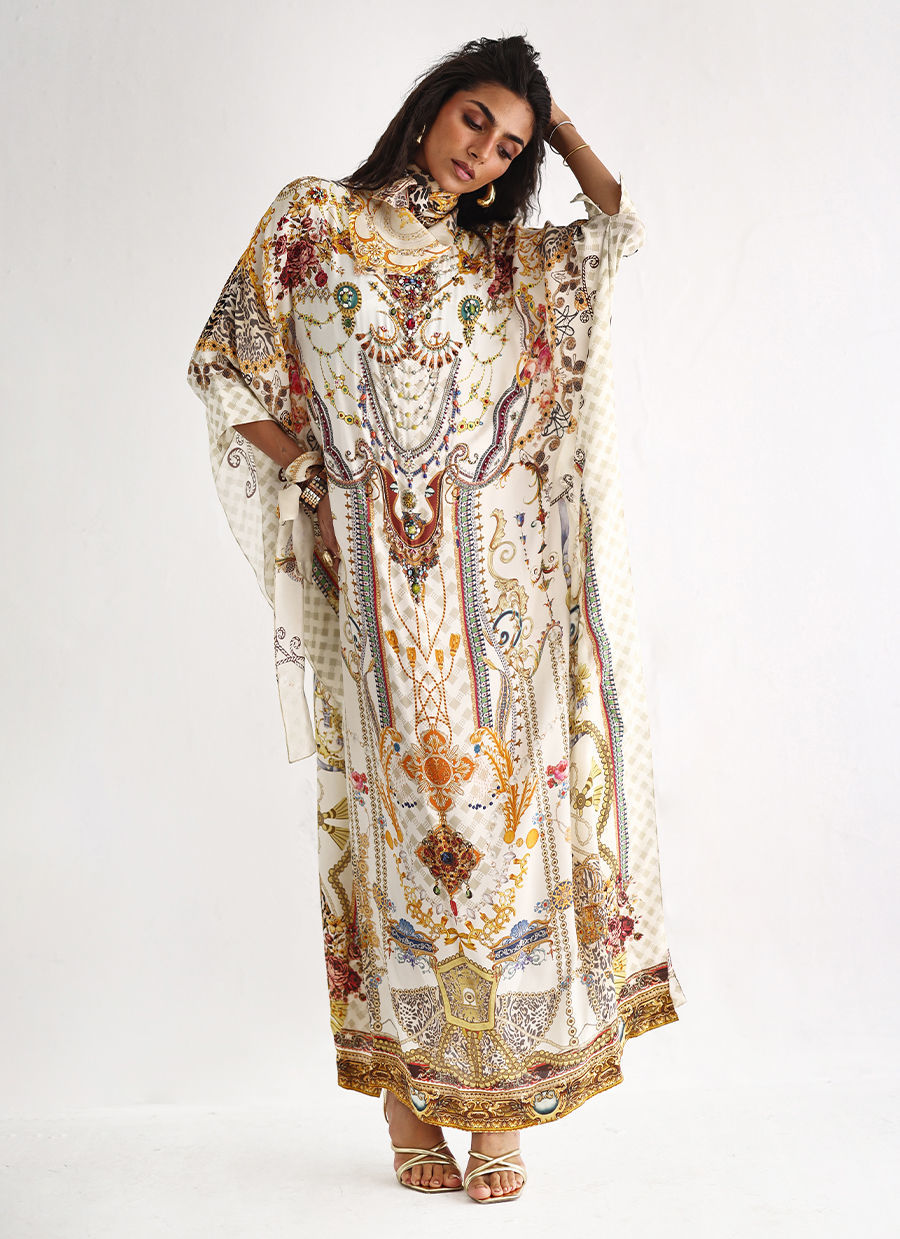 This statement kaftan features a striking digital print, elevated with intricate hand embellishments. Detailed with imported colored stones, textured stones, cutdana, metals, crystals, sequins, and delicate 3D flowers, the design reflects exceptional craftsmanship and depth. A perfect blend of modern elegance and artisanal detailing, this kaftan is ideal for festive evenings and elevated celebrations.