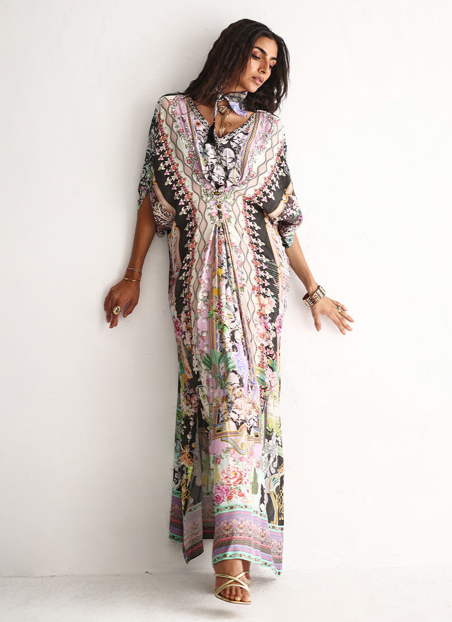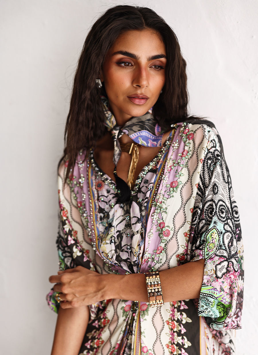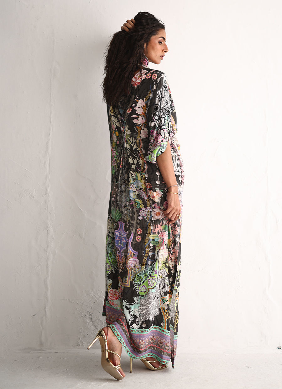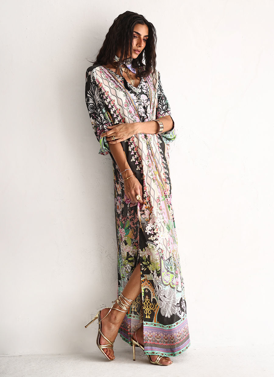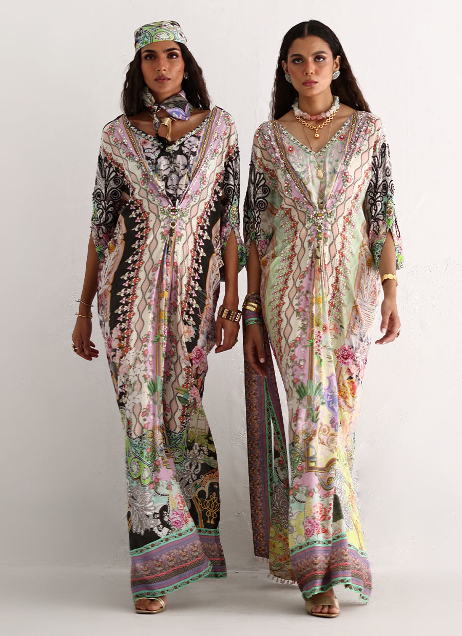 This kaftan is crafted from pure crepe and features a captivating digital print, elevated with delicate hand embellishments. Imported colored stones, textured stones, cutdana, sequins, and pearls add subtle sparkle and depth. Designed for effortless elegance, it’s an ideal choice for festive occasions and elevated evening wear.
