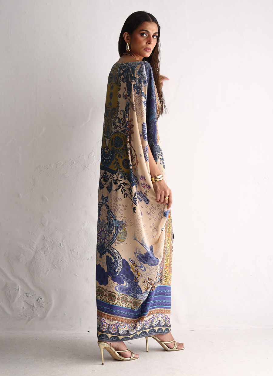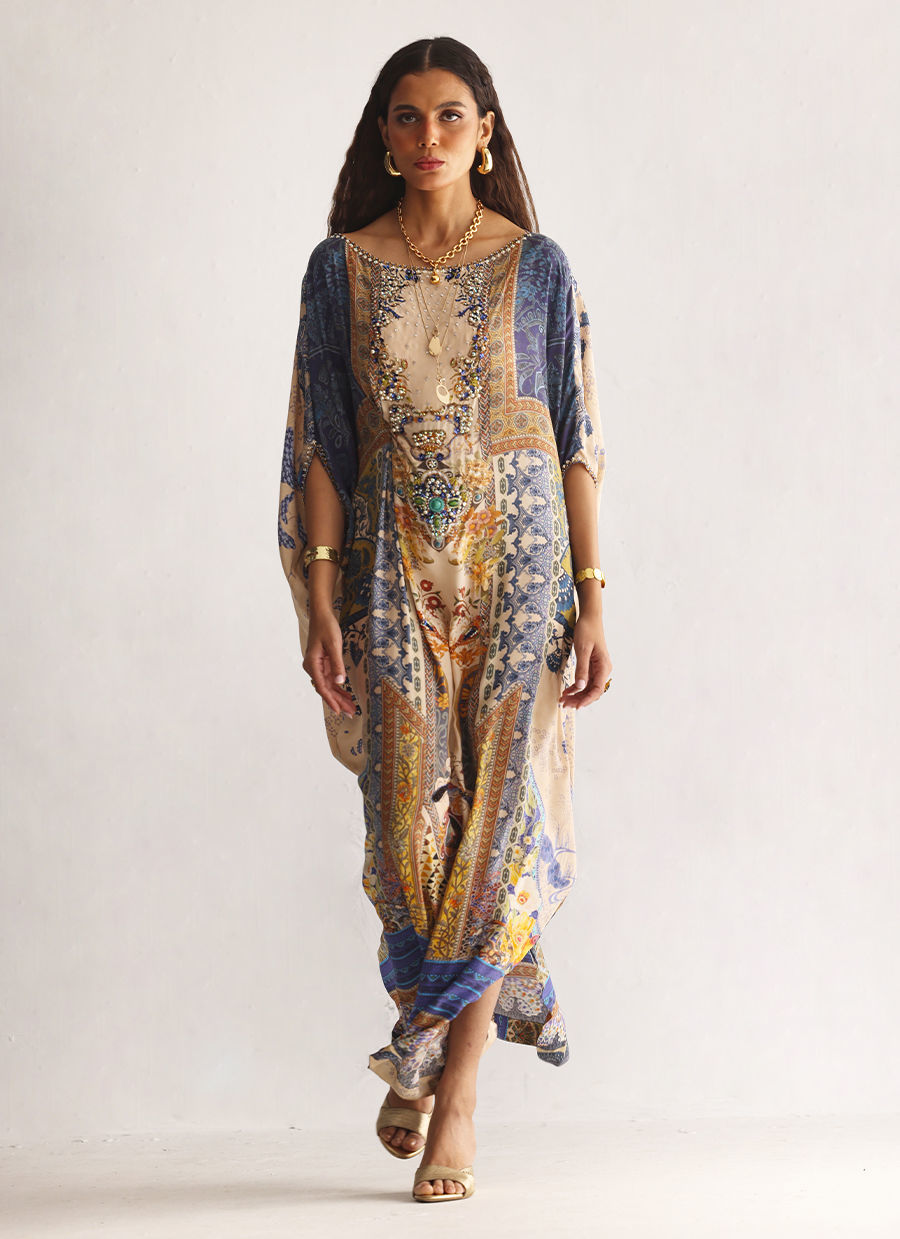 This kaftan features a striking digital print, elevated with intricate hand embellishments. Imported colored stones, textured stones, cutdana, sequins, luminous pearls, and crystals come together to add depth and refined sparkle. Designed for effortless elegance, this statement kaftan is perfect for festive occasions and evening wear.