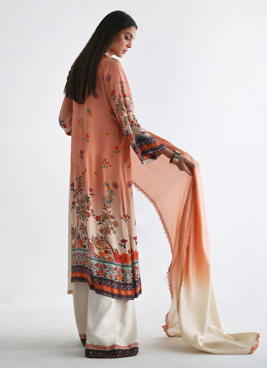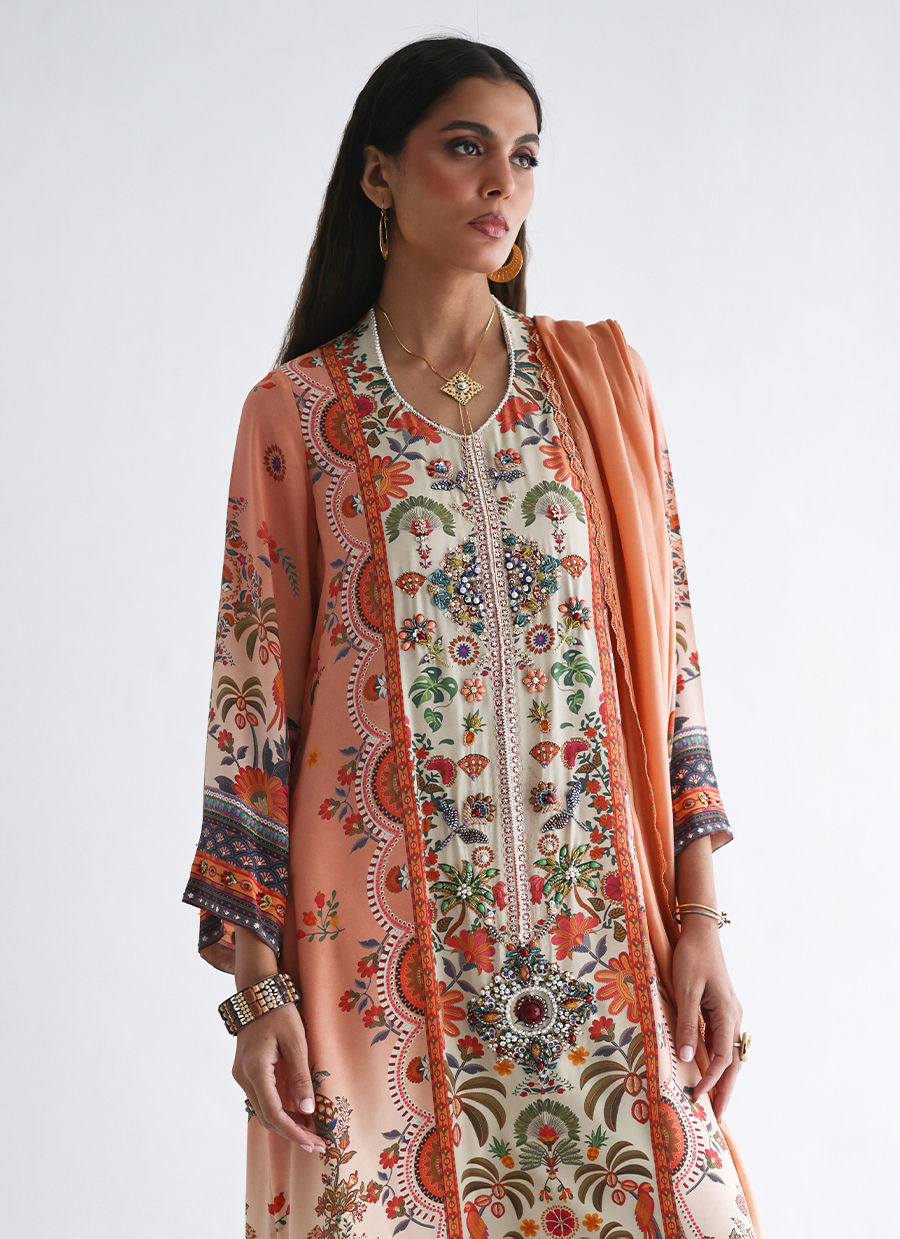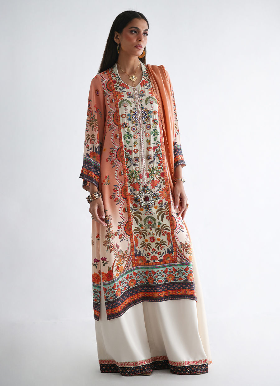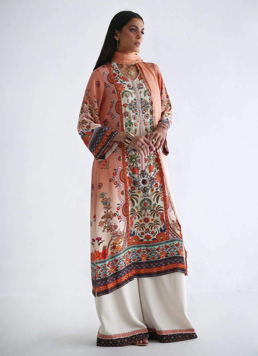 The shirt features a refined digital print, elevated with intricate hand embellishments of imported colored stones, textured sequins, cutdana, pearls, and crystals, adding subtle sparkle and depth. It is paired with fluid cotton charmeuse culottes, finished with beautifully printed borders at the hem for a contemporary touch. The look is completed with a pure medium silk dupatta in a soft coral and ivory ombré, detailed with delicate lace for an effortlessly elegant finish.