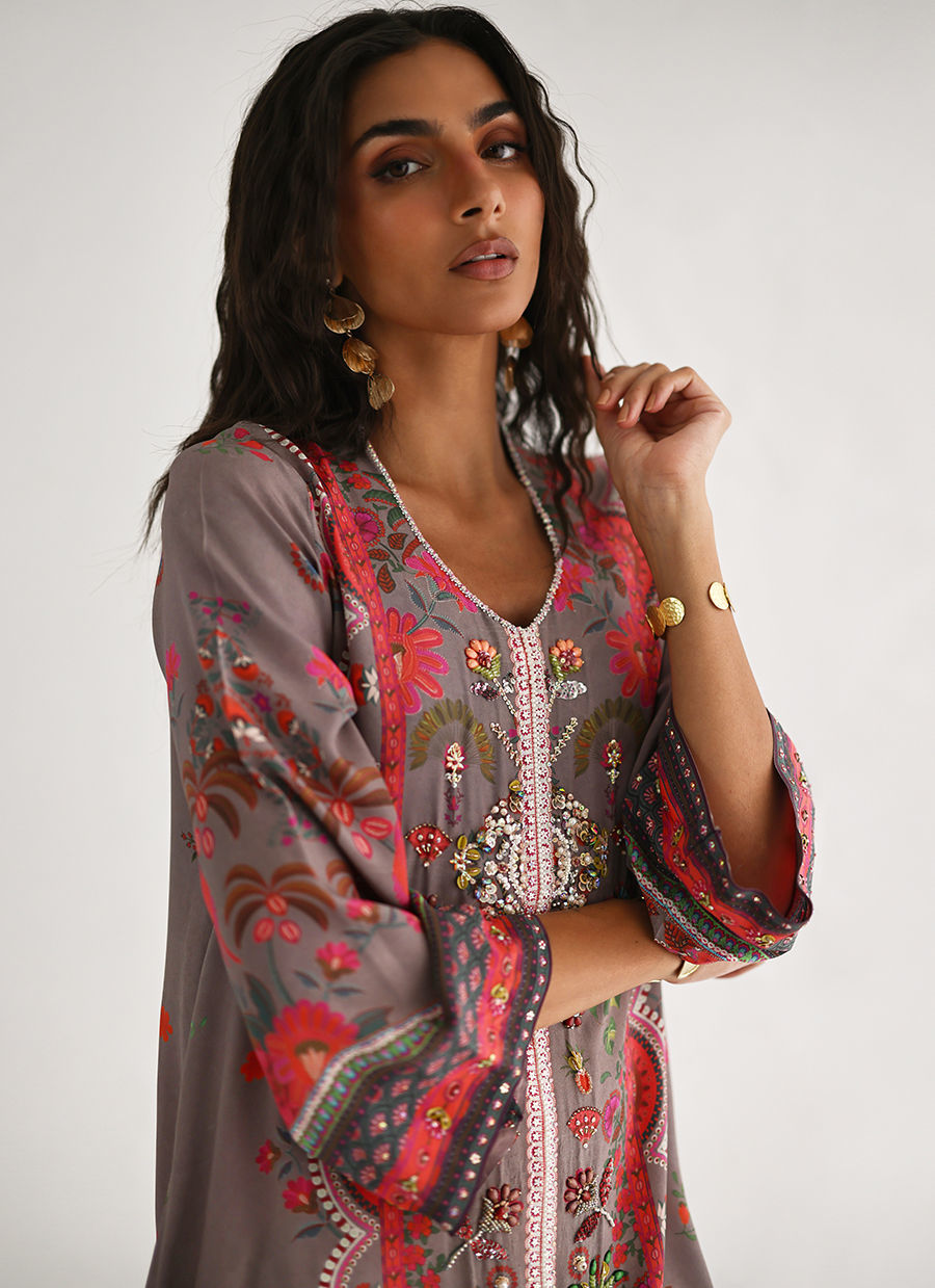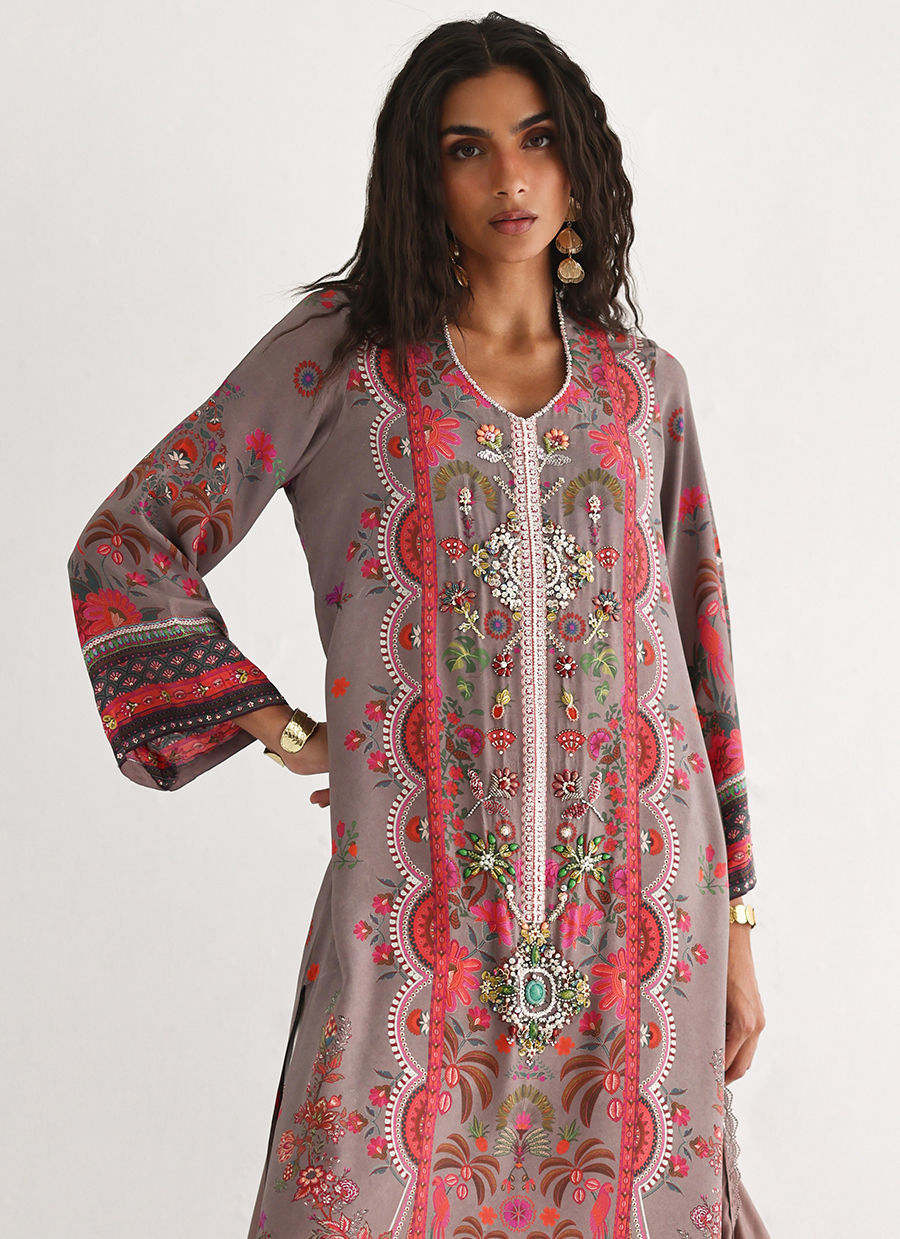 Color: Shirt: Cinder Grey, Culottes: Ivory Fabric: Shirt: Pure Crepe, Culottes: Cotton Charmeuse, Dupatta: Pure Medium Silk Work Details: Digital Printed and Embellished