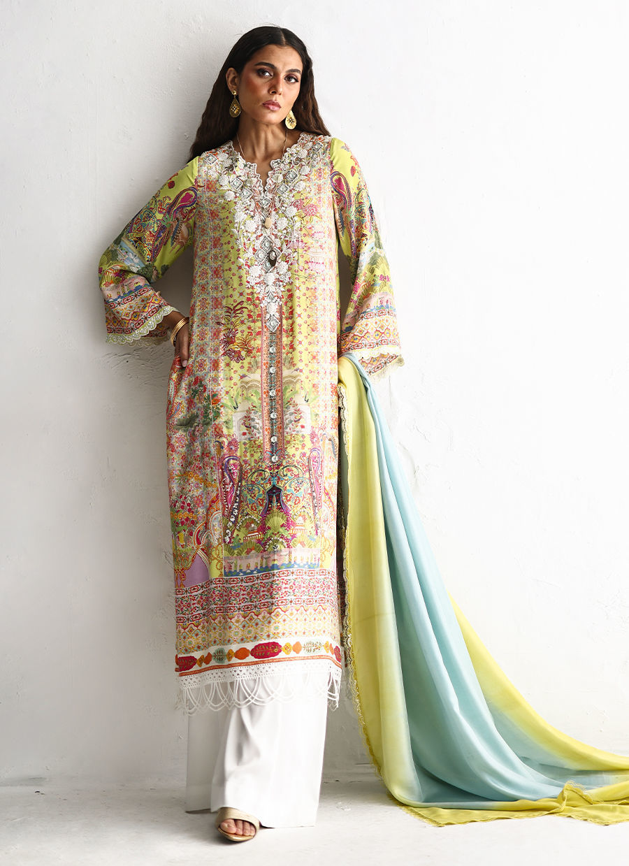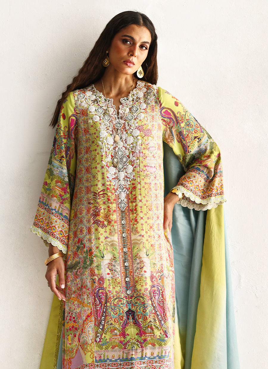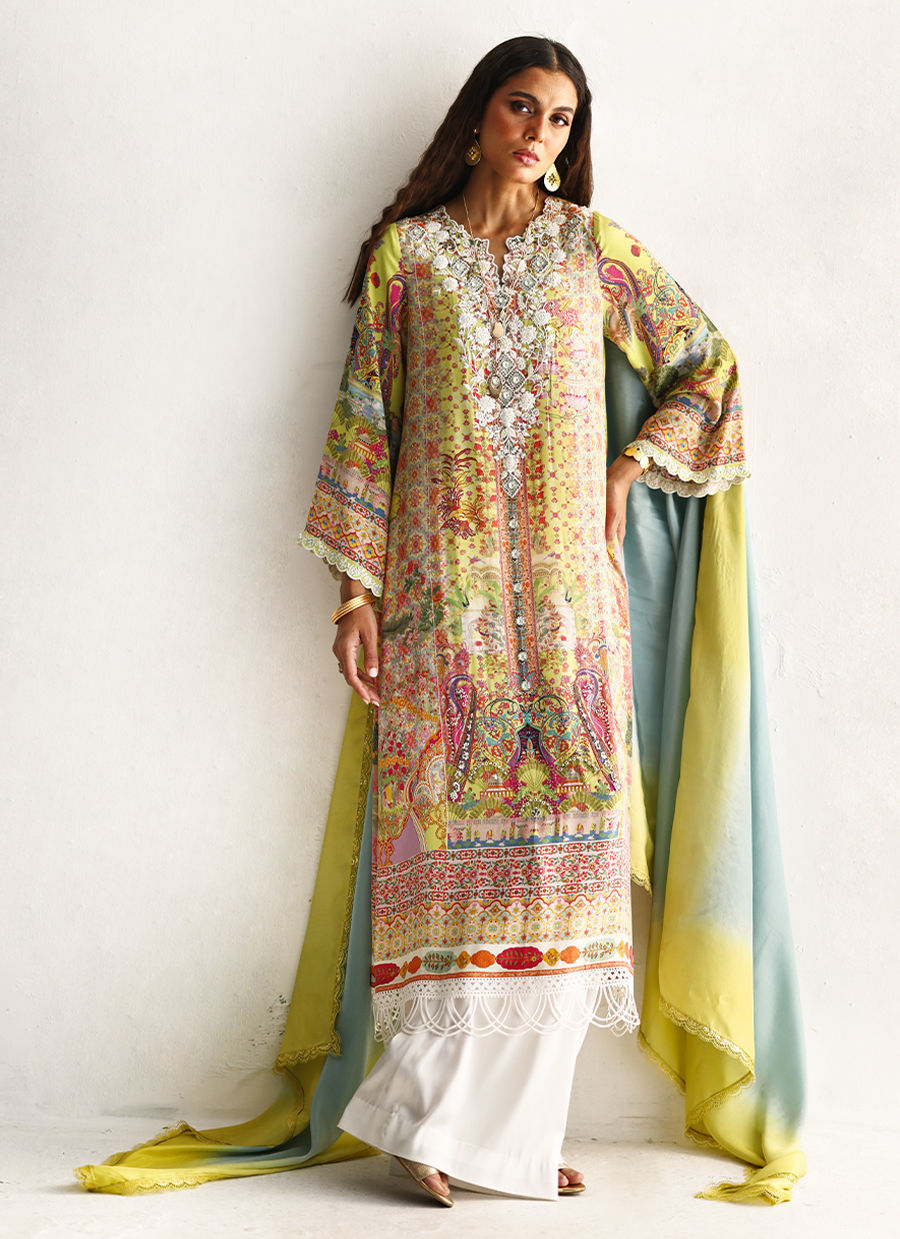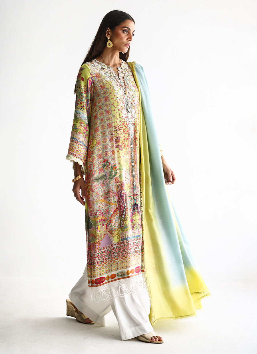 The shirt showcases a delicate digital print, enhanced with milky white embroidery and intricate embellishments of imported colored stones, textured sequins, cutdana, and pearls, creating a refined, artisanal appeal. Designed with functional pockets for effortless wearability, it is paired with fluid cotton charmeuse culottes for graceful movement. The ensemble is completed with a pure medium silk dupatta in soft lime and dusty blue hues, finished with delicate lace for an elegant and elevated finish.