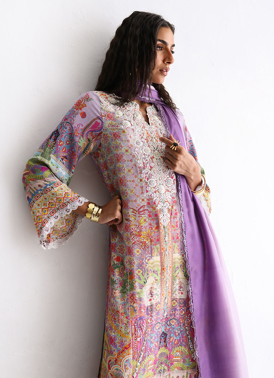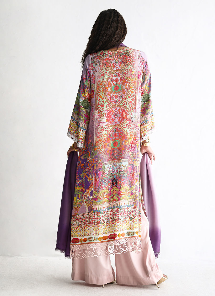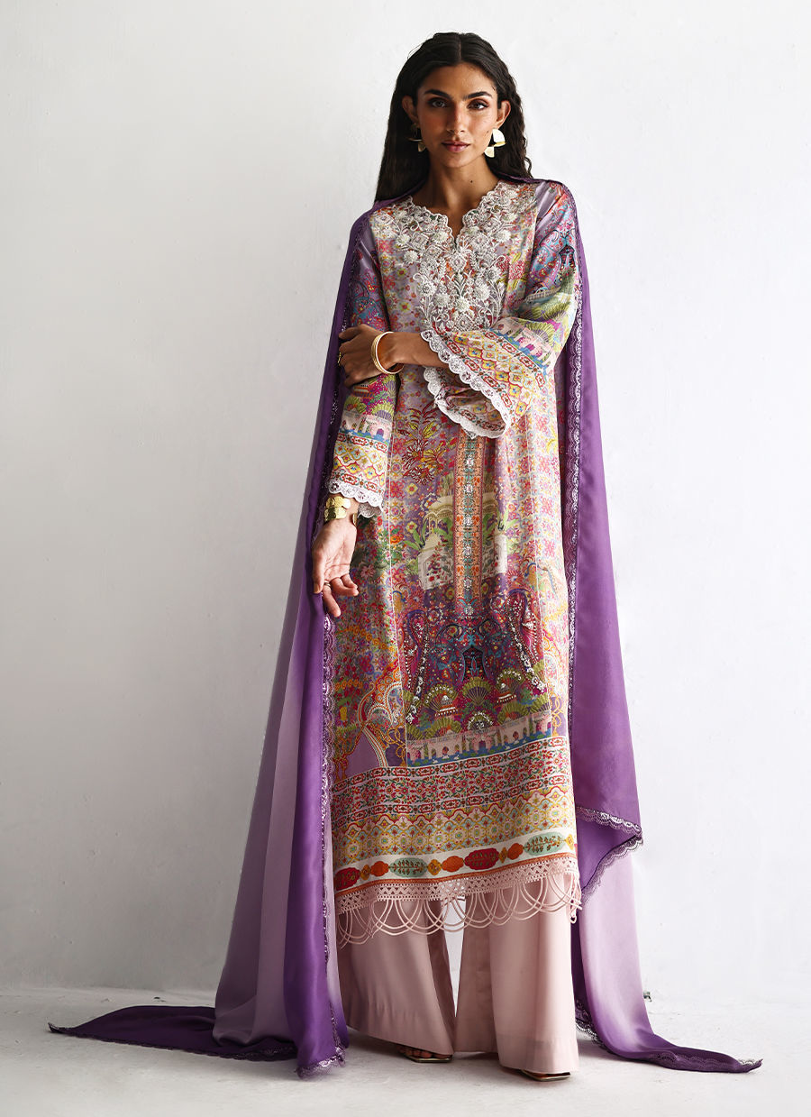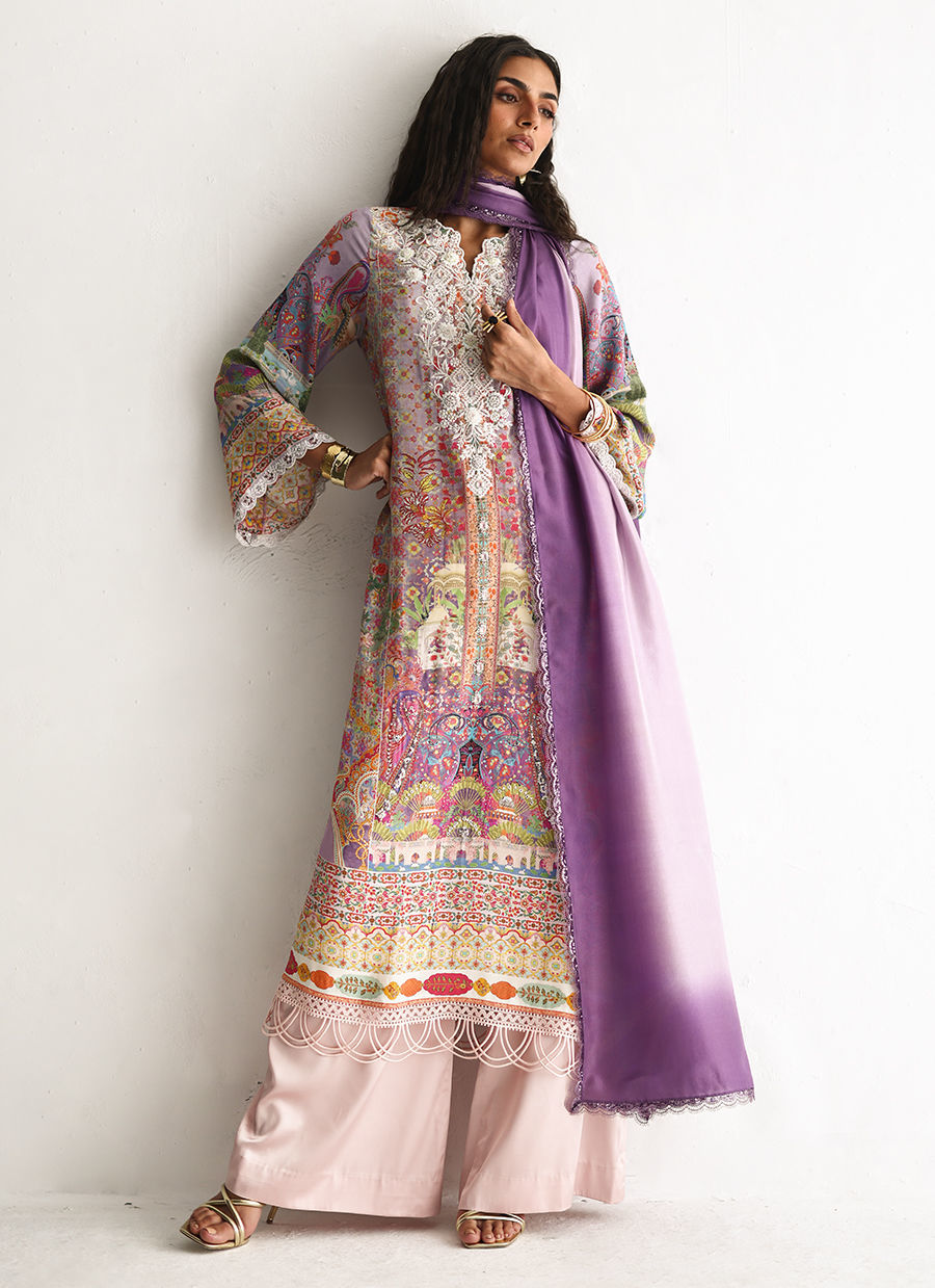 The shirt features a delicate digital print enhanced with milky white embroidery and hand embellishments of imported colored stones, textured sequins, cutdana, and pearls, creating a sophisticated, artisanal finish and has pockets. It is paired with fluid cotton charmeuse culottes for effortless comfort and style. The ensemble is completed with a pure medium silk dupatta in soft light and dark lilac shades, delicately shaded and finished with elegant lace for a graceful, elevated look.