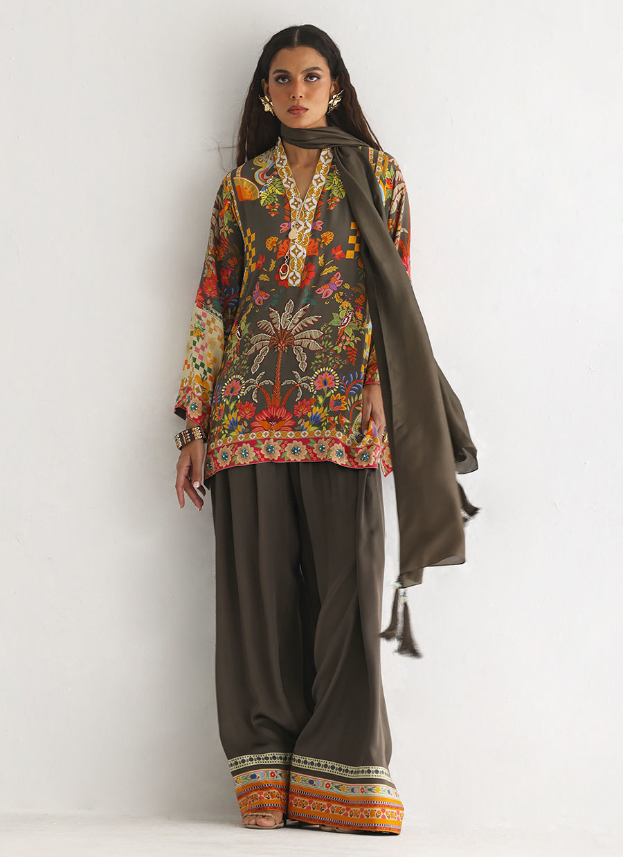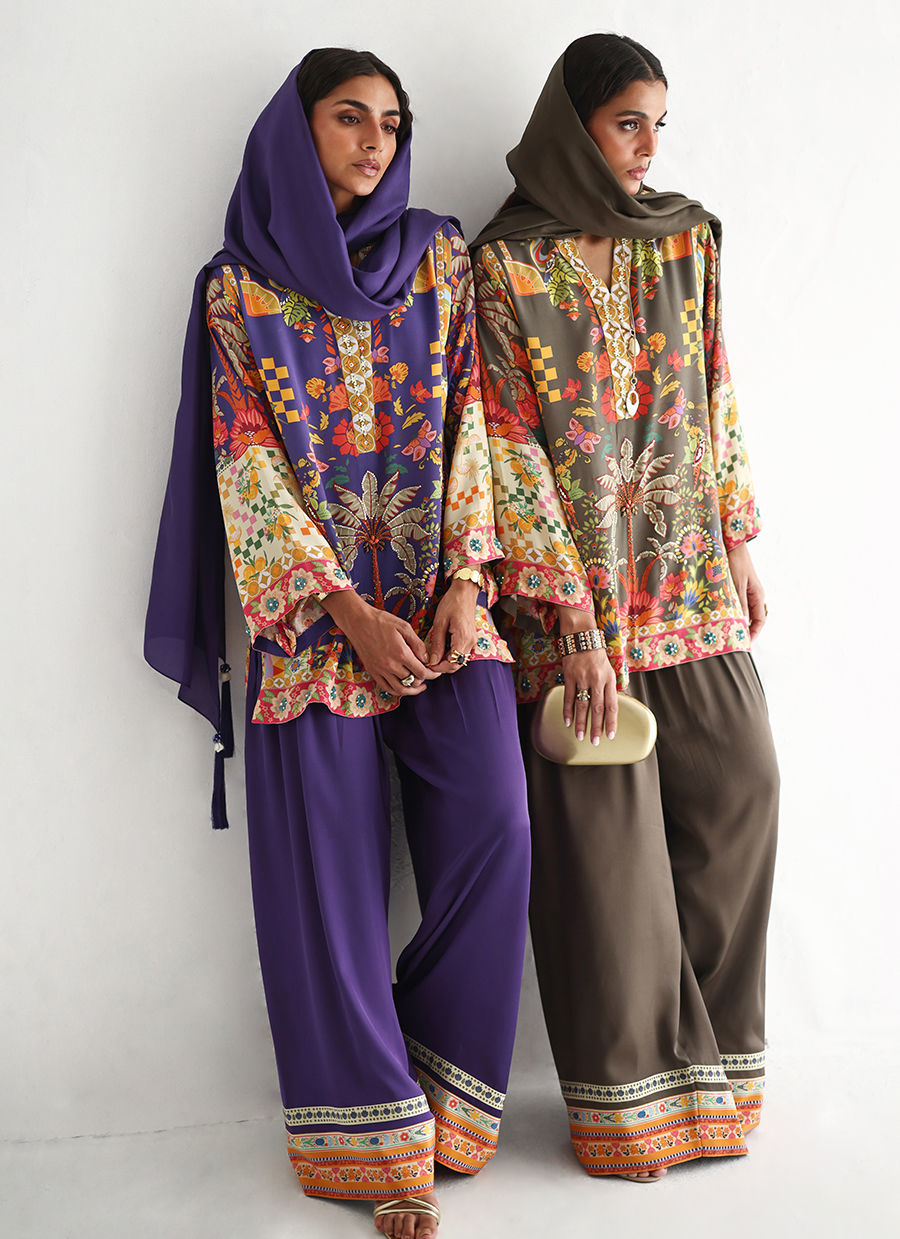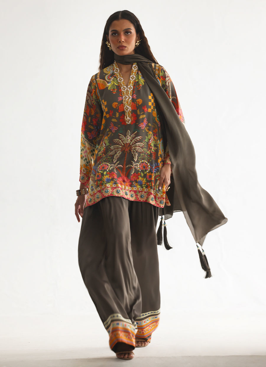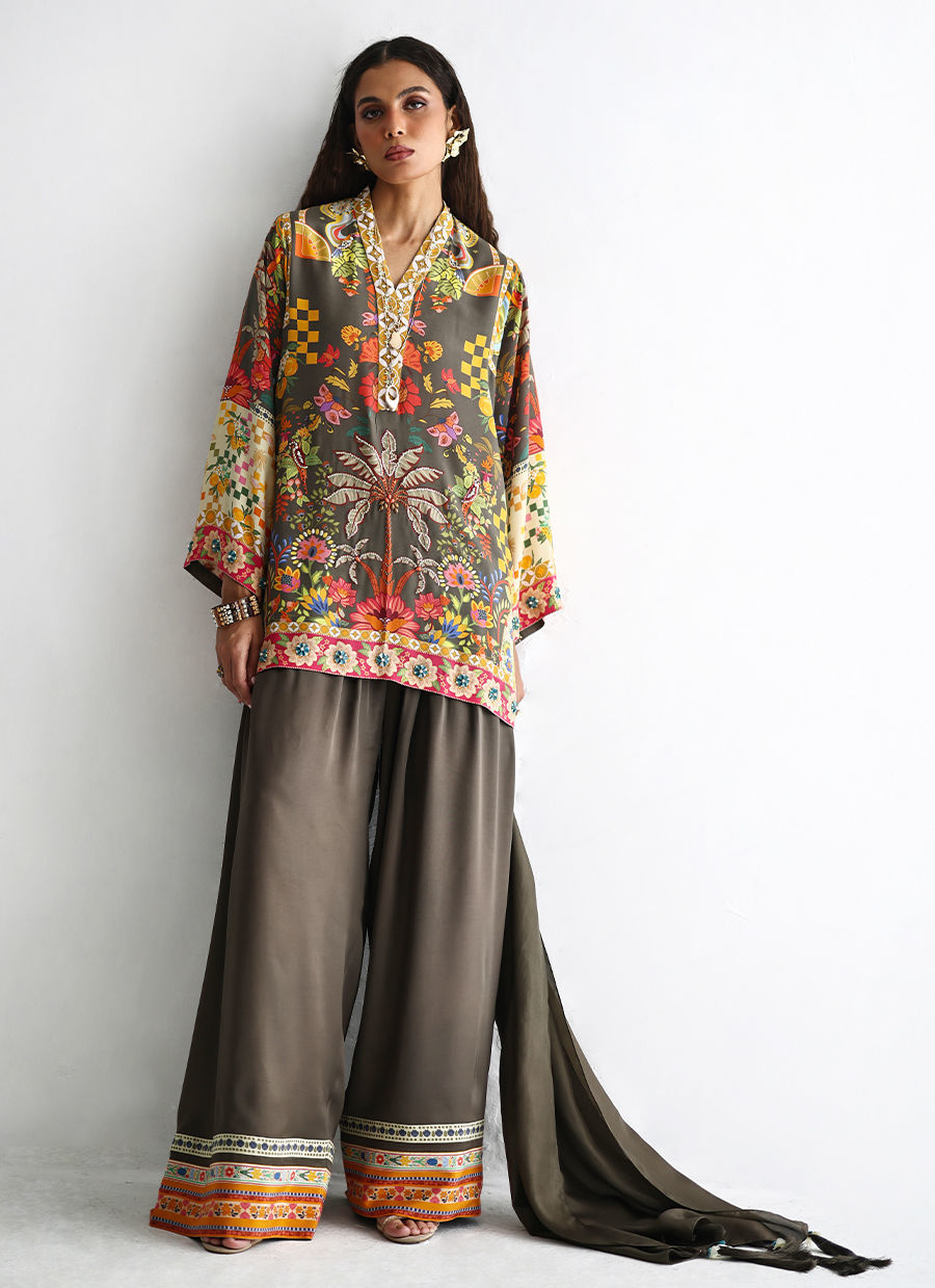 This lose cut shirt with pockets features a vibrant digital print, beautifully enhanced with intricate hand embellishments including imported colored stones, 3D flowers, textured sequins, cutdana, and pearls (moti), creating a rich and artisanal finish. It is paired with farshi-style cotton charmeuse culottes, detailed with printed borders at the hem for a contemporary touch. The look is completed with a pure medium silk stole, finished with delicate handmade tassel hangings, adding an effortless elegance to this statement ensemble.