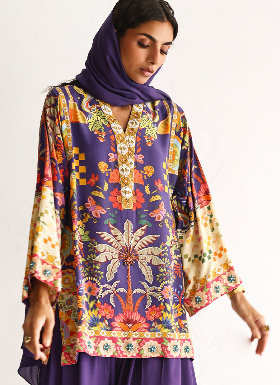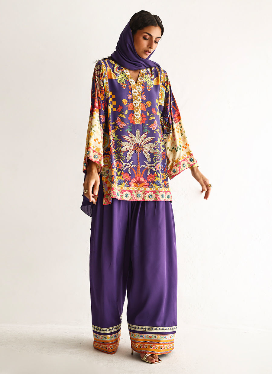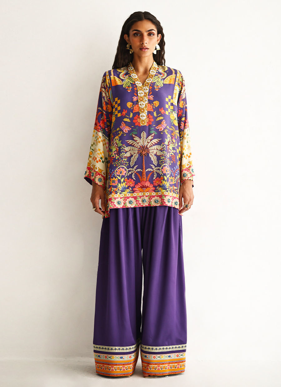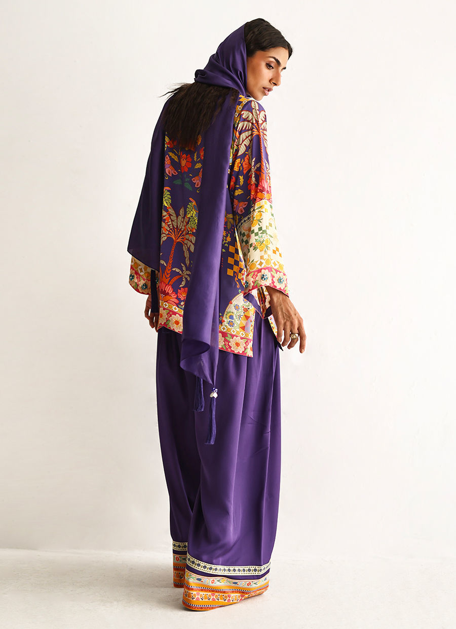 This lose cut shirt with pockets features a vibrant digital print, enhanced with exquisite hand embellishments of imported colored stones, 3D flowers, textured sequins, cutdana, and pearls (moti), creating a rich and artisanal appeal. It is paired with farshi-style cotton charmeuse culottes, adorned with printed borders at the hem for a contemporary finish. Completing the look is a medium silk stole, detailed with delicate handmade tassel hangings, adding effortless elegance to this statement ensemble.