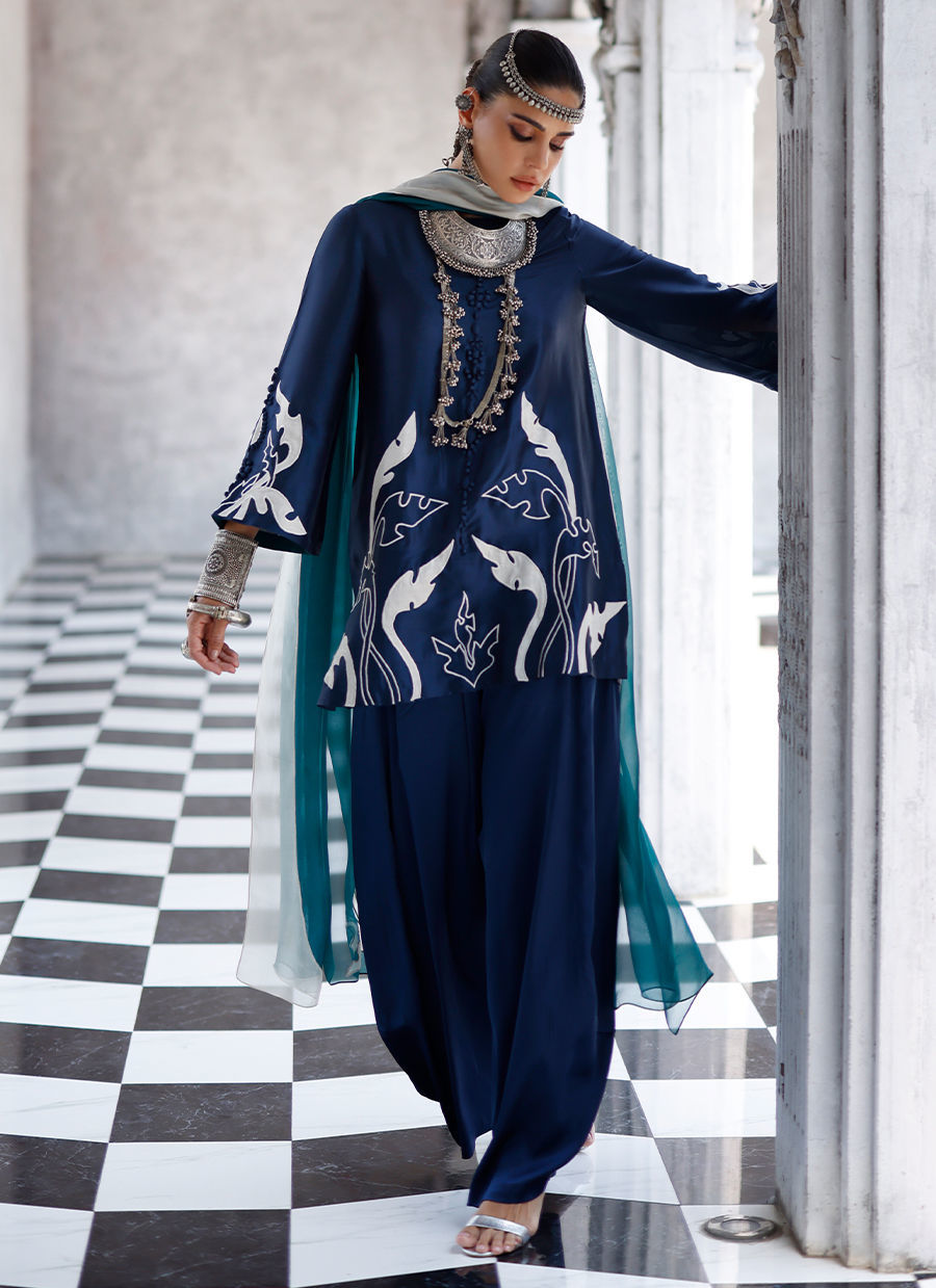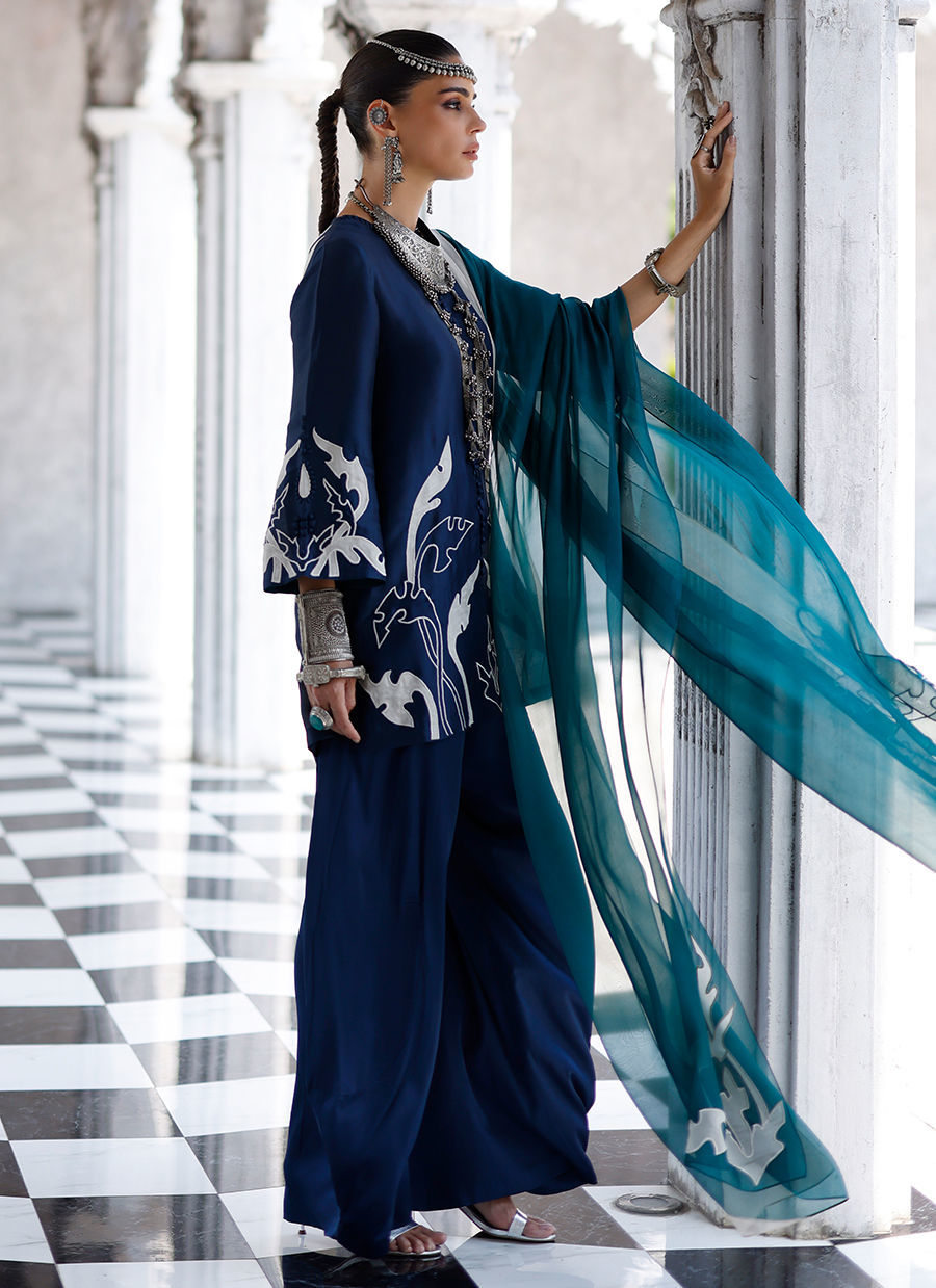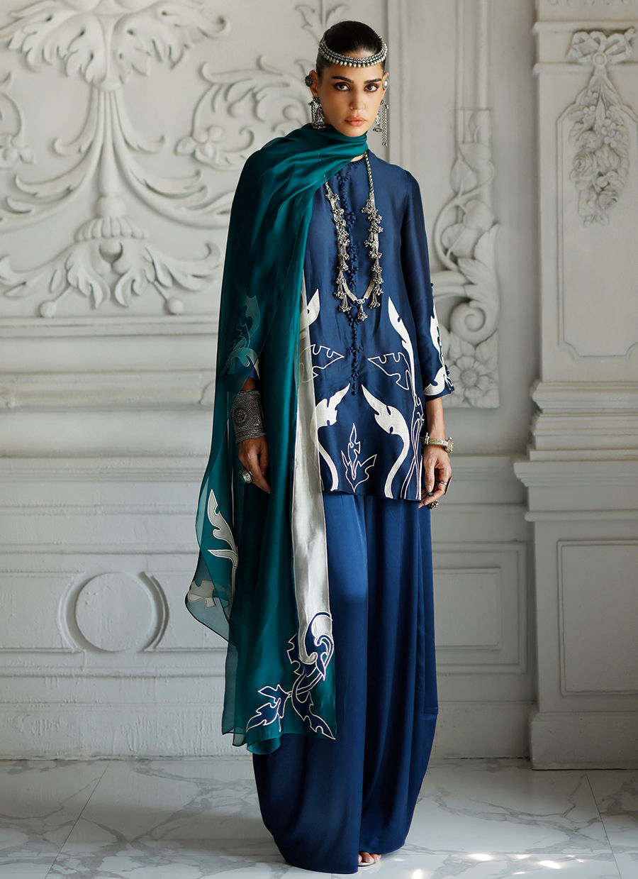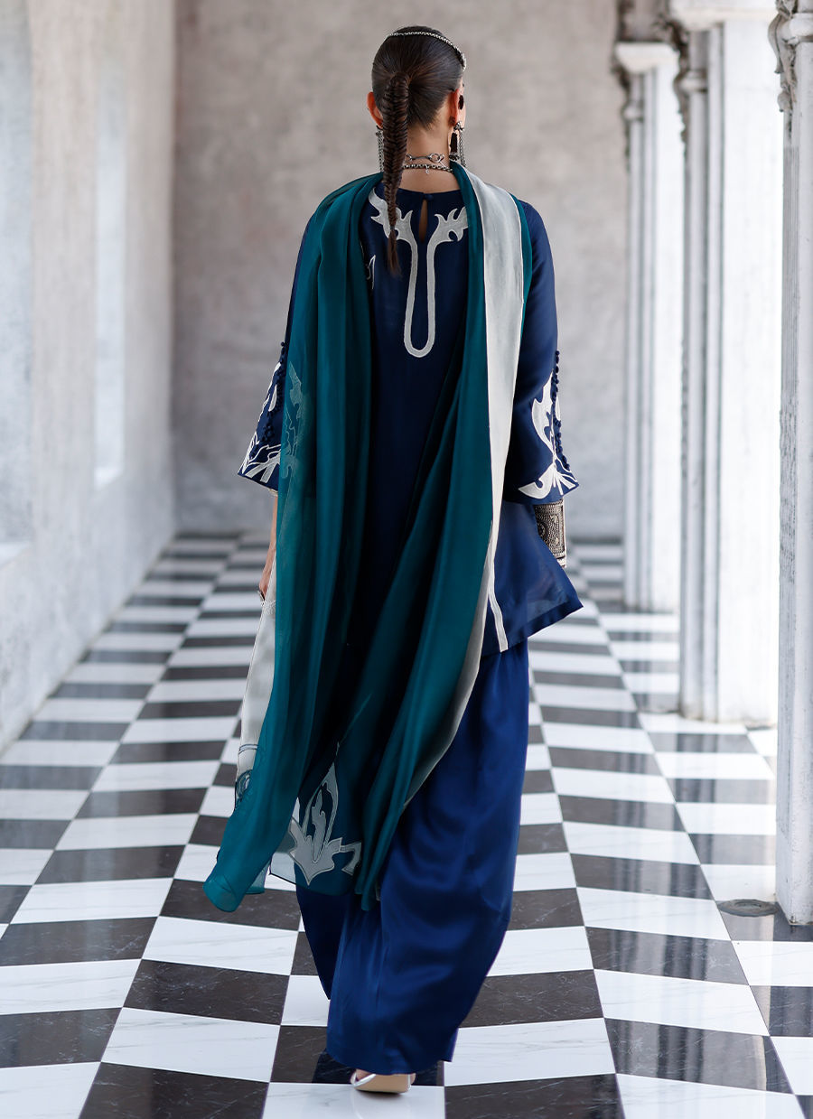 The deep blue short shirt, crafted from butter silk, features intricate self 3D detailing with appliqué work and resham embroidery across the front, back, and sleeves, creating a richly textured and refined look. It is paired with fluid cotton charmeuse balloon pants for effortless elegance, and completed with a sea green shisha organza dupatta adorned with appliqué work and resham embroidery, adding a graceful and elevated finish. Color customization is available.