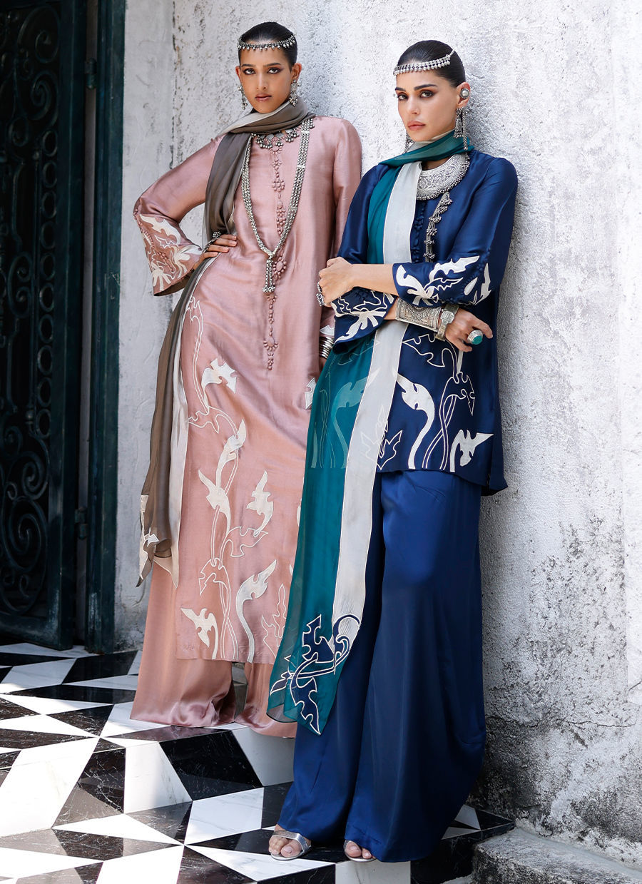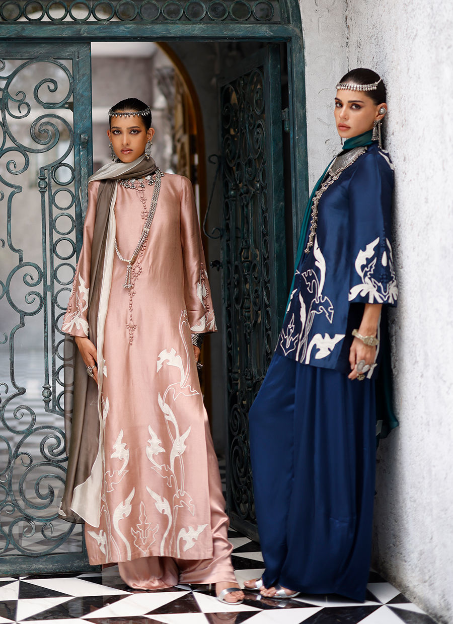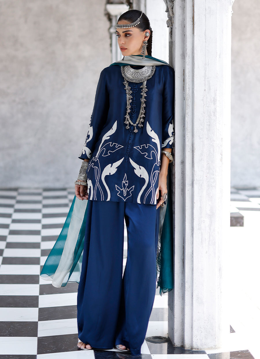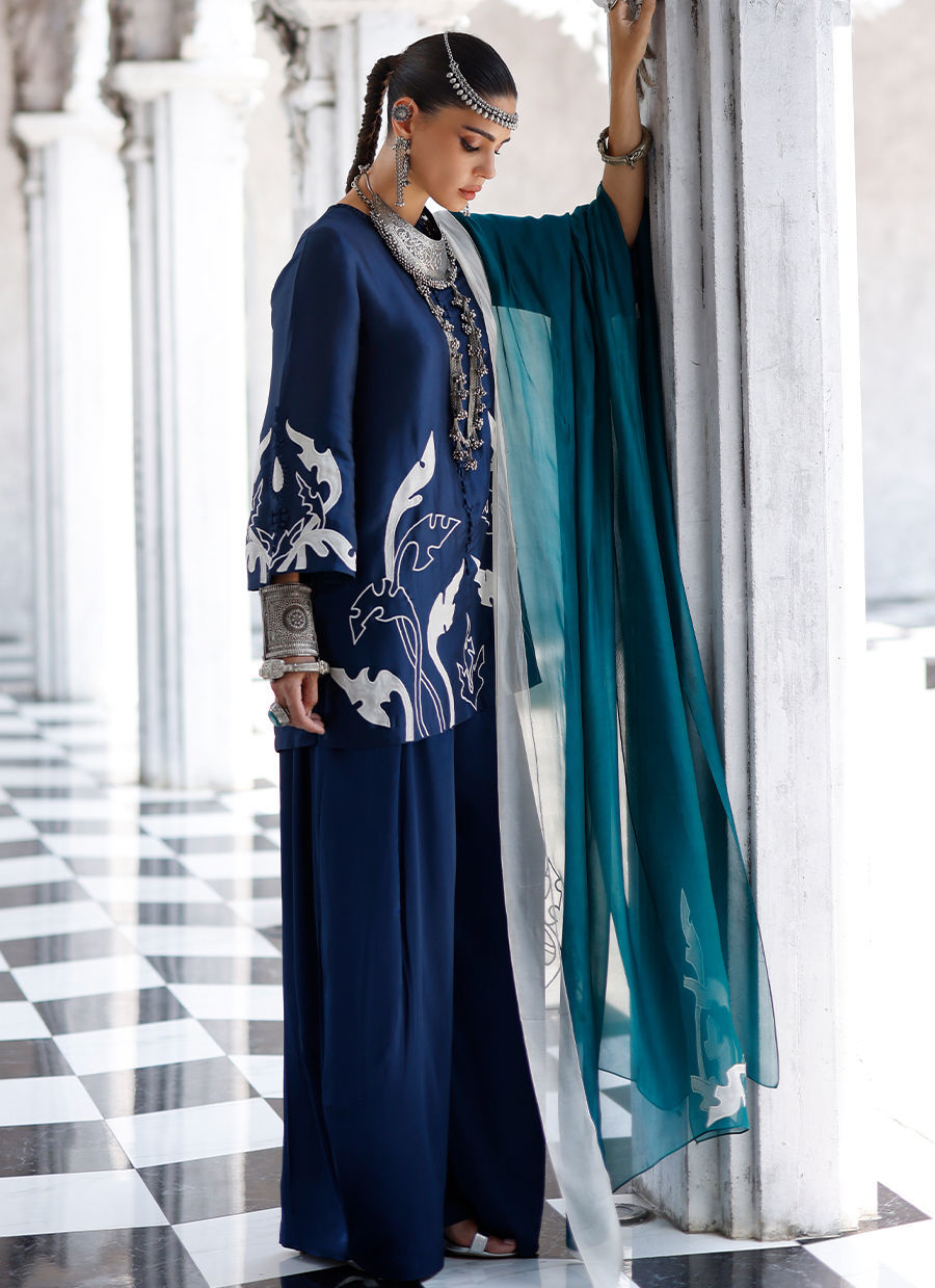 The deep blue short shirt, crafted from butter silk, features intricate self 3D detailing with appliqué work and resham embroidery across the front, back, and sleeves, creating a richly textured and refined look. It is paired with fluid cotton charmeuse balloon pants for effortless elegance, and completed with a sea green shisha organza dupatta adorned with appliqué work and resham embroidery, adding a graceful and elevated finish. Color customization is available.