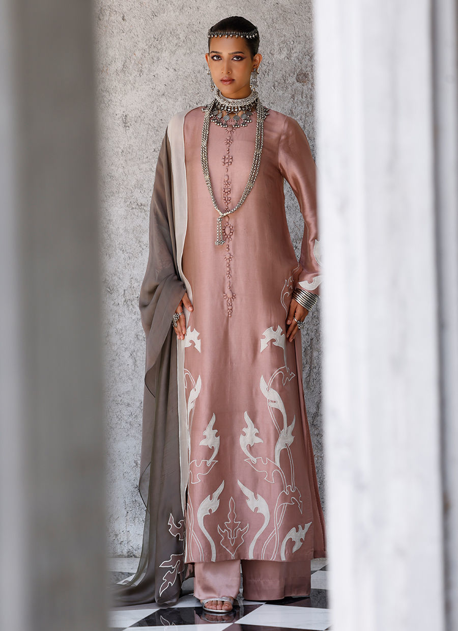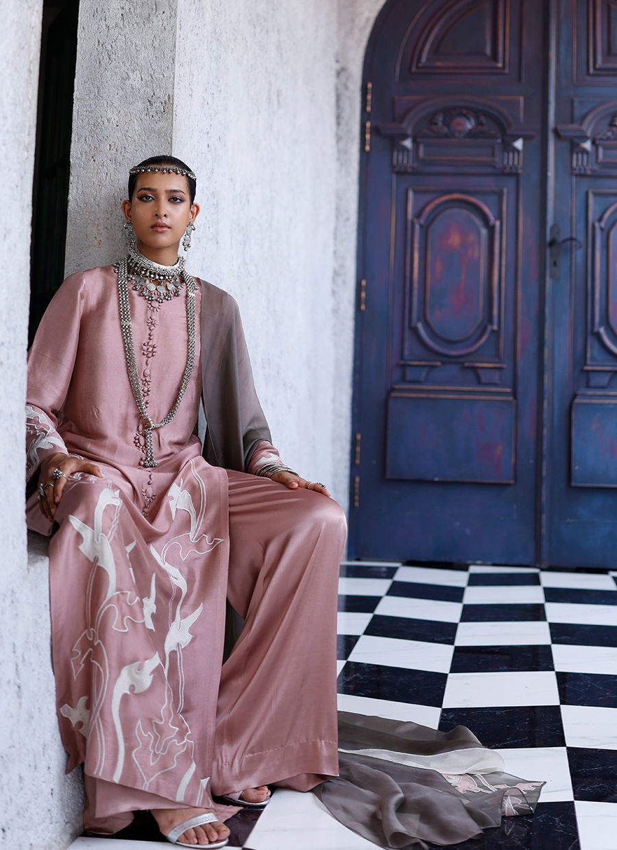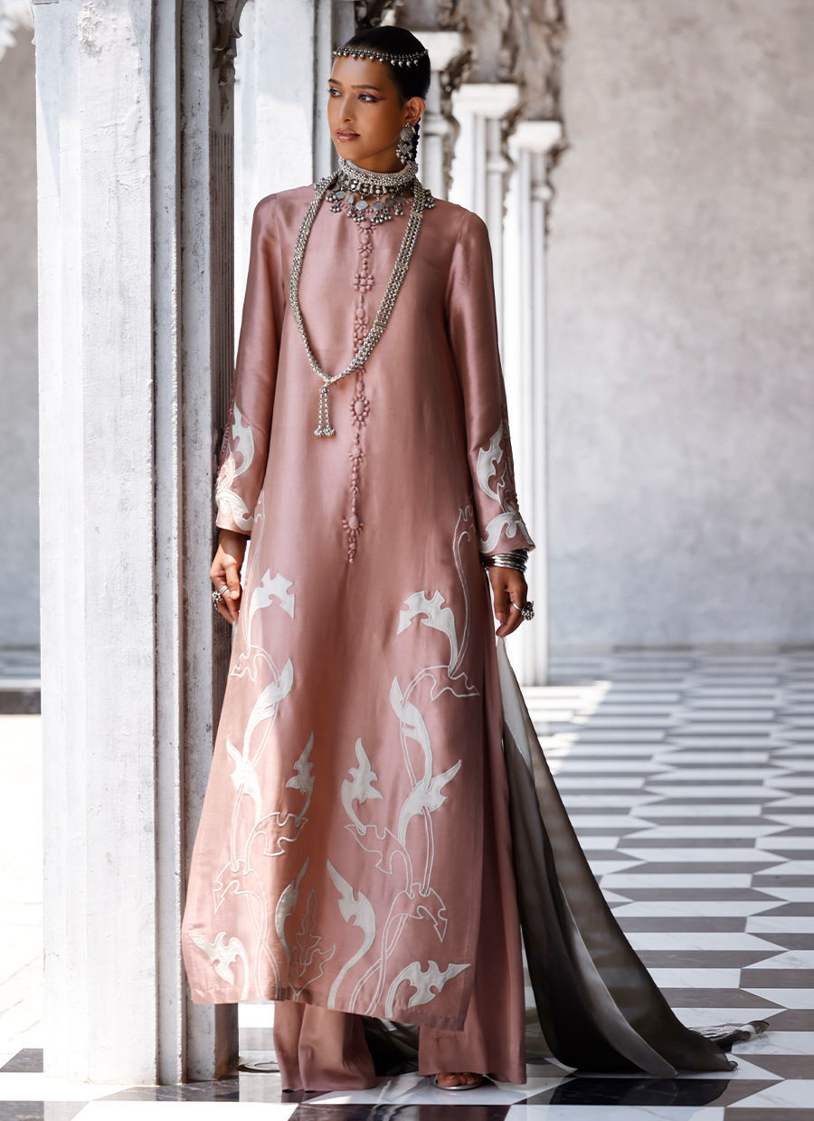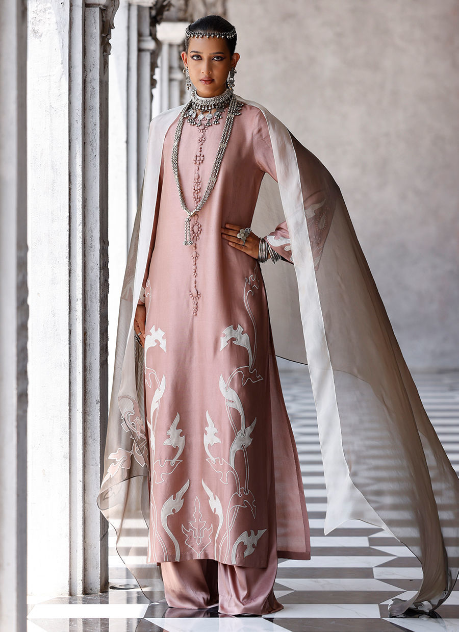 Color: Adobe Rose Fabric: Shirt: Butter Silk, Culottes: Cotton Charmeuse, Dupatta: Shisha Organza Work Details: Embellished