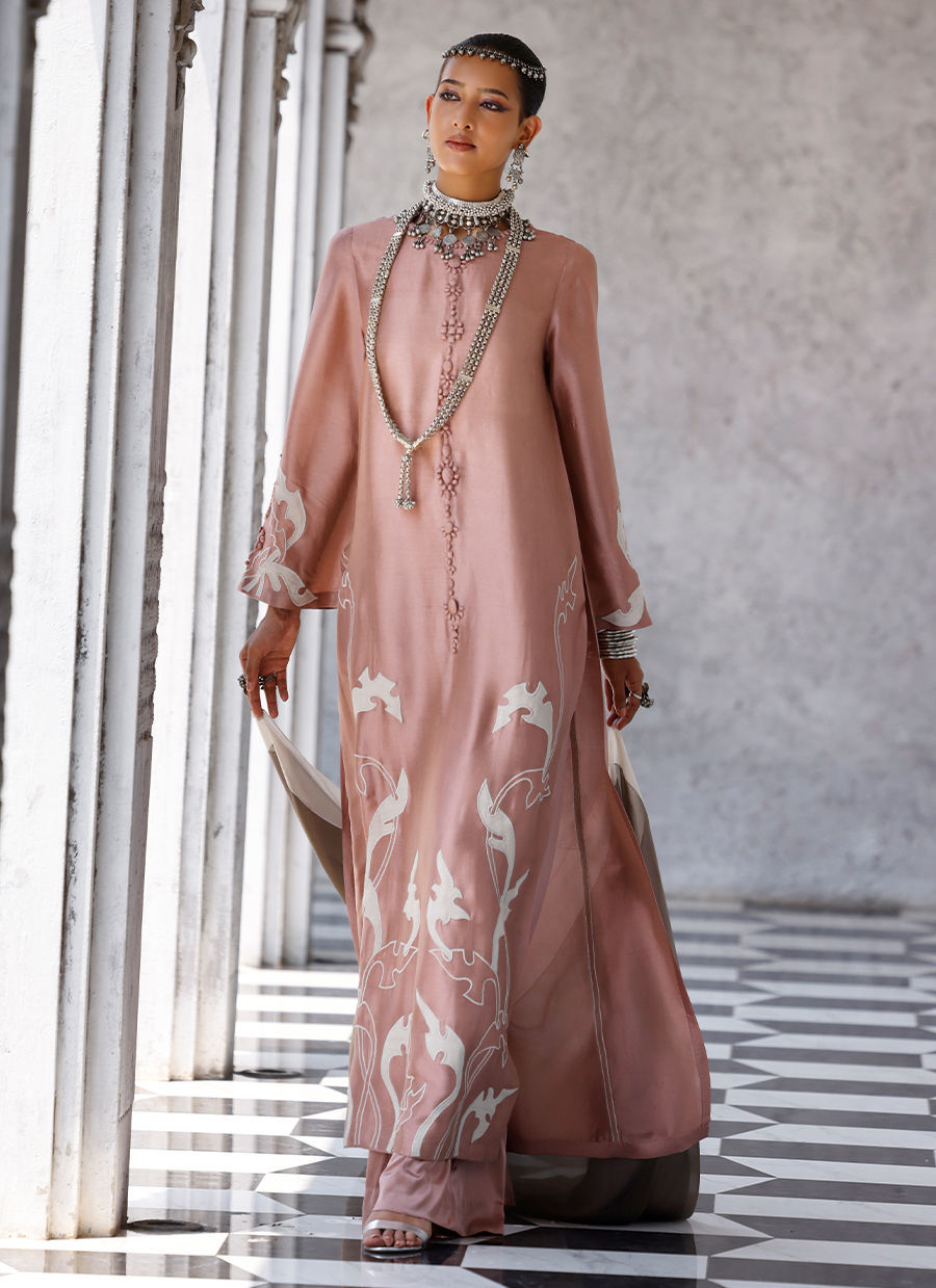 An adobe rose butter silk long shirt with high slits, adorned with self 3D, appliqué work, and resham embroidery on the front, back, and sleeves, paired with cotton charmeuse culottes and a walnut Shisha organza dupatta featuring appliqué work and resham embroidery. Color customization is available.