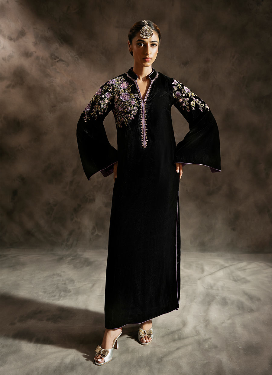 A classic black velvet straight shirt features contrasting lilac embroidery and intricate embellishments around the neckline, accentuating its elegance. The shirt is further enhanced by exquisite hand-embellished details and signature Zainab Salman sleeves, adding a touch of sophistication. It is paired with matching straight pants, and the look is completed with a lilac crushed dupatta, creating a harmonious and refined look. Shirt Length: 52 Shirt Type Slim Fit Model Height:5'6