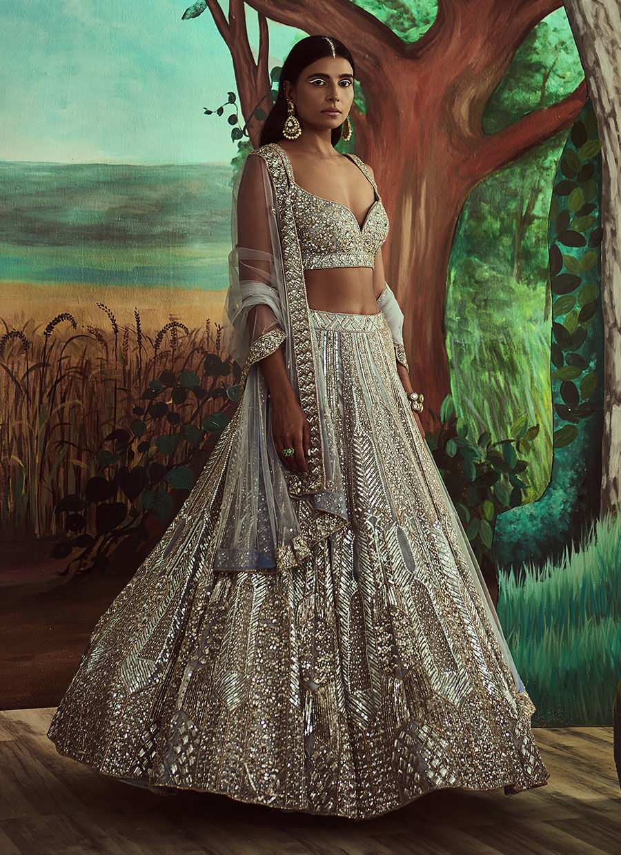 Steel Grey Organza Lehenga Set Hand Embroidered With Rose Gold andAmp; Silver Cutdana, 3D Sequins And Crystals. Lehenga -Organza Blouse - Organza Dupatta - Net