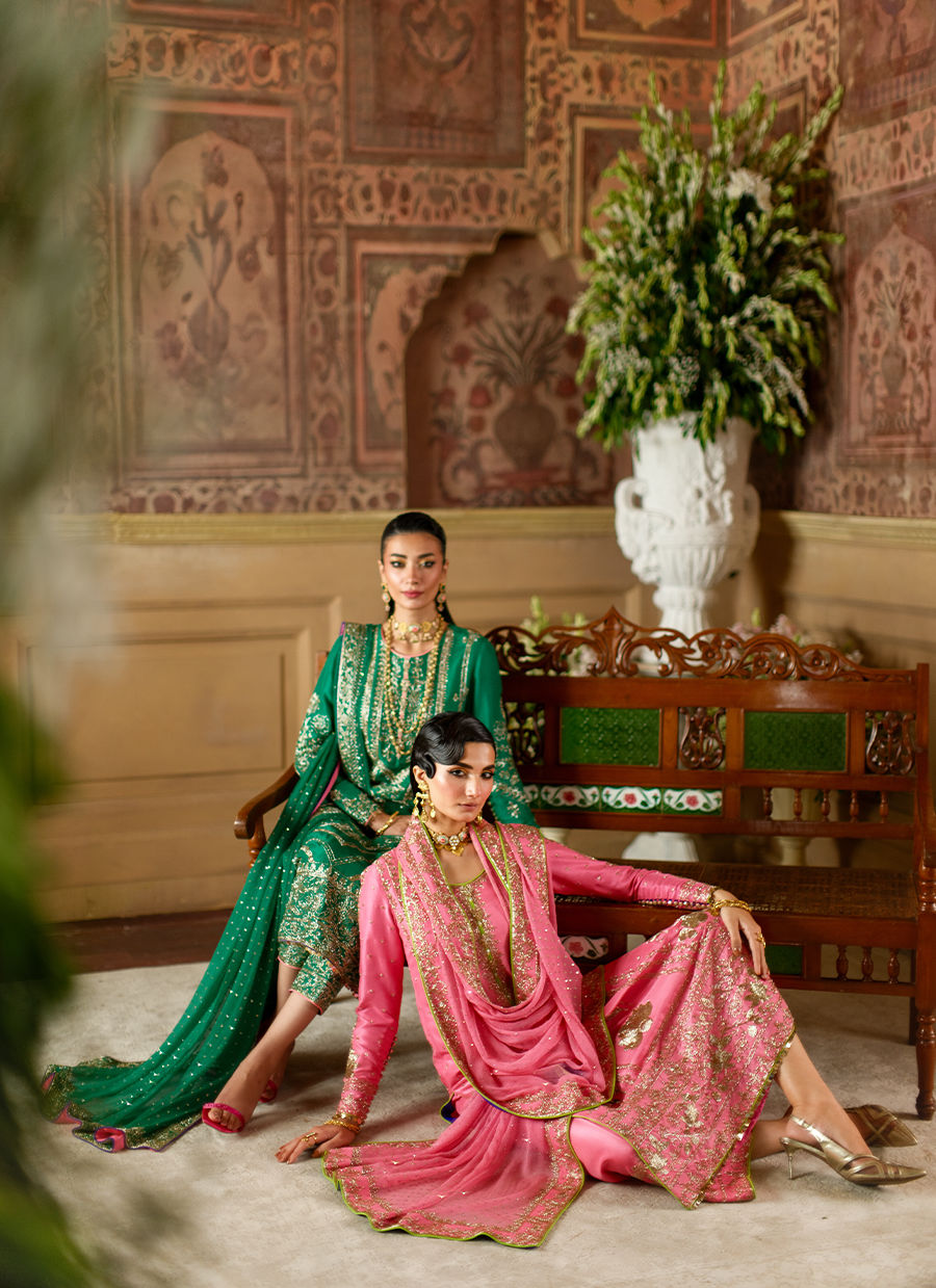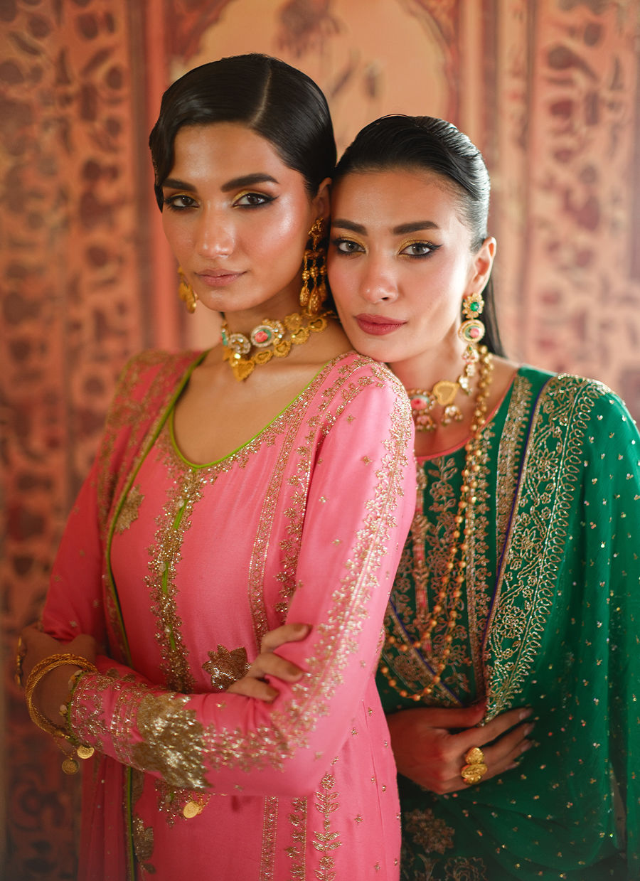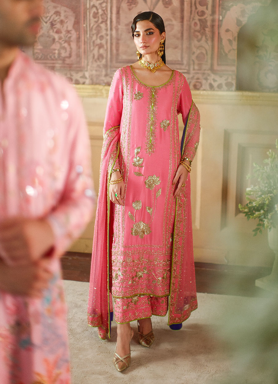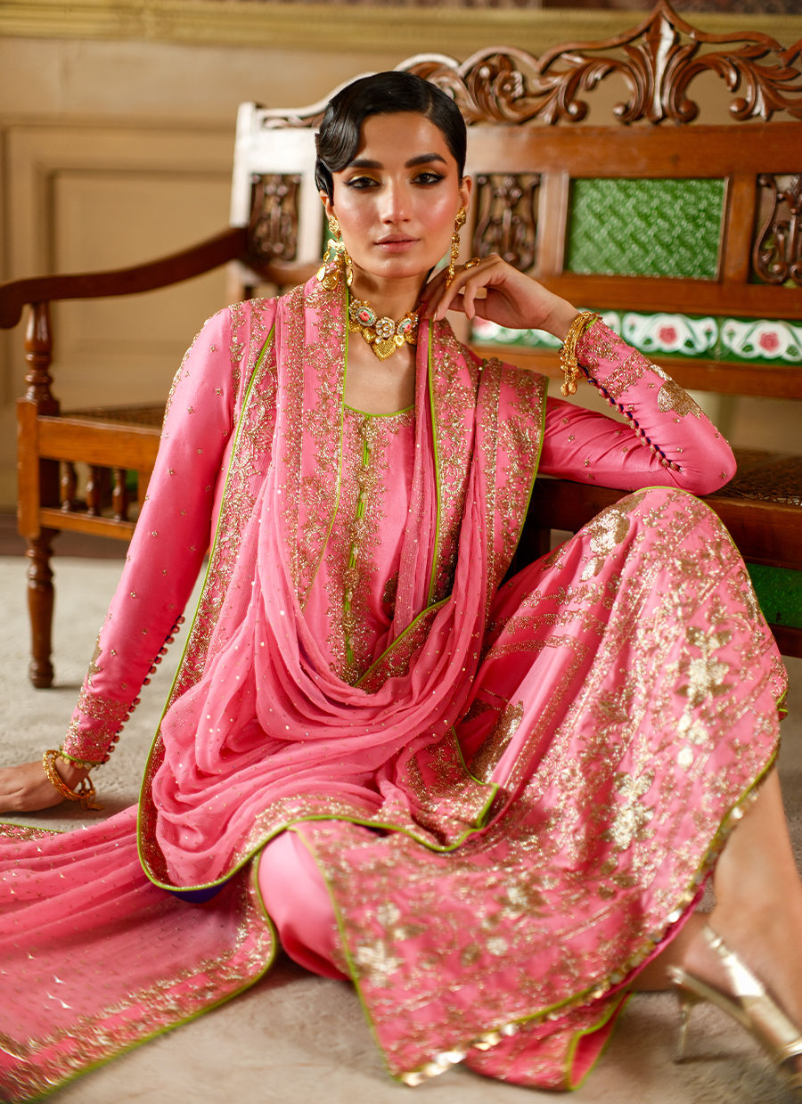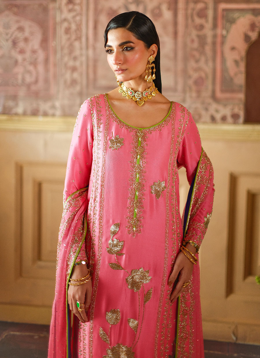 This candy pink silk long shirt is embellished with rich gold cutdaana florals, adding a refined shimmer to its elegant silhouette.