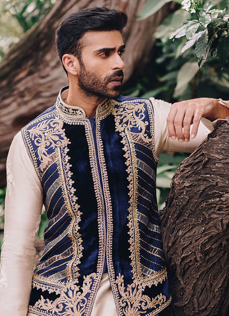 Ali wears a midnight blue raw silk waistcoat embroidered heavily with hand using tila, marori and resham. It is completed with chatta patti and velvet applique.