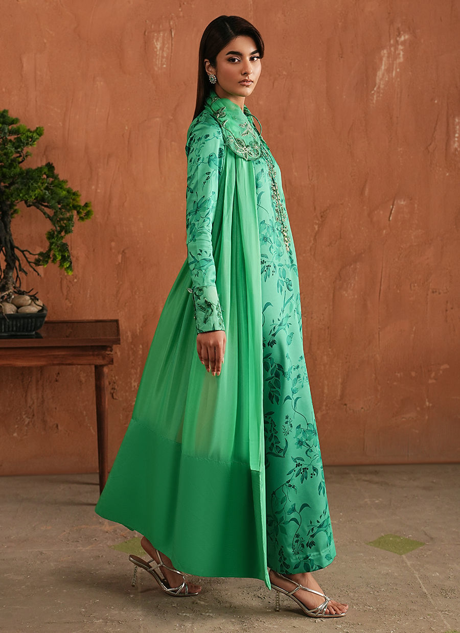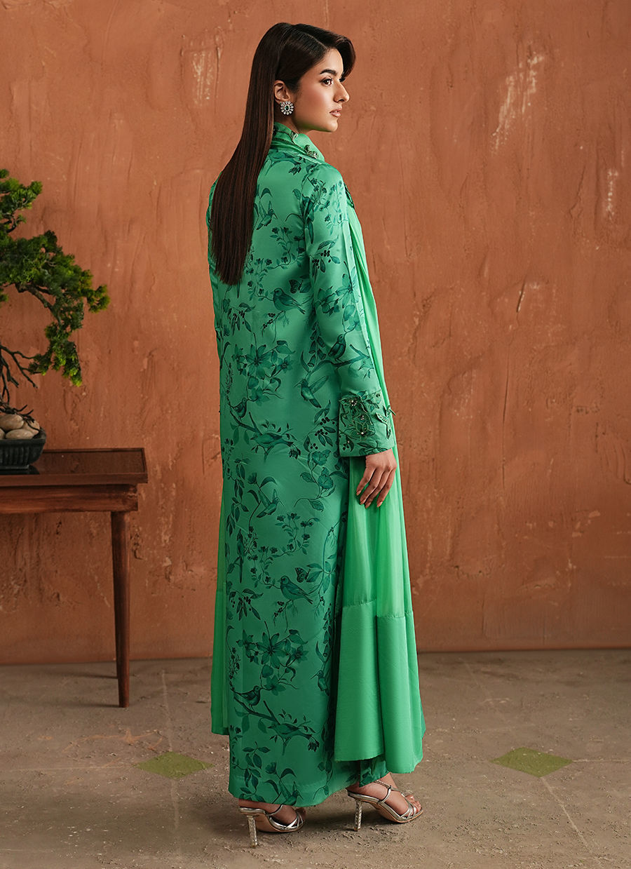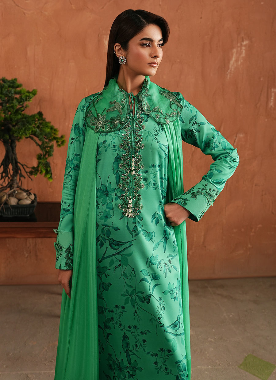 The collar sets a confident foundation, followed by a neckline finished with intricate handwork that defines the look. Subtle detailing along the sleeves adds depth to the green printed Shamoze Silk shirt, paired with straight trousers for a clean, balanced silhouette. Finished with a plain medium silk dupatta, Syla stands out as a key piece for Ramadan evenings that call for refinement, craftsmanship, and quiet confidence.