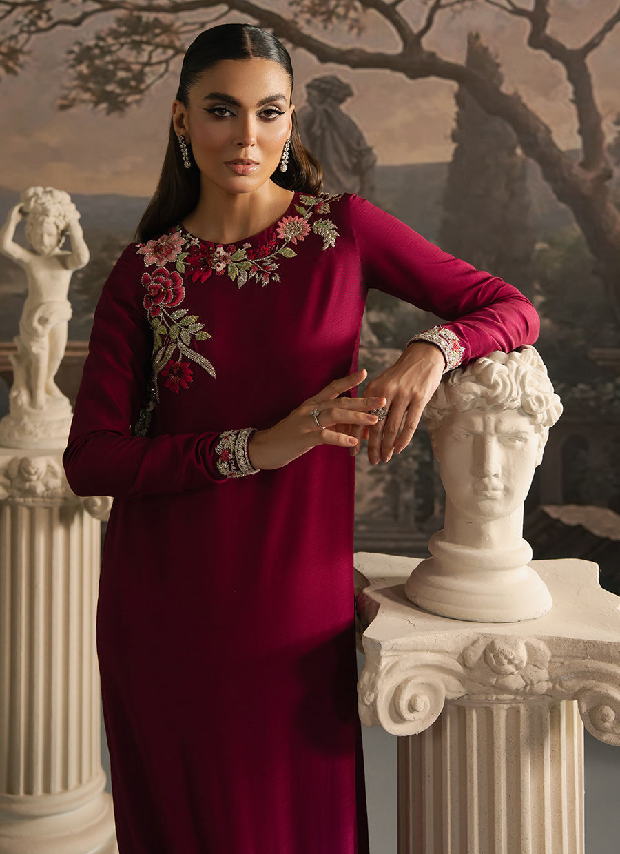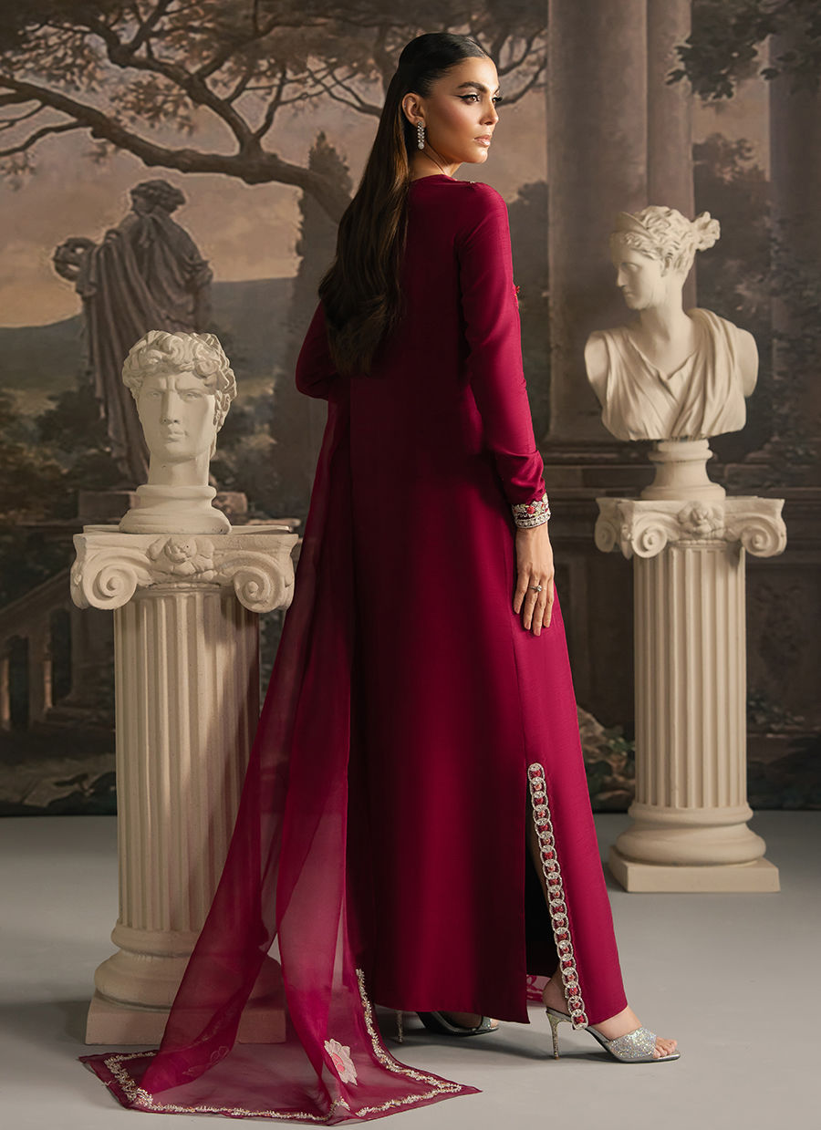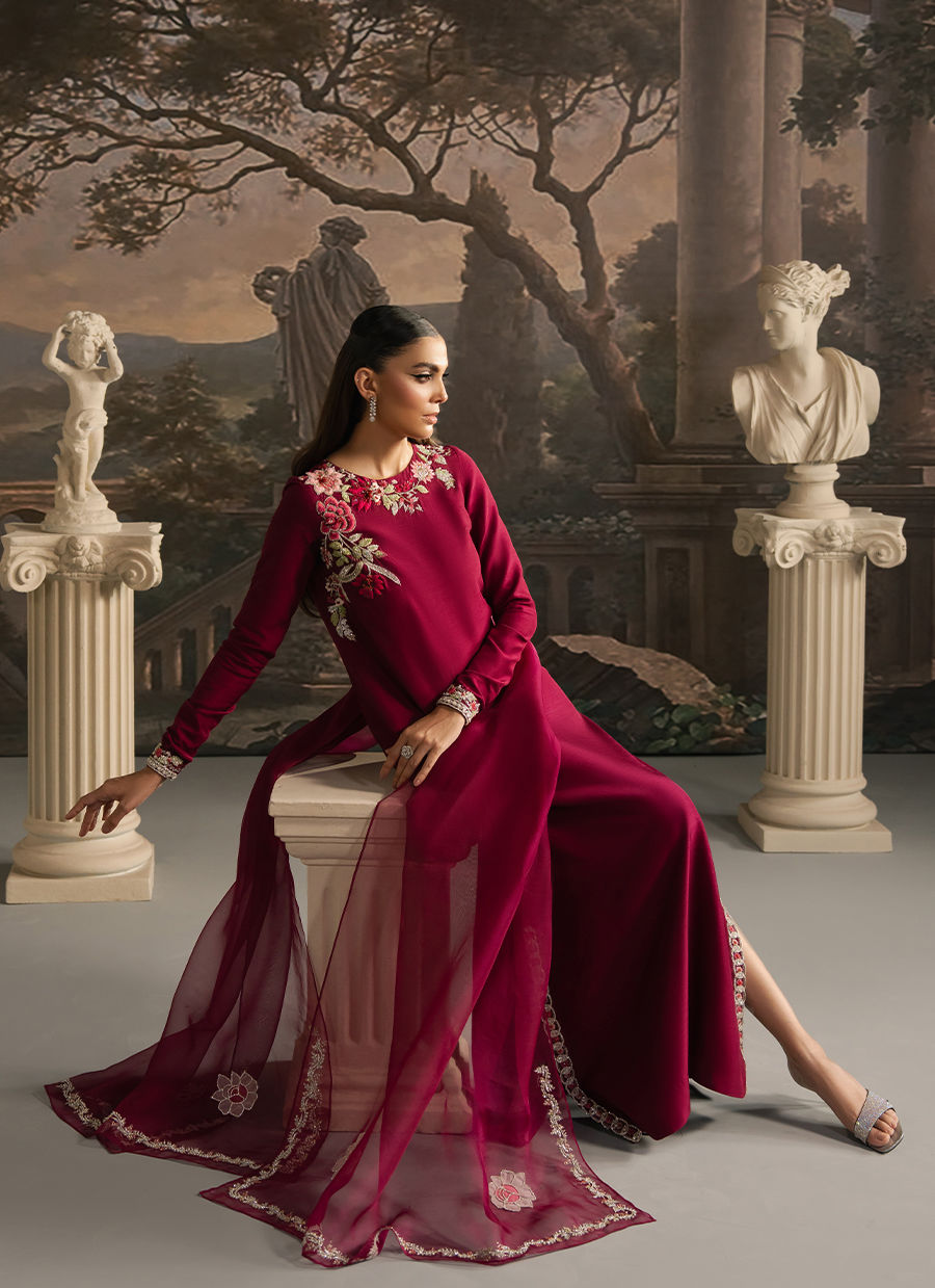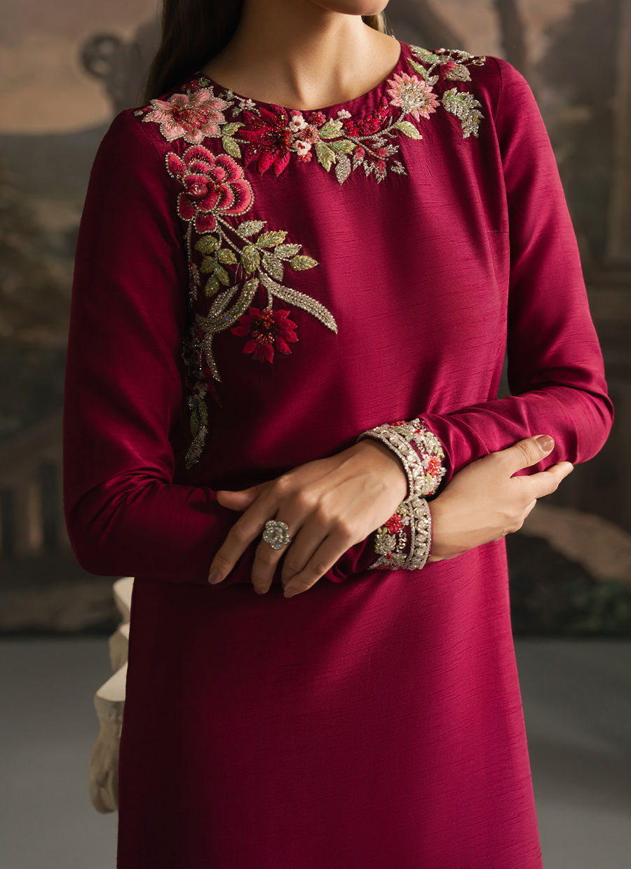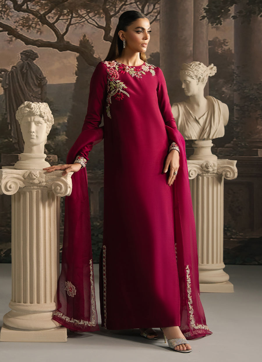 Syrah In a striking deep pink, Syrah a long, sleek straight shirt with refined detailing on the neckline, sleeves, and side slits, paired with cigarette pants for a clean, modern silhouette. The look is completed with a graceful organza dupatta, delicately worked on its short pallus, bringing together elegance and sophistication with effortless charm.