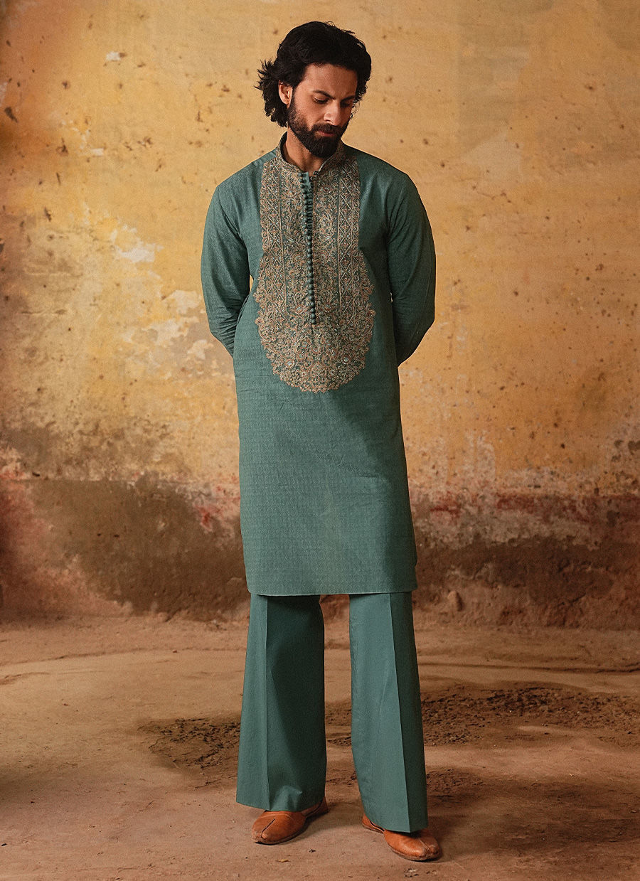 Color: Aqua Green Fabric: Self Cotton (Jaycard) - Kurta, Cotton Lawn - Trouser Work Details: Anchor Embroidered Neckilne And side Pockets on Kurta